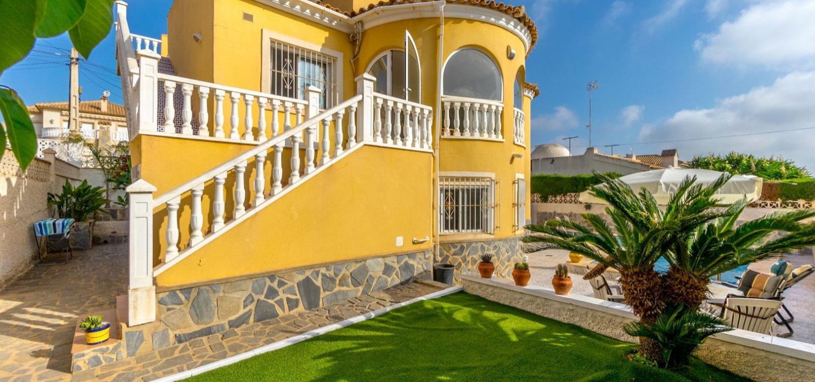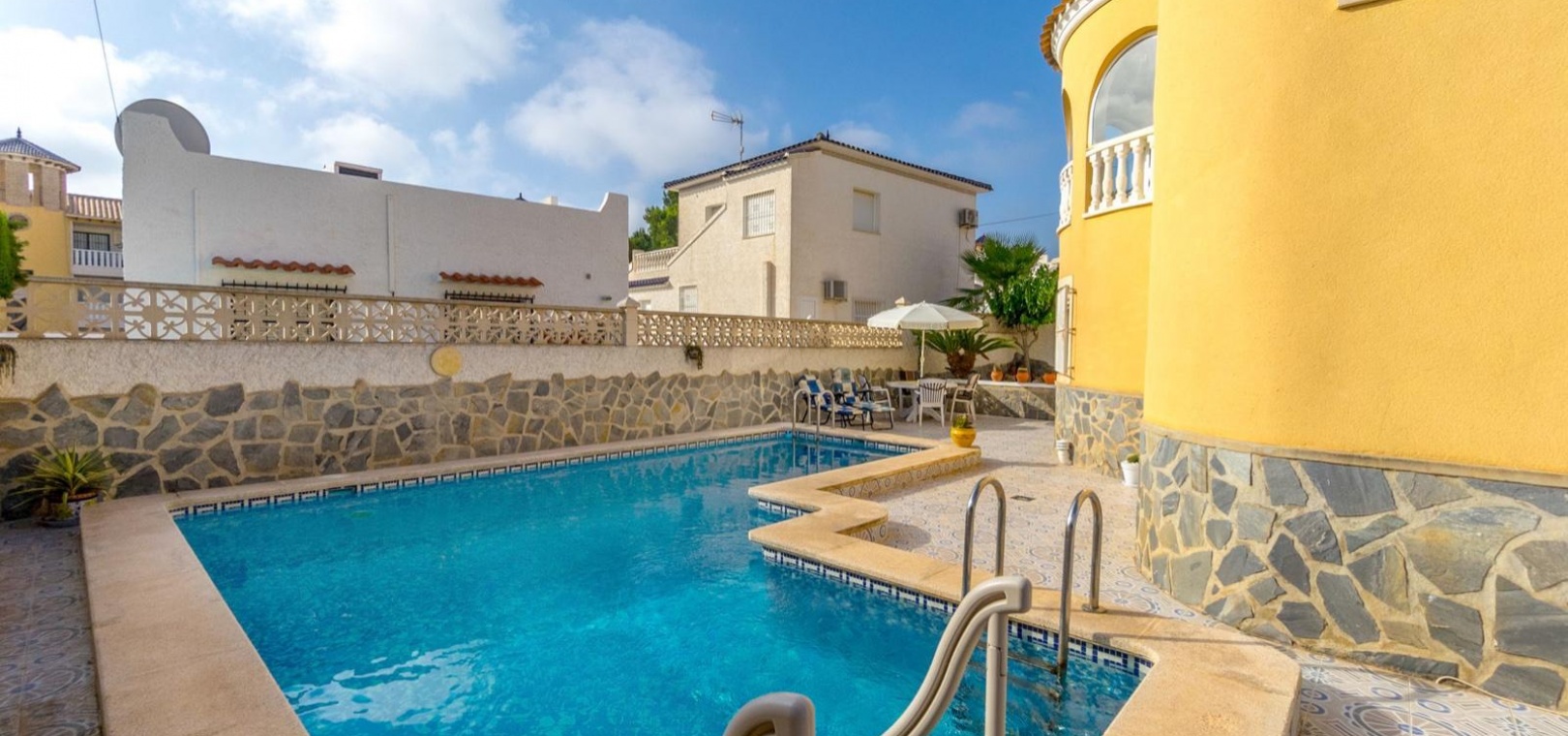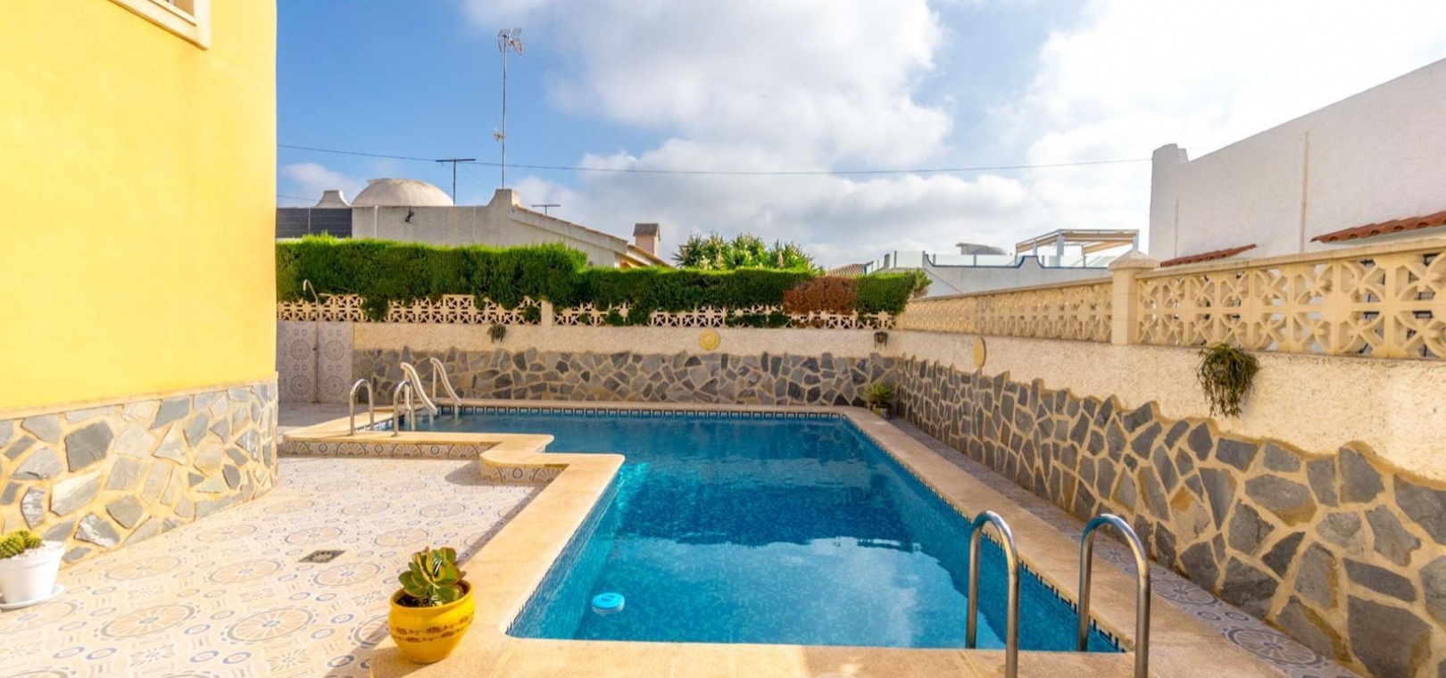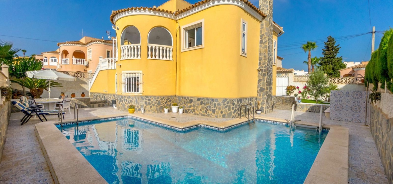 En fristående villa med 3 sovrum och 2 badrum med en separat 1 säng 1 W/C lägenhet och en privat pool belägen i Blue Lagoon, Villamartin, Costa Blanca.