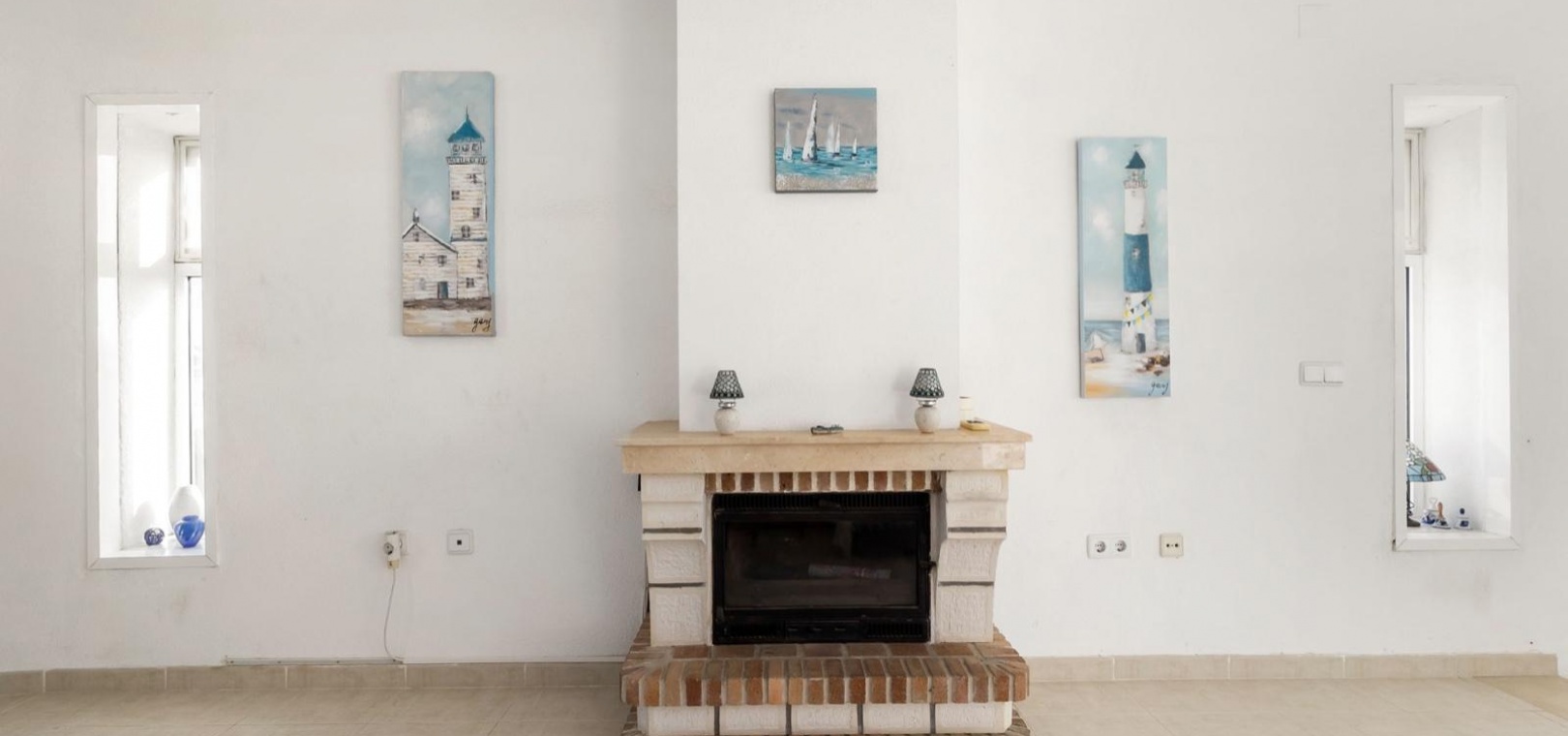 En lounge med en öppen spis, separat kök, 3 x dubbelrum, 2 x badrum och inglasad terrass/matplats på framsidan.