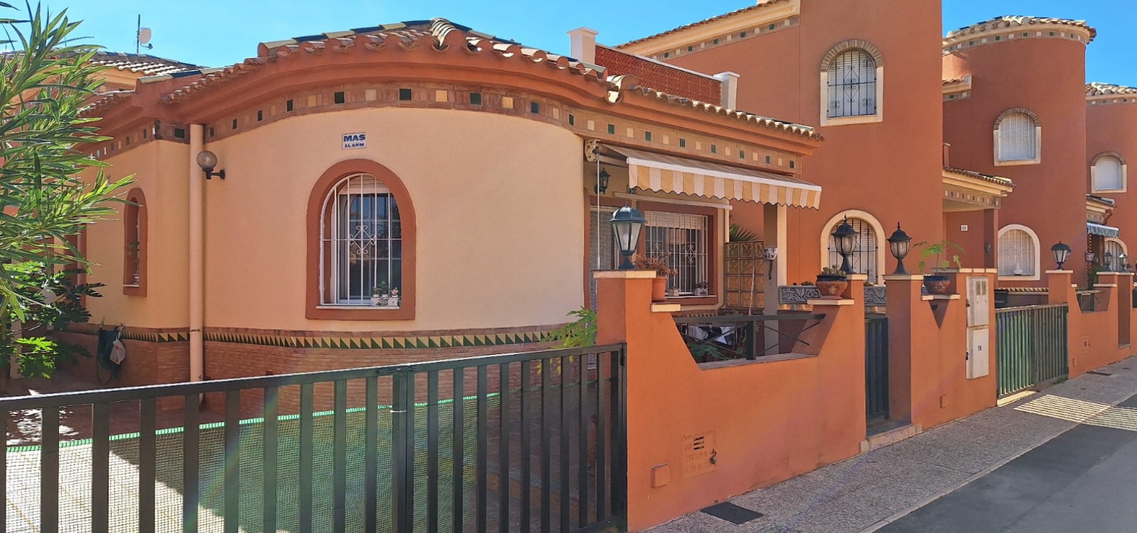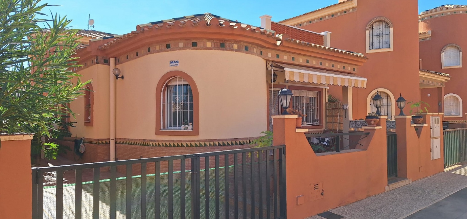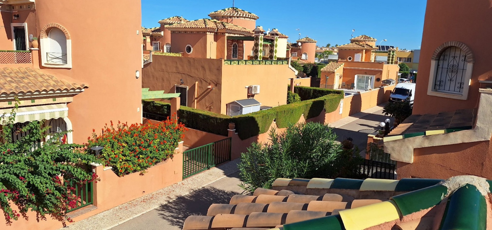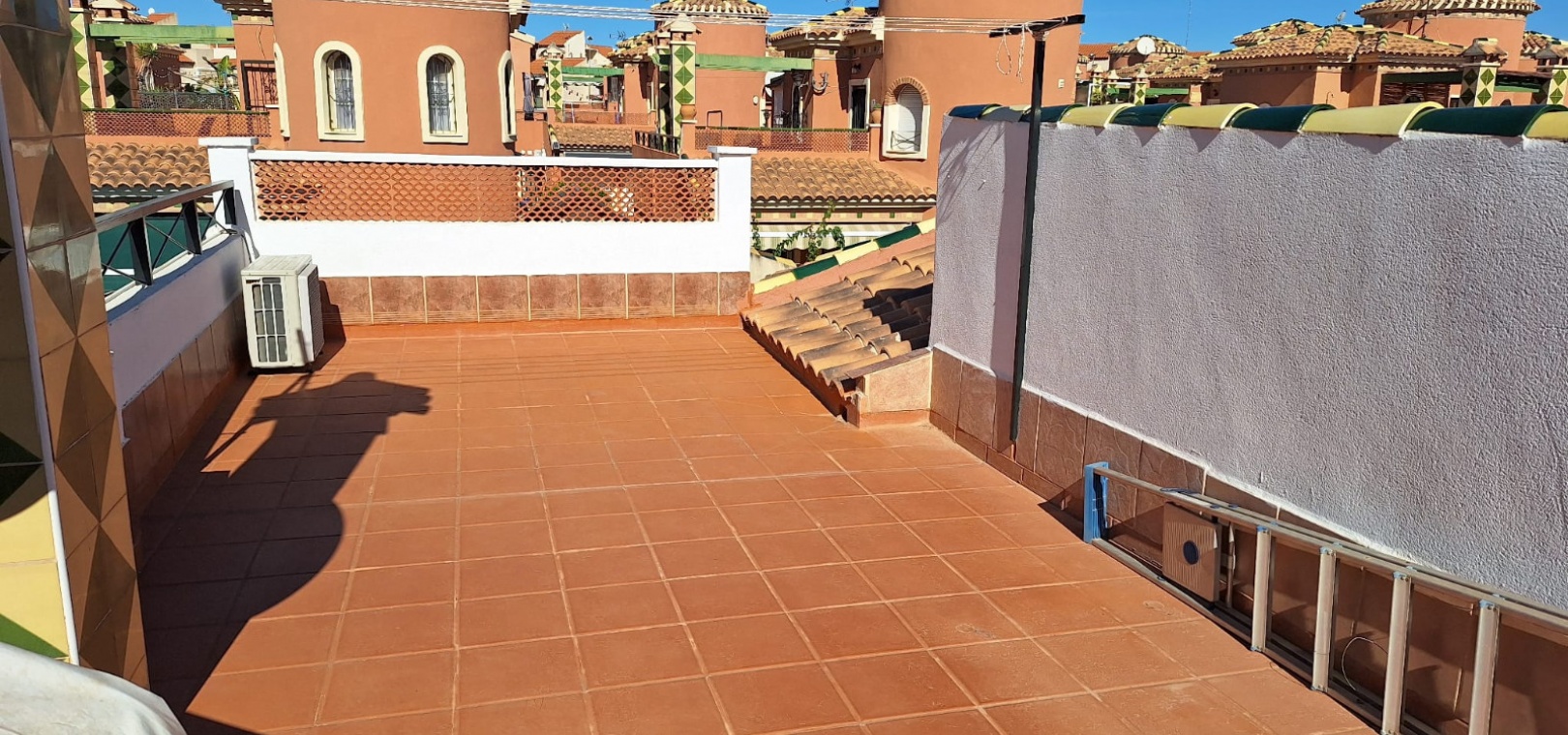 En fristående villa med 2 bäddar och 1 badrum i västerläge med ett privat takterrass i Villas San Luis, Playa Flamenca, Costa Blanca South.