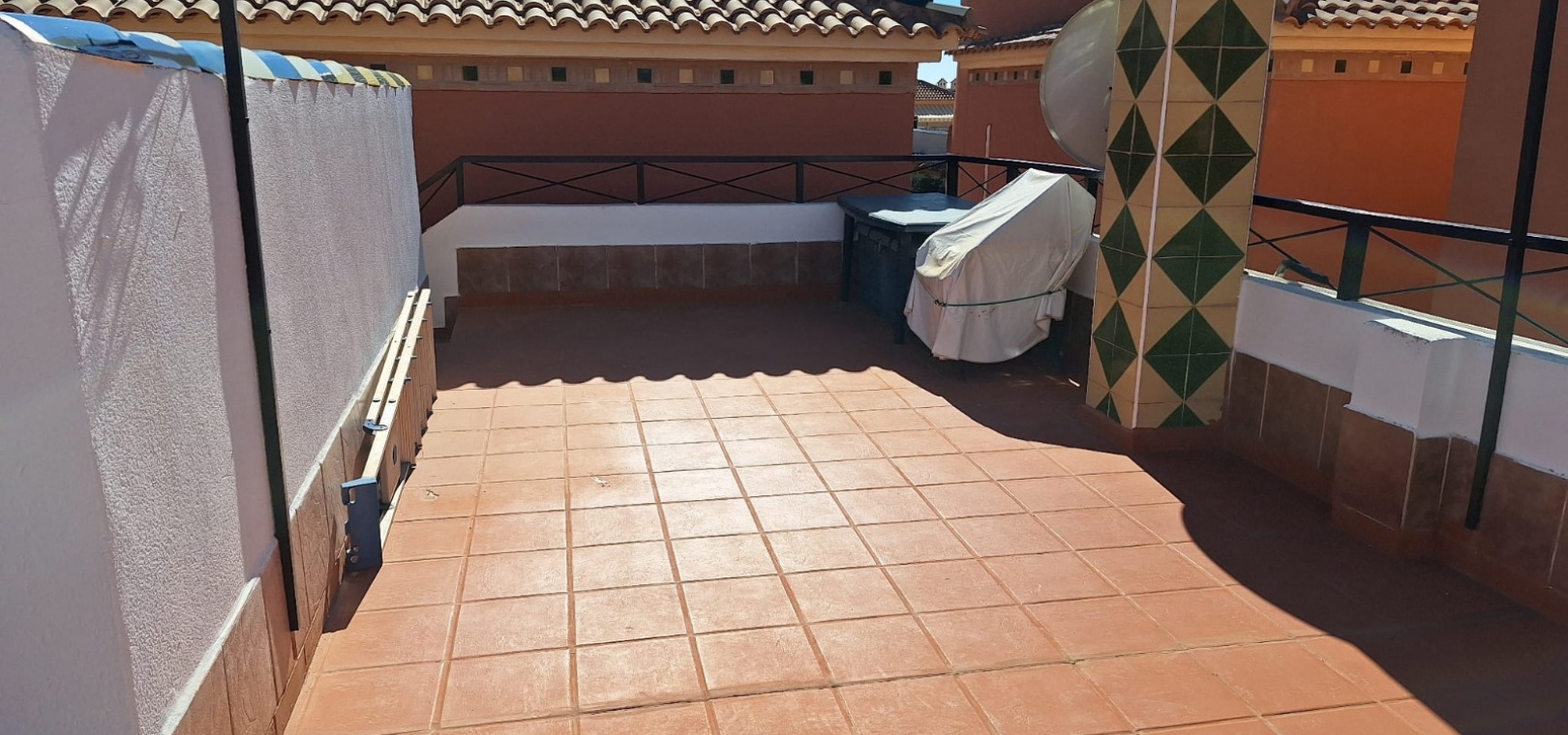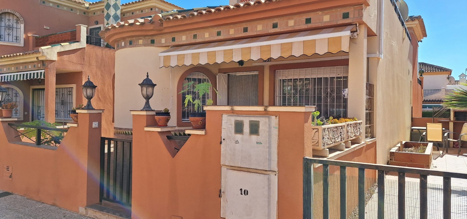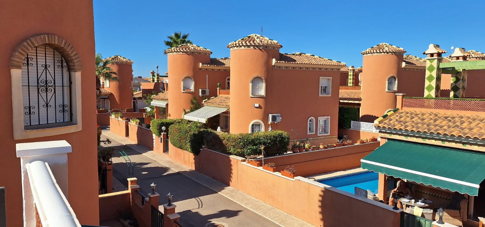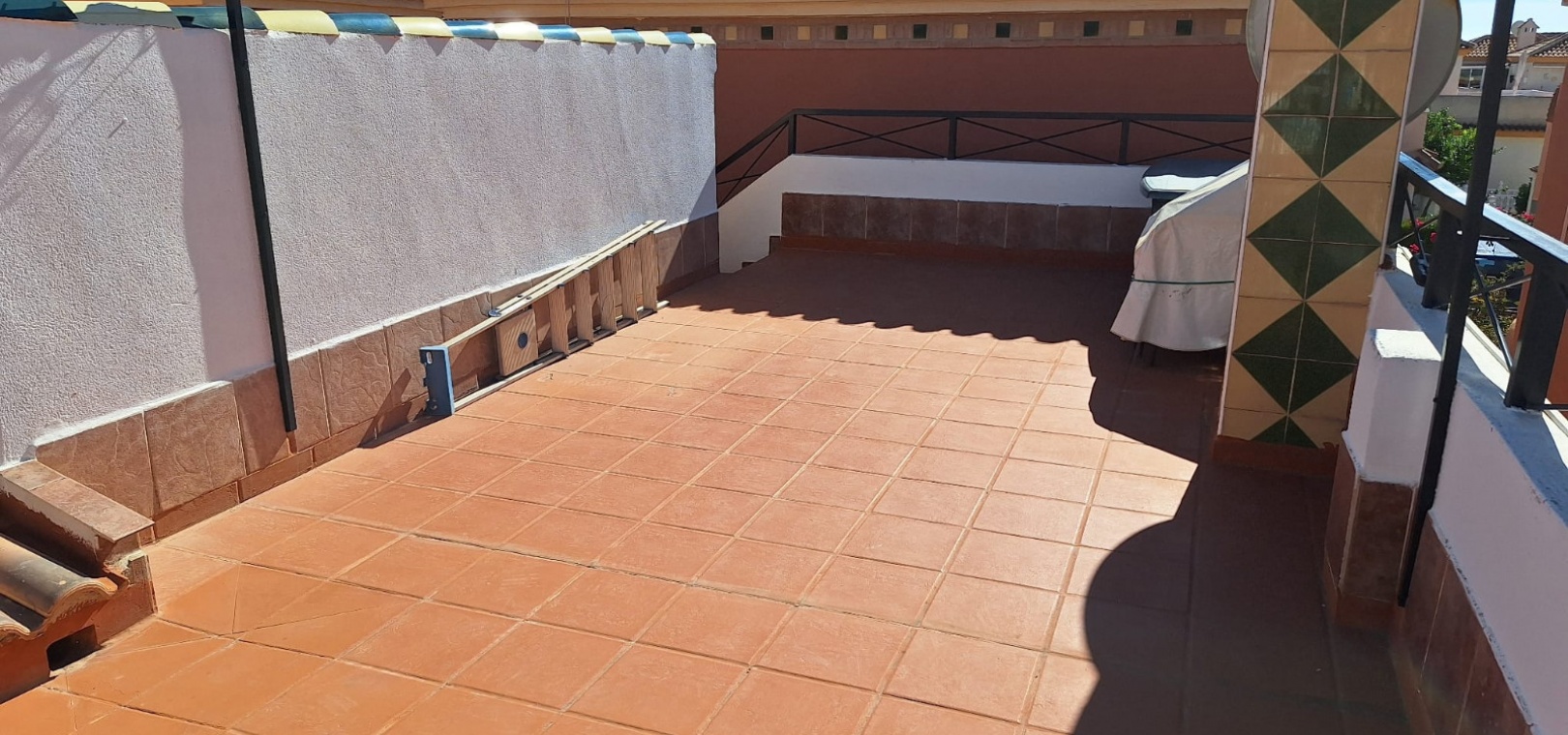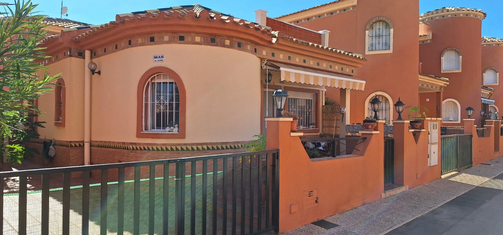 En fristående villa med 2 bäddar och 1 badrum i västerläge med ett privat takterrass i Villas San Luis, Playa Flamenca, Costa Blanca South.