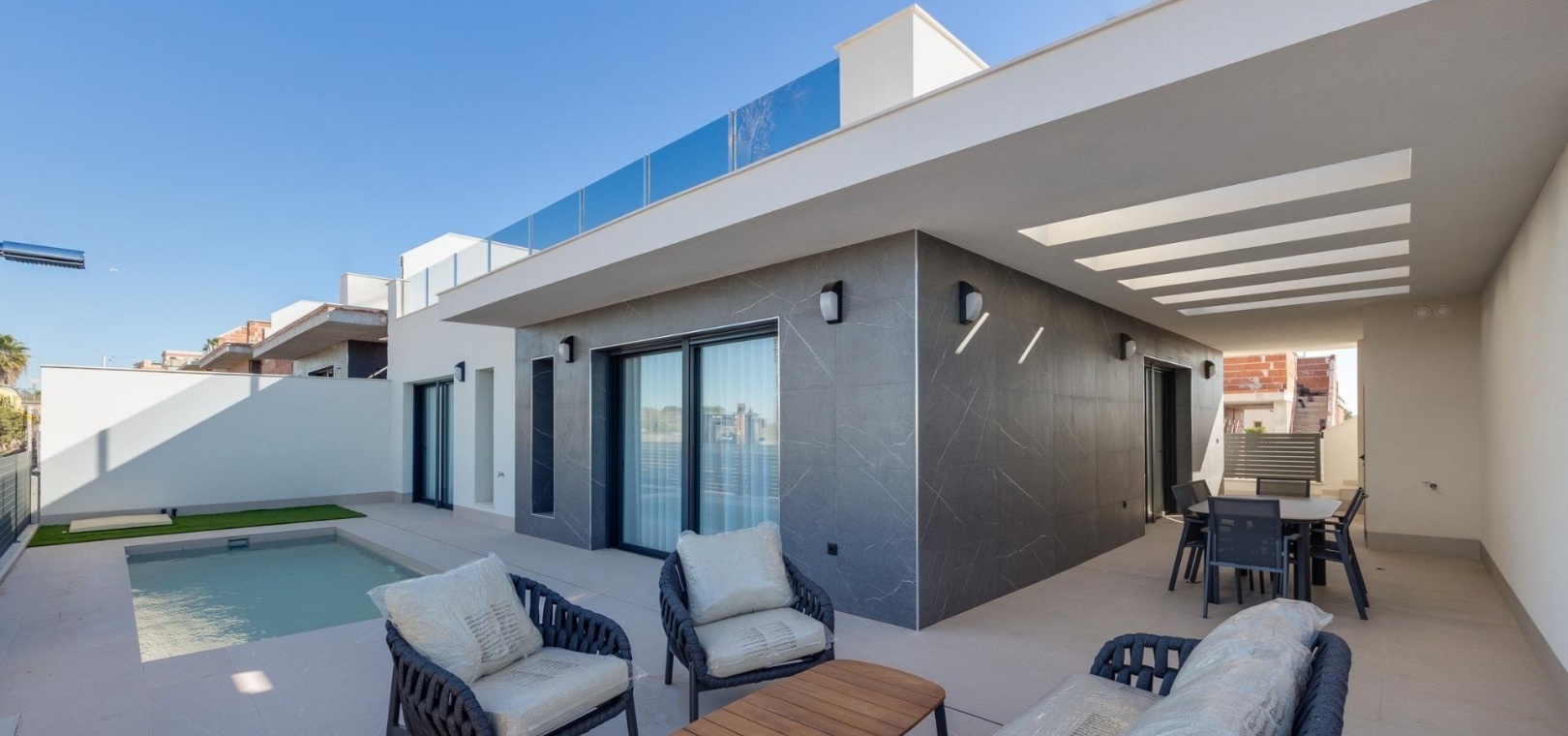 Gå ut till din privata oas, där du kan njuta av lyxen med en privat pool i din egen trädgård. Från takterrassen kan du njuta av den hisnande utsikten över saltlagunen La Mata och det omgivande området och njuta av spektakulära solnedgångar varje kväll. Fastigheten ligger i den högsta delen av Torrevieja, vilket garanterar både integritet och imponerande utsikter.