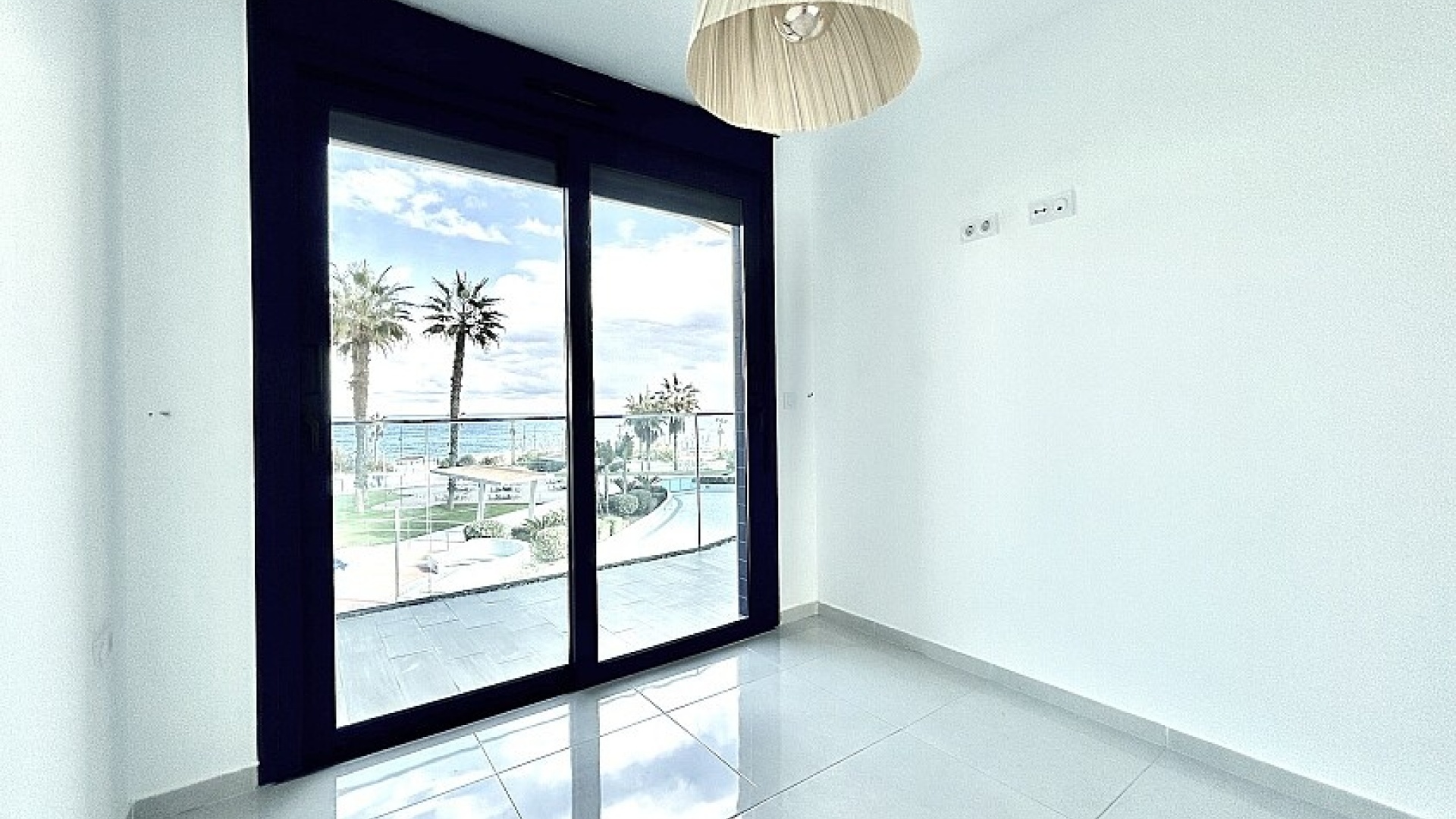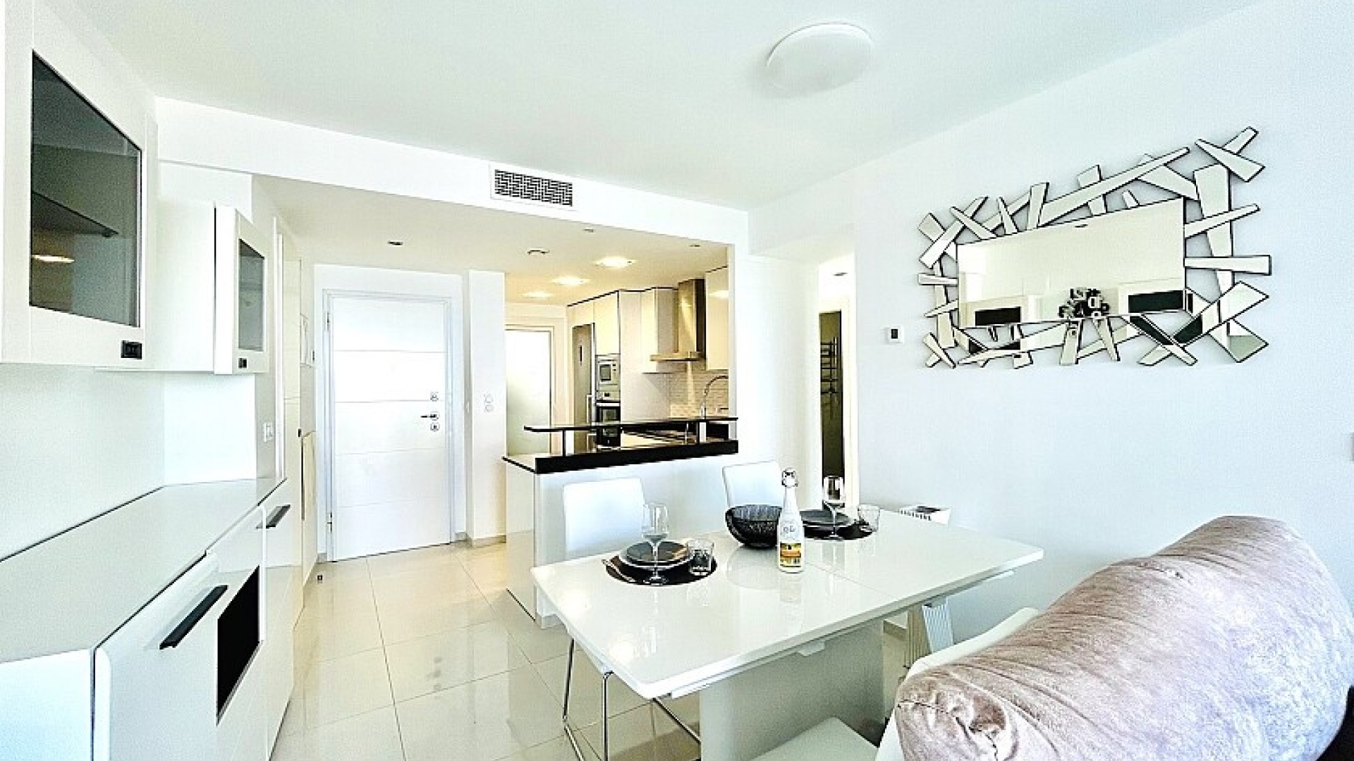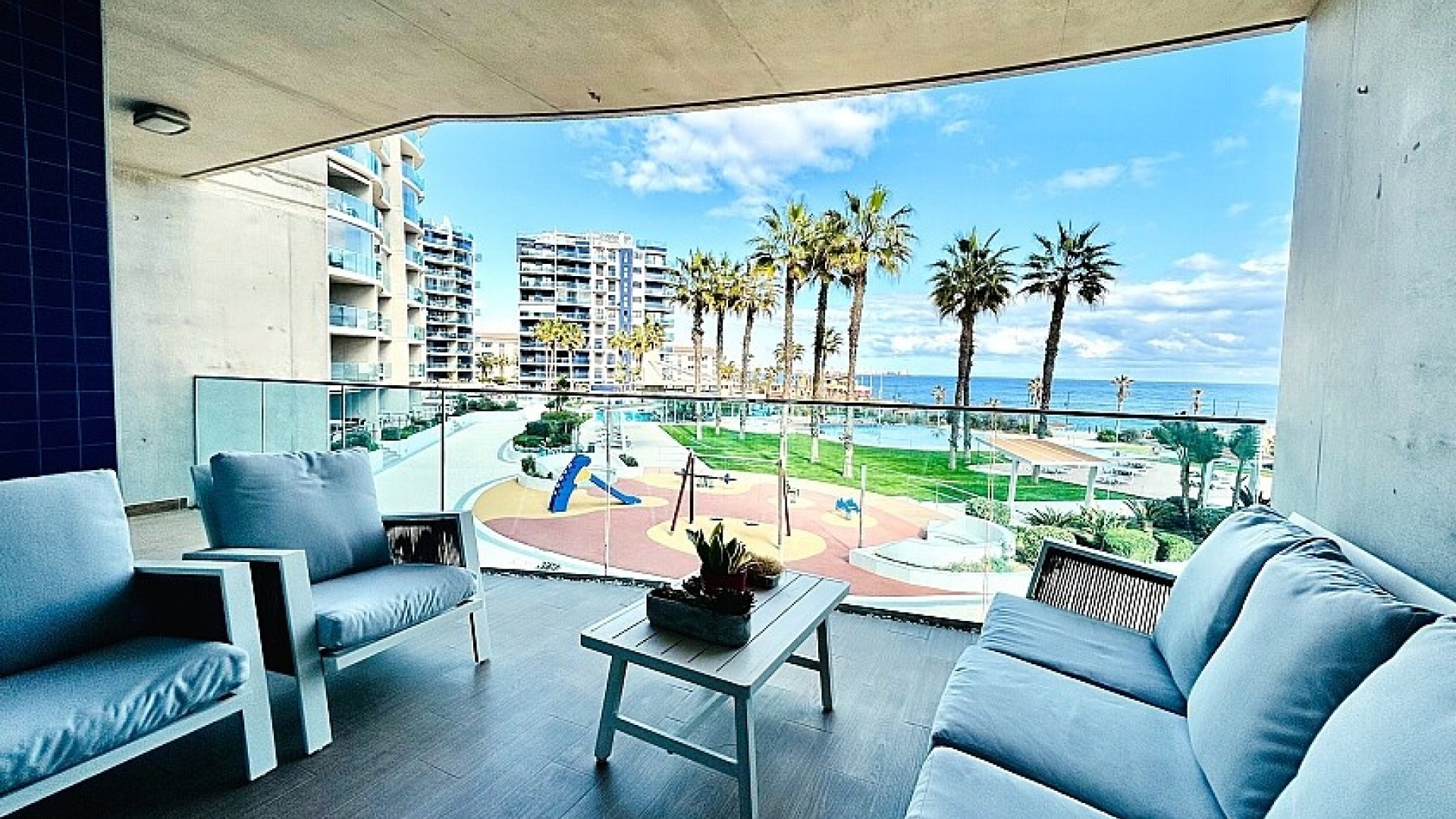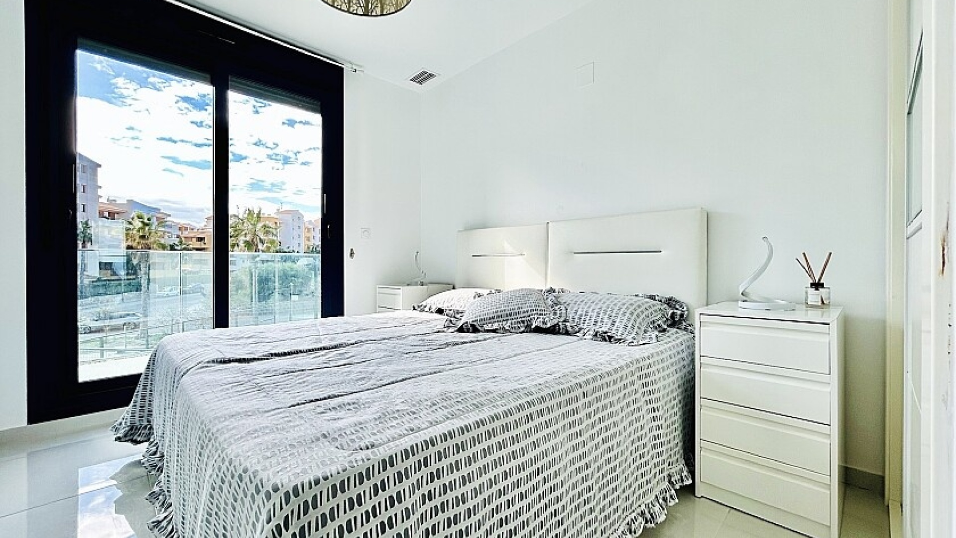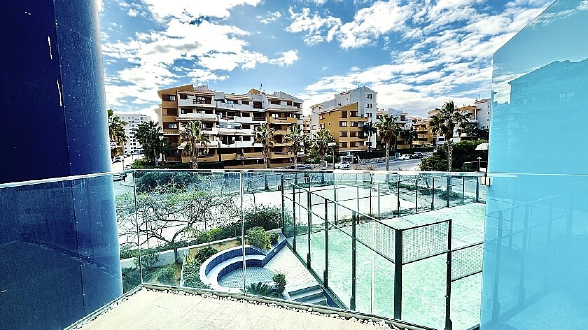 2 sovrum nära havet i Punta Prima. Lyxig lägenhet med 2 sovrum, 2 badrum, vardagsrum/matsal med kök i öppen planlösning, galleri och två terrasser: en stor terrass på framsidan i österläge med spektakulär utsikt över havet, Torrevieja och samhällsområdena med flera pooler, gym, jacuzzi , bastu, barn- och sportytor och ytterligare en terrass i söderläge. Den ligger på 1:a våningen och har även underjordisk parkering och ett förråd. Bara några meters promenad till sandstranden Punta Prima och Cala Ferrís, nära till affärer, restauranger, kaféer, kollektivtrafik och andra tjänster. 5-10 minuters bilresa till Torreviejas centrum, Zenia Boulevard köpcentrum och flera golfbanor i området.