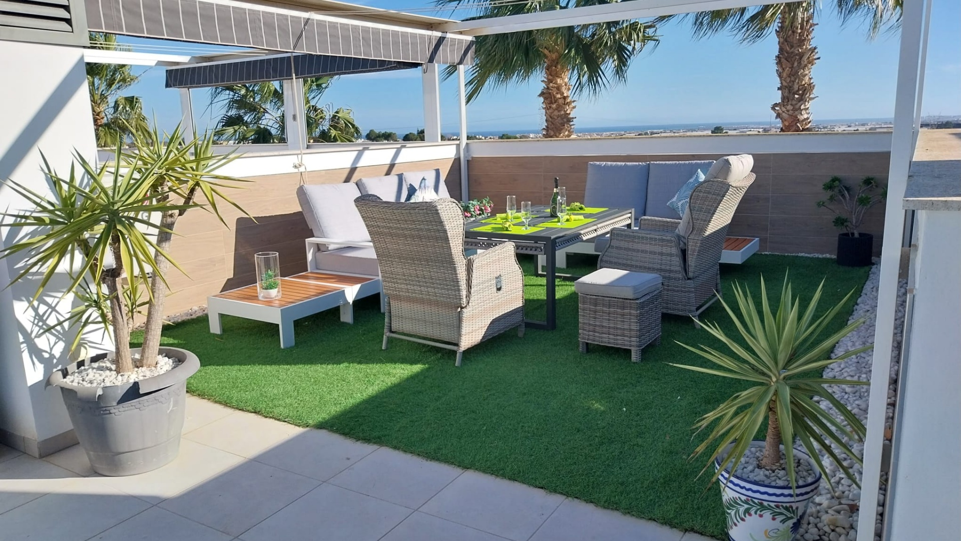 Takvåning i söderläge 2 SOVRUM / 2 BADRUM MÖBLERAD AVLEDNING A/C FANTASTISK UTSIKT ÖVER MAR MENOR STORT SOLARIUM MED HAVSUTSIKT PARKERING UNDERBAR GEMENSAM POOL OCH TRÄDGÅRDAR