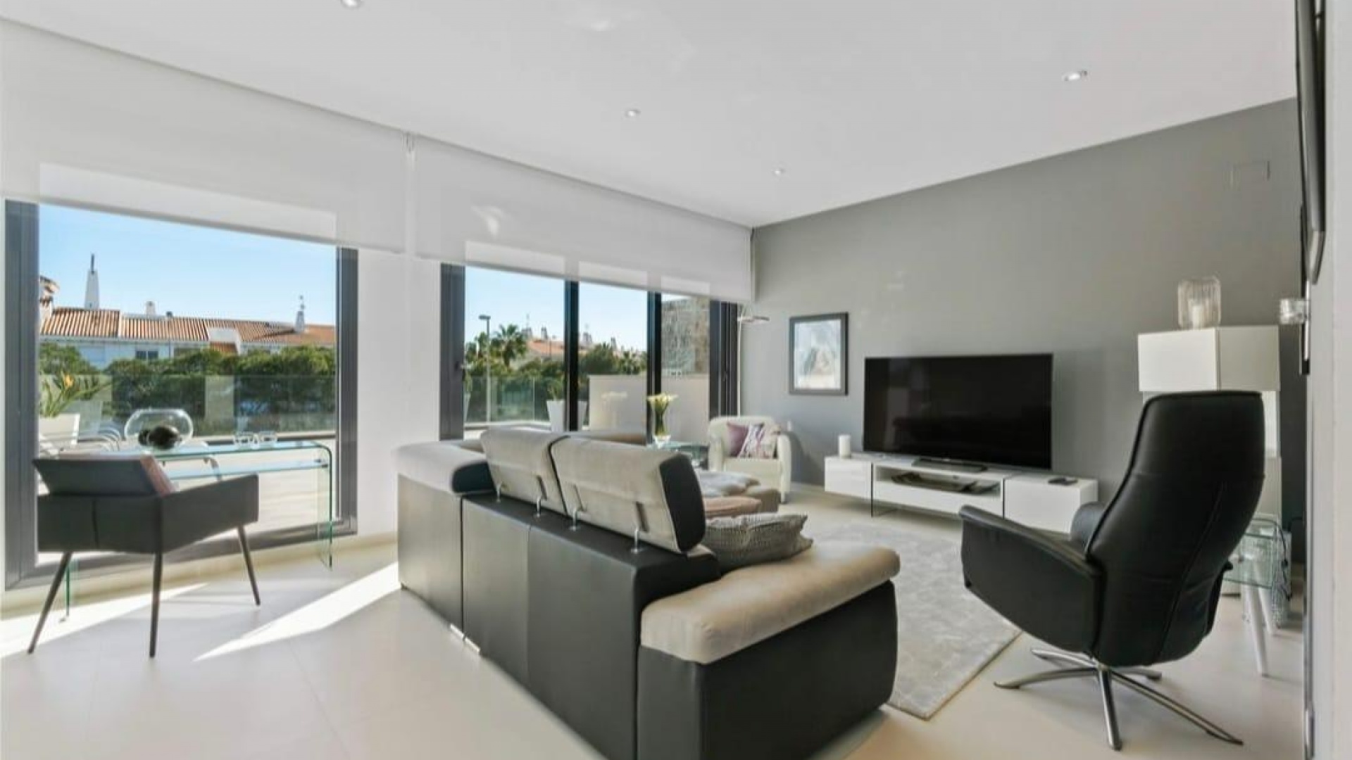 Campoamor, Modern lyxvilla med en 479 m2 tomt och ett 234 m2 hus med 3 sovrum (varav 2 på bottenvåningen), 3 badrum, stort vardagsrum, kök med ö, stor terrass, privat pool, solarium med inglasad yta och jacuzzi med havsutsikt, grillplats, säljs möblerad, med parkeringsplats på tomten och ligger på gångavstånd till aguamarina-stranden~.