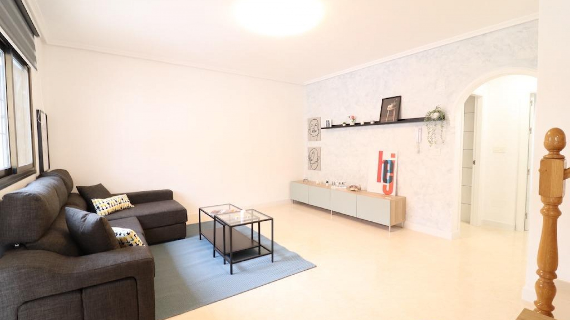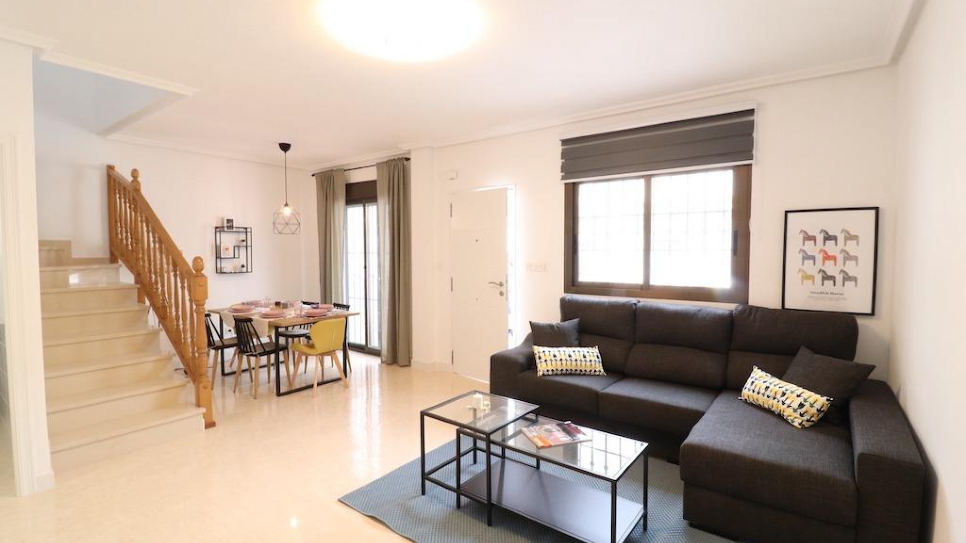 San Miguel de Salinas, Duplex radhus på 102 m2 byggt, helrenoverat och en stenlagd trädgård på 82 m2, huset har 3 sovrum (1 på bottenvåningen), 2 badrum, stort fristående kök, vardagsrum, terrass och ett stort solarium på ca 25 m2, huset säljs möblerat med ett underjordiskt bostadshus och ett stort förråd.