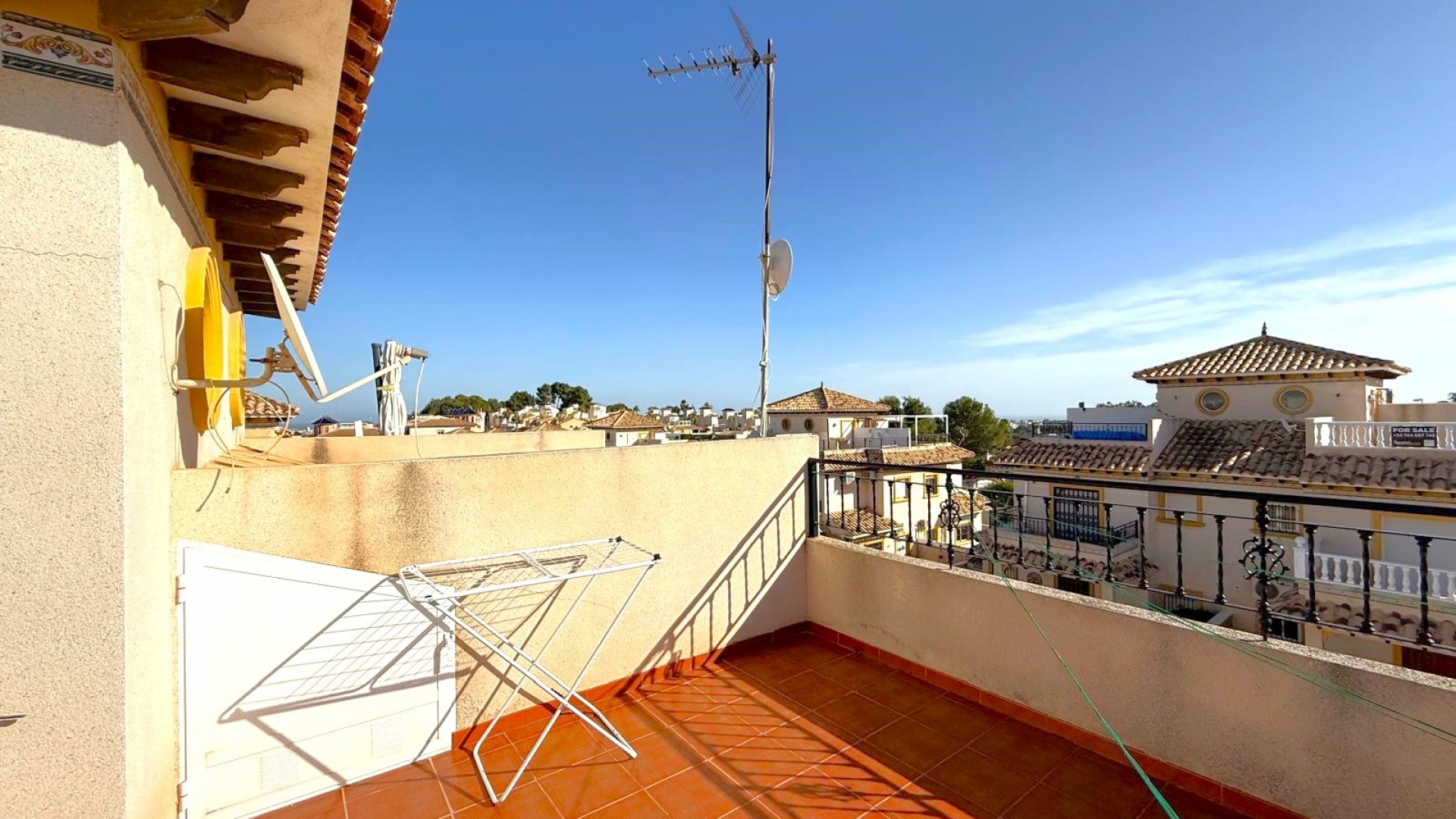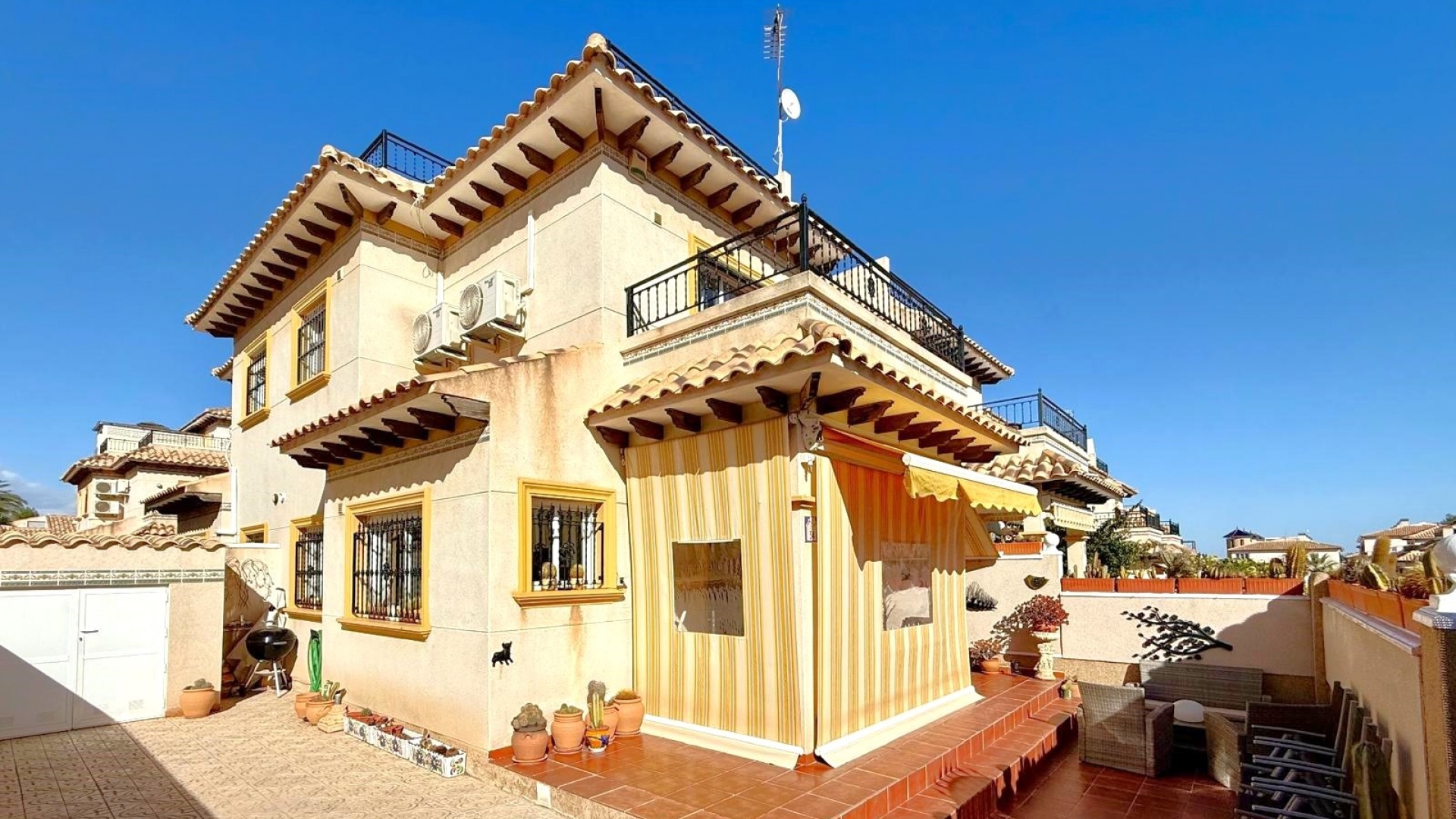 Den här fastigheten har ett lugnt läge men det är bara 5 minuters promenad till lokala barer & restauranger & cirka 10 minuters promenad till den berömda Villamartin Plaza & Golf Course där du hittar många barer, affärer, restauranger, bank, snabbköp etc. Det är 5 minuters bilresa till La Zenia-stranden och det enorma köpcentret Zenia Boulevard. 35 minuters bilresa till Murcia Corvera flygplats och cirka 45 minuters bilresa till Alicantes flygplats. Denna fastighet har ett idealiskt, centralt läge för golf med golfbanorna Villamartin, Campoamor och Las Ramblas i närheten.