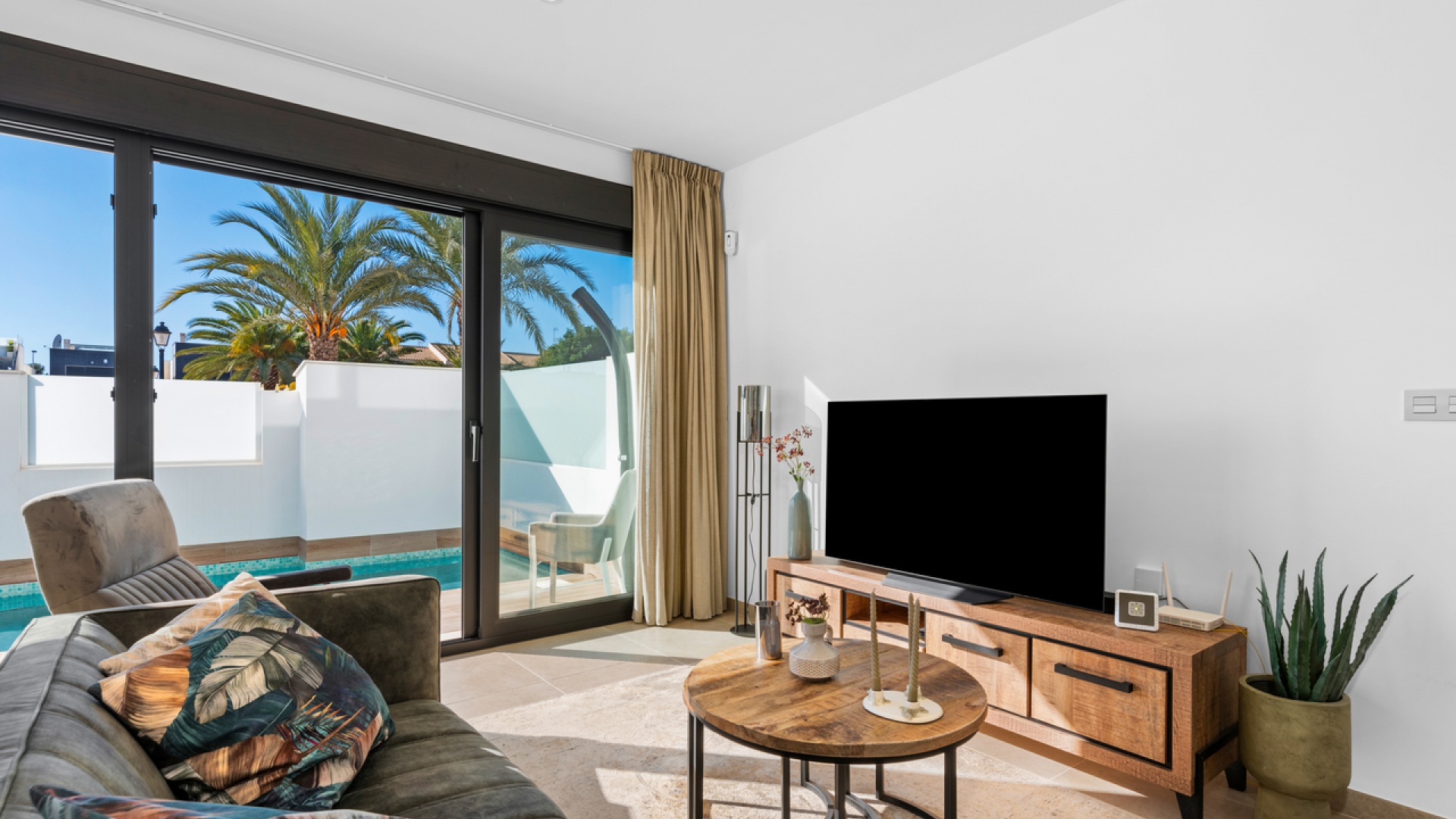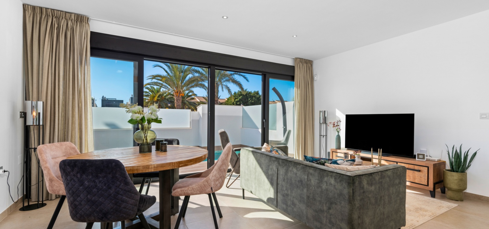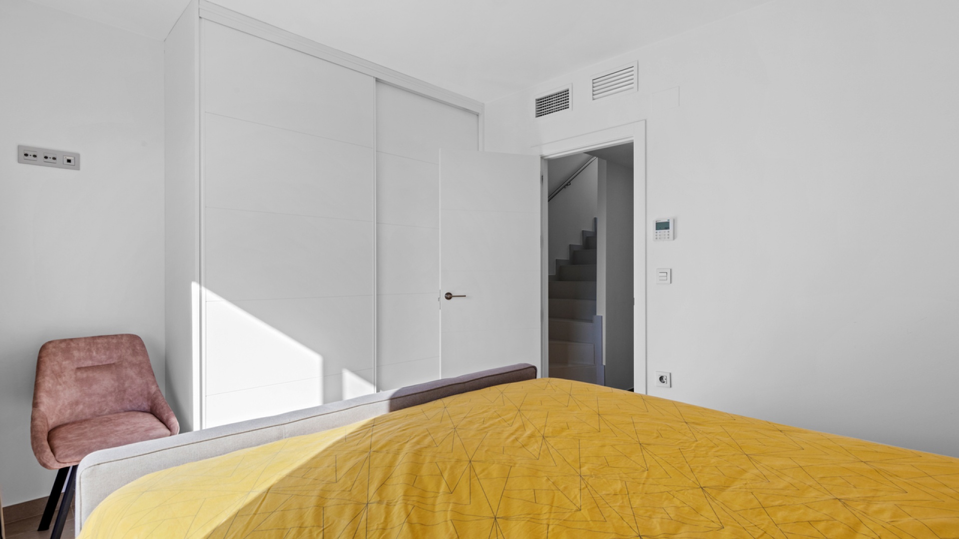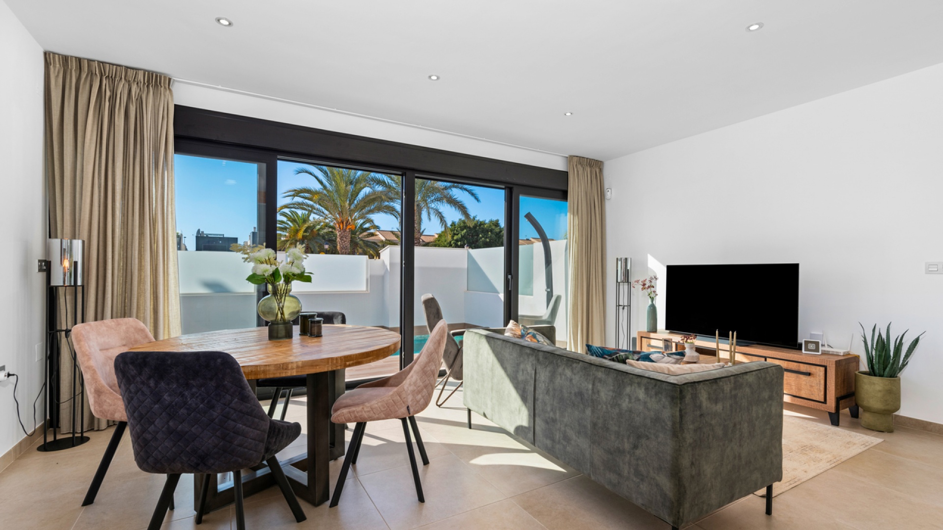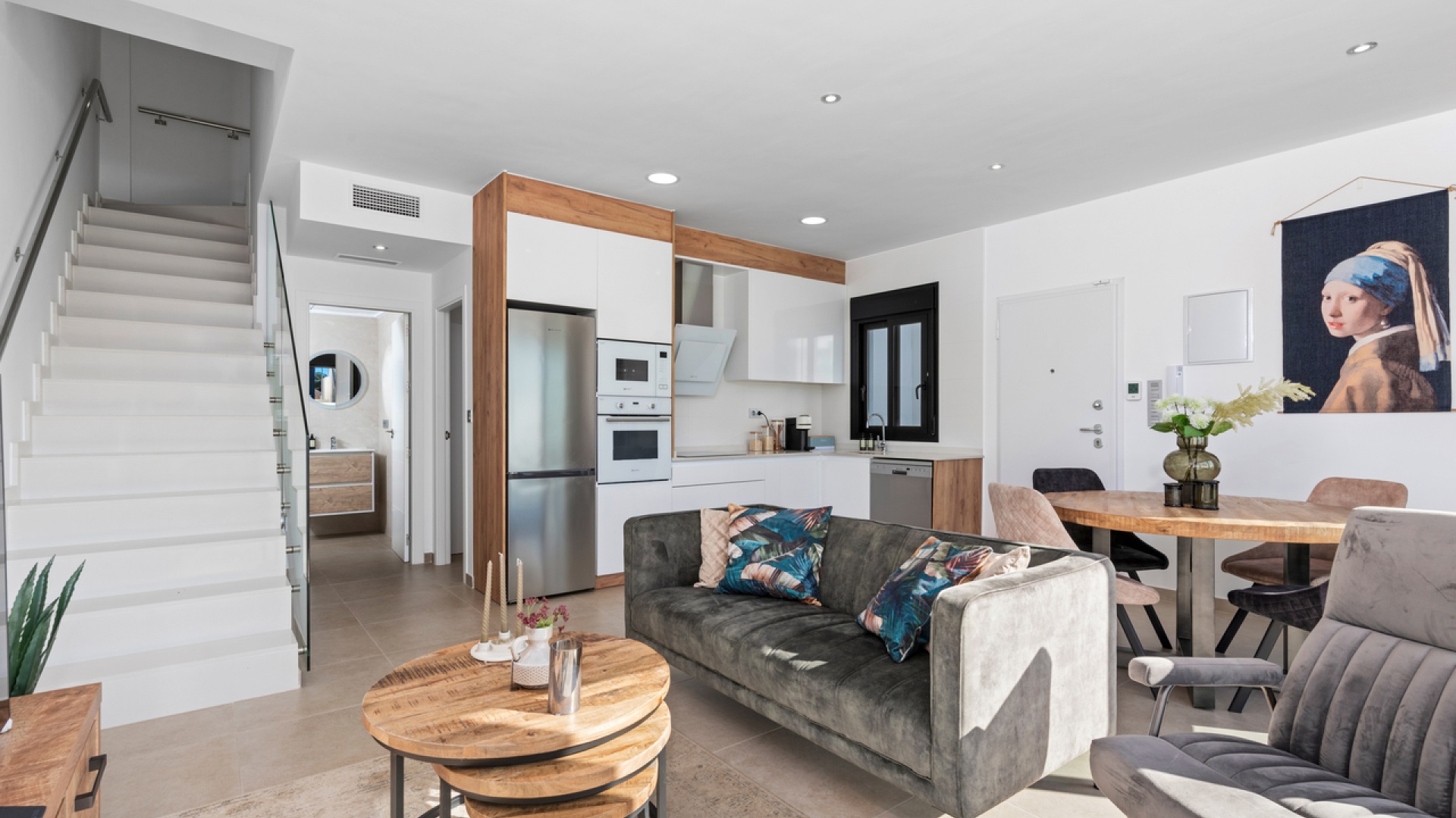 Fastigheten kommer att säljas fullt möblerad och består på bottenvåningen av ett mysigt vardagsrum/matsal med stora skjutbara glasfönster, ett fullt utrustat kök i öppen planlösning i L-form, ett sovrum med inbyggda garderober, ett badrum, flera terrasser, en privat trädgård med uppvärmd pool, ett förråd och parkering utanför vägen. På första våningen hittar vi ytterligare två stora sovrum med inbyggda garderober, ytterligare ett badrum, en stor terrass från sovrummet och det andra sovrummet, plus en privat takterrass/solarium med fantastisk utsikt.