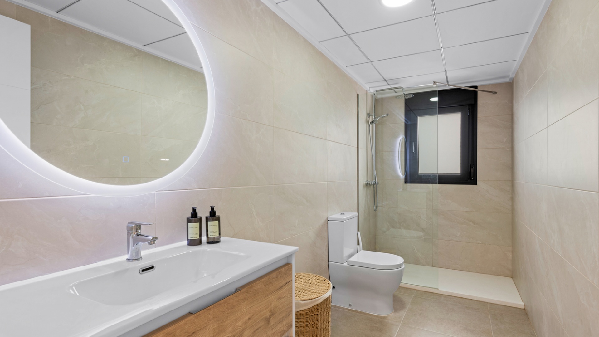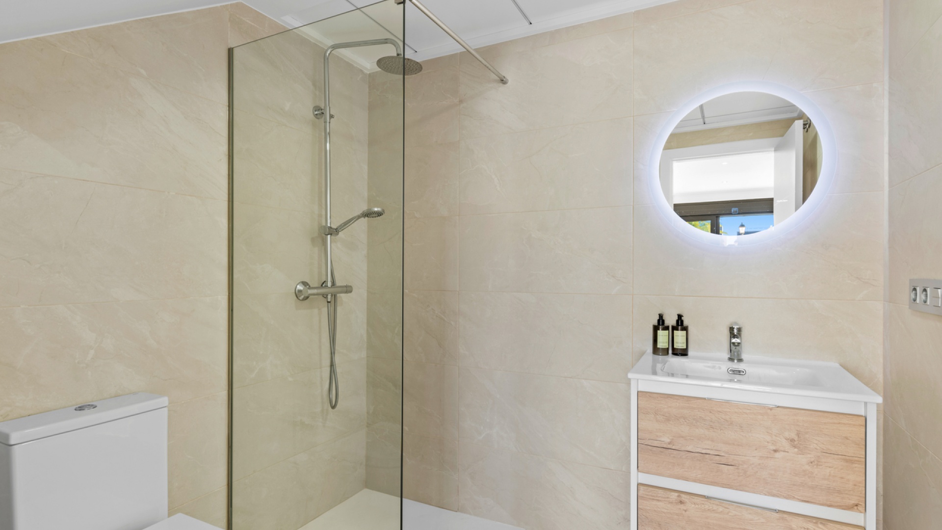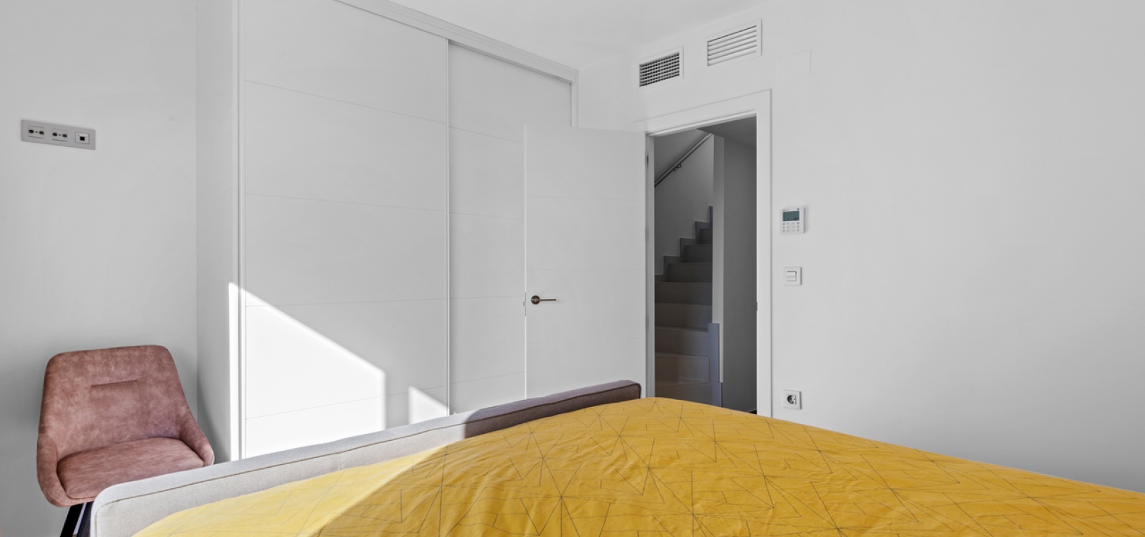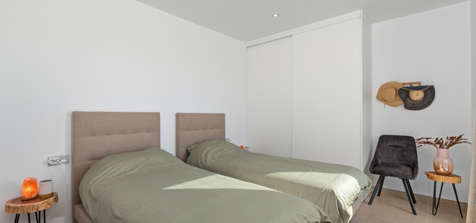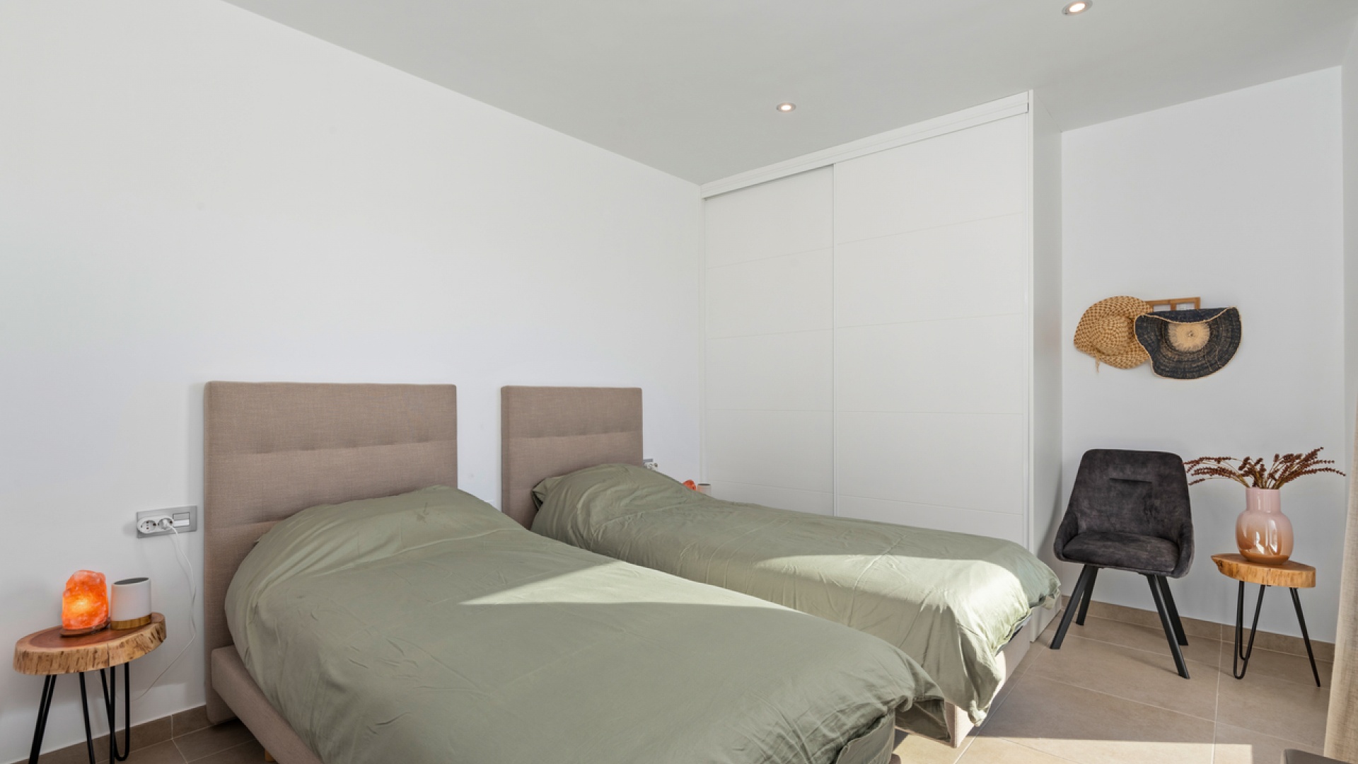 Fastigheten kommer att säljas fullt möblerad och består på bottenvåningen av ett mysigt vardagsrum/matsal med stora skjutbara glasfönster, ett fullt utrustat kök i öppen planlösning i L-form, ett sovrum med inbyggda garderober, ett badrum, flera terrasser, en privat trädgård med uppvärmd pool, ett förråd och parkering utanför vägen. På första våningen hittar vi ytterligare två stora sovrum med inbyggda garderober, ytterligare ett badrum, en stor terrass från sovrummet och det andra sovrummet, plus en privat takterrass/solarium med fantastisk utsikt.