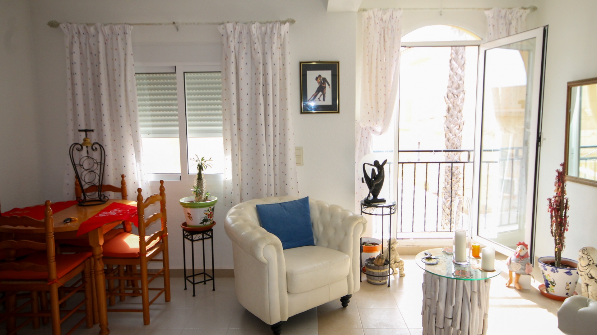 En mycket väl presenterad lägenhet på första våningen belägen i den populära urbaniseringen Las Carolinas. Denna ljusa och luftiga fastighet består av ett vardagsrum med öppen planlösning med kök, matsal och vardagsrum. En glasdörr ger möjlighet att njuta av den avlägsna havsutsikten. Lägenheten renoverades för ett antal år sedan och har ett stort dubbelrum med eget duschrum. Sovrummet har en härlig utsikt direkt mot den stora gemensamma poolen och trädgården. Lägenheten har även upvc tvåglasfönster och säljs möblerad. Gångavstånd till bekvämligheter och bara 10 minuters bilresa till de närmaste stränderna på Orihuela Costa. Visning rekommenderas.