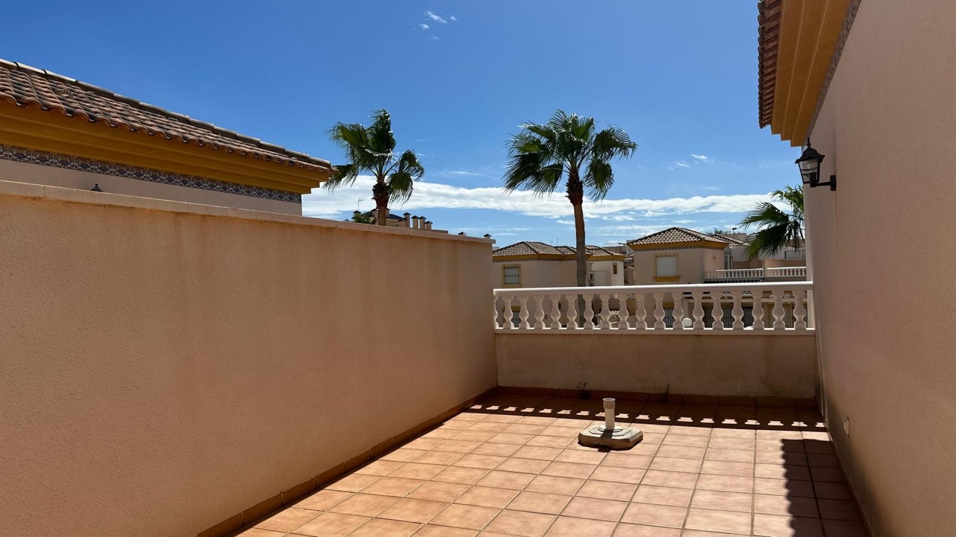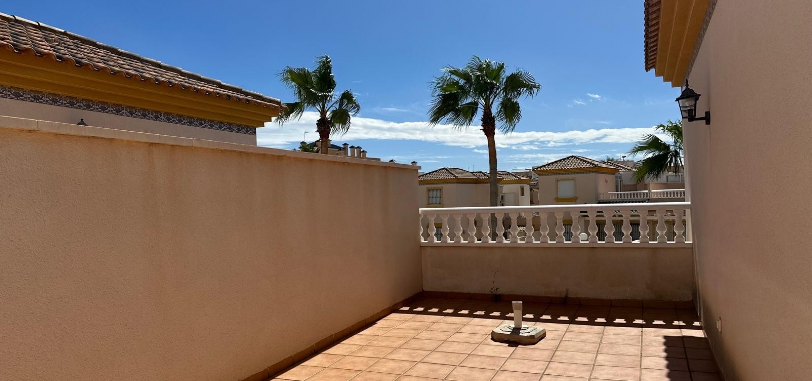 På övervåningen har det stora sovrummet fantastisk utsikt över det gemensamma poolområdet och ett separat duschrum. Från denna nivå finns tillgång till ett 22m² taksolarium med fantastisk utsikt över den gemensamma poolen.