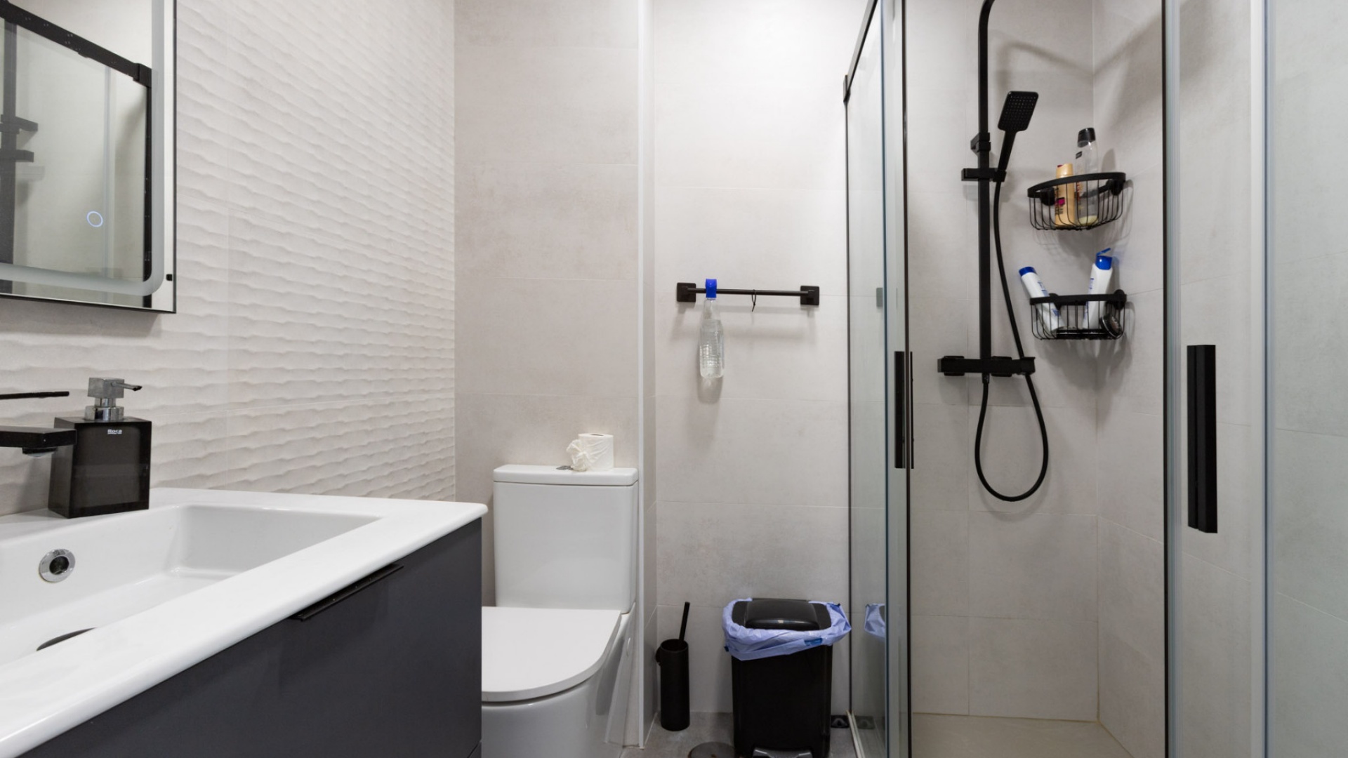 På övervåningen fortsätter den skandinaviskinspirerade stilen. Sovrumsgolven pryds av vackert eklaminat, vilket ger värme och en naturlig touch. Det stora sovrummet vetter mot både en privat balkong och solarium, och båda sovrummen har garderober med full vägg som erbjuder gott om diskret förvaringsutrymme. Badrummet på övervåningen har en fridfull look med ljusa toner, kompletterat med trendiga svarta accenter som lägger till en elegant kontrast.