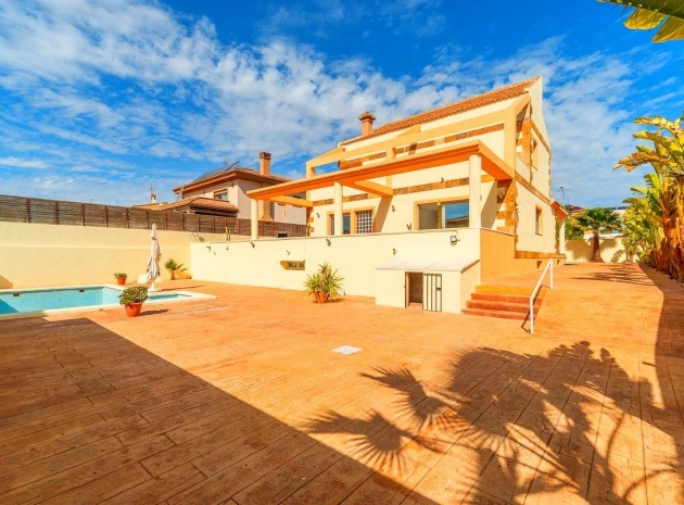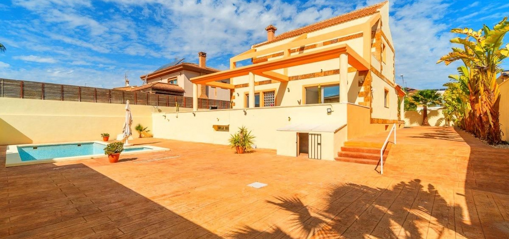Belägen i det exklusiva området Aguas Nuevas i Torrevieja, utmärker sig denna fantastiska lyxvilla genom sin rymlighet, komfort och exklusivitet i en privilegierad miljö. Med en tomt på 813 m² och en boyta på 478 m², erbjuder denna bostad en oslagbar livsstil, med ljusa och generösa utrymmen, en perfekt planlösning och fantastisk panoramautsikt över staden.~~Vid entrén möts du av ett stilfullt vardagsrum med stora fönster, som fyller rummet med naturligt ljus och skapar en perfekt koppling mellan inne- och utemiljön. Det fullt utrustade köket kombinerar funktionalitet och stil, med tillgång till tvättstuga och förråd. På bottenvåningen finns ett bekvämt sovrum, perfekt för gäster eller personer med begränsad rörlighet. På övervåningen finns två rymliga sovrum, som erbjuder avskildhet och komfort, varav det ena har tillgång till en charmig balkong.~~En av de största fördelarna med denna villa är de två stora terrasserna, båda sydvända, vilket ger sol hela dagen. Härifrån kan du njuta av imponerande utsikt över staden och den privata poolen, och skapa en perfekt plats för avkoppling eller trevliga stunder med familj och vänner.~~Källaren är ett mångsidigt utrymme med tre extra rum, perfekta för hemmabio, gym eller nöjesrum. Dessutom har bostaden ett garage med plats för mer än tre bilar, vilket ger både bekvämlighet och säkerhet.~~Utomhus erbjuder den privata trädgården och den stora poolen en äkta medelhavsoas, perfekt för att njuta av det soliga klimatet. Den rymliga terrassen och uteplatsen är idealiska för utomhusaktiviteter, medan den inhägnade tomten garanterar fullständig avskildhet.~~Med sitt utmärkta läge, nära stormarknader, skolor, vårdcentraler, golfbanor och endast 1.000 meter från stranden, är denna villa den perfekta kombinationen av lyx, lugn och livskvalitet. En unik möjlighet för dem som söker en exklusiv bostad i Torrevieja.