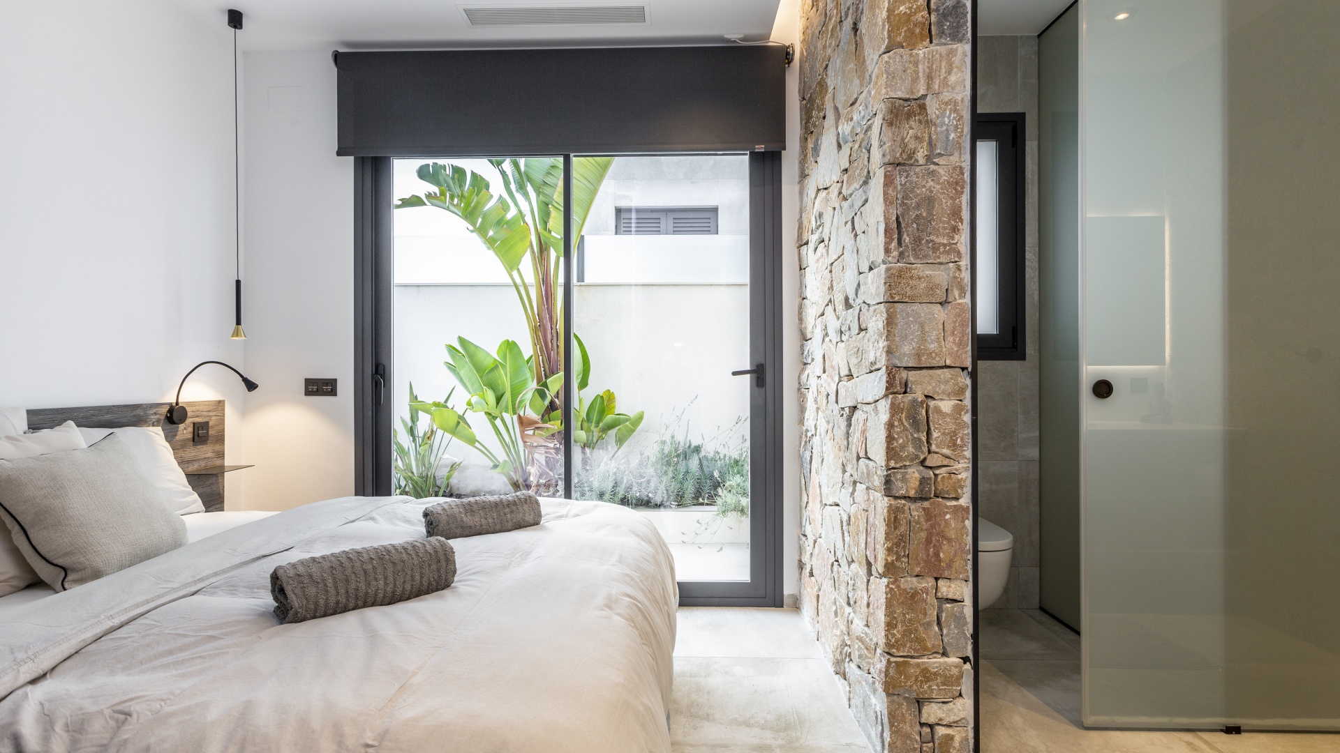 På övervåningen hittar du ytterligare två sovrum, båda med eget badrum. Ett av sovrummen har också en privat balkong - en perfekt plats att börja dagen med en kopp kaffe medan du njuter av utsikten. Det stora sovrummet, också på denna nivå, erbjuder en fridfull oas med gott om förvaringsutrymme.