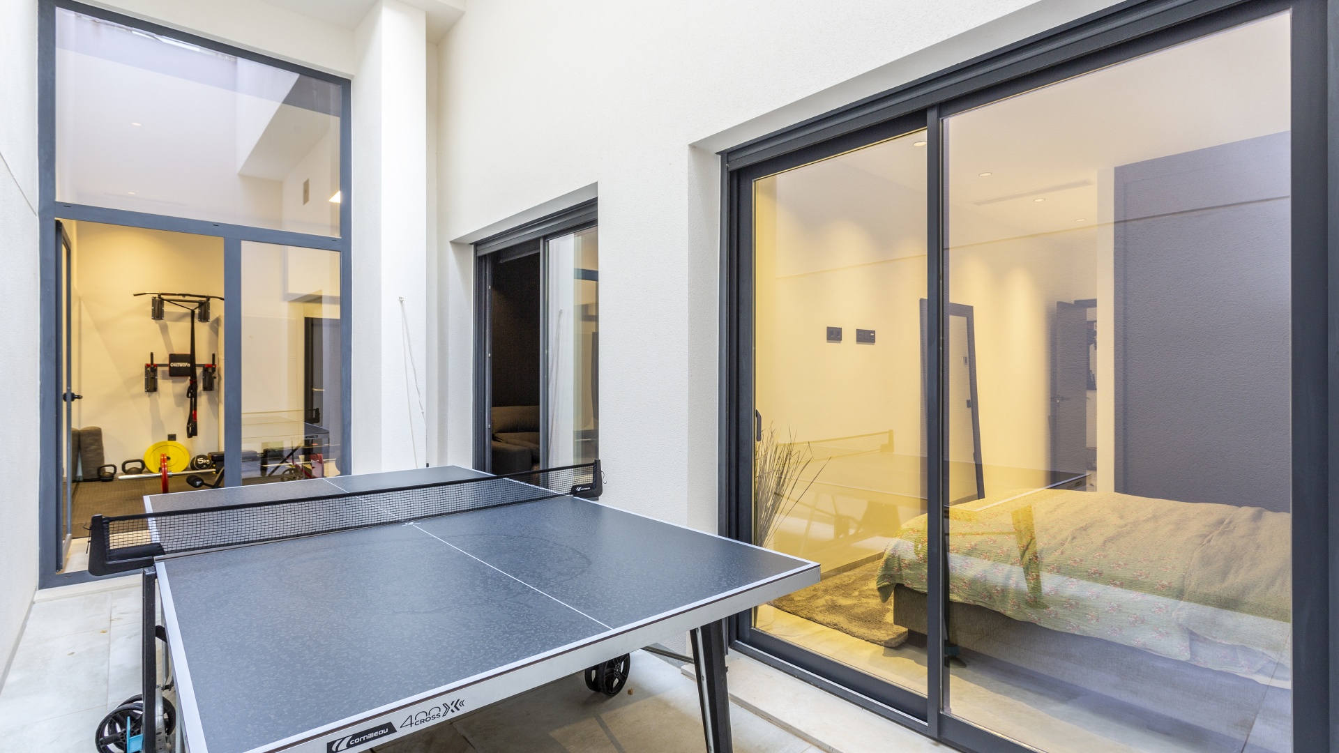 Villans källare ger ännu mer utrymme och möjligheter. Här hittar du ett extra vardagsrum, perfekt som lounge eller hemmabio, ett sovrum med eget badrum och ett gym för dig som vill hålla dig aktiv. Från källaren har du även tillgång till en mysig uteplats där nuvarande ägare har placerat ett pingisbord – ett härligt utrymme för både avkoppling och nöje. Dessutom finns tvättstuga, förråd och ett rymligt garage med gott om plats.