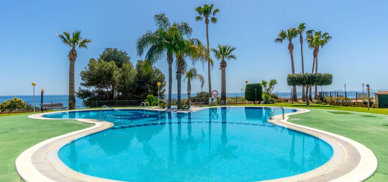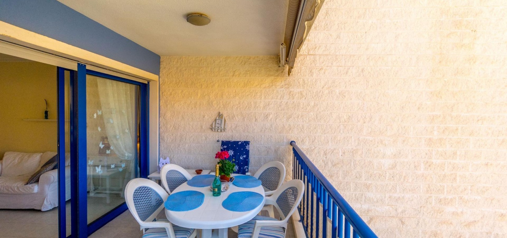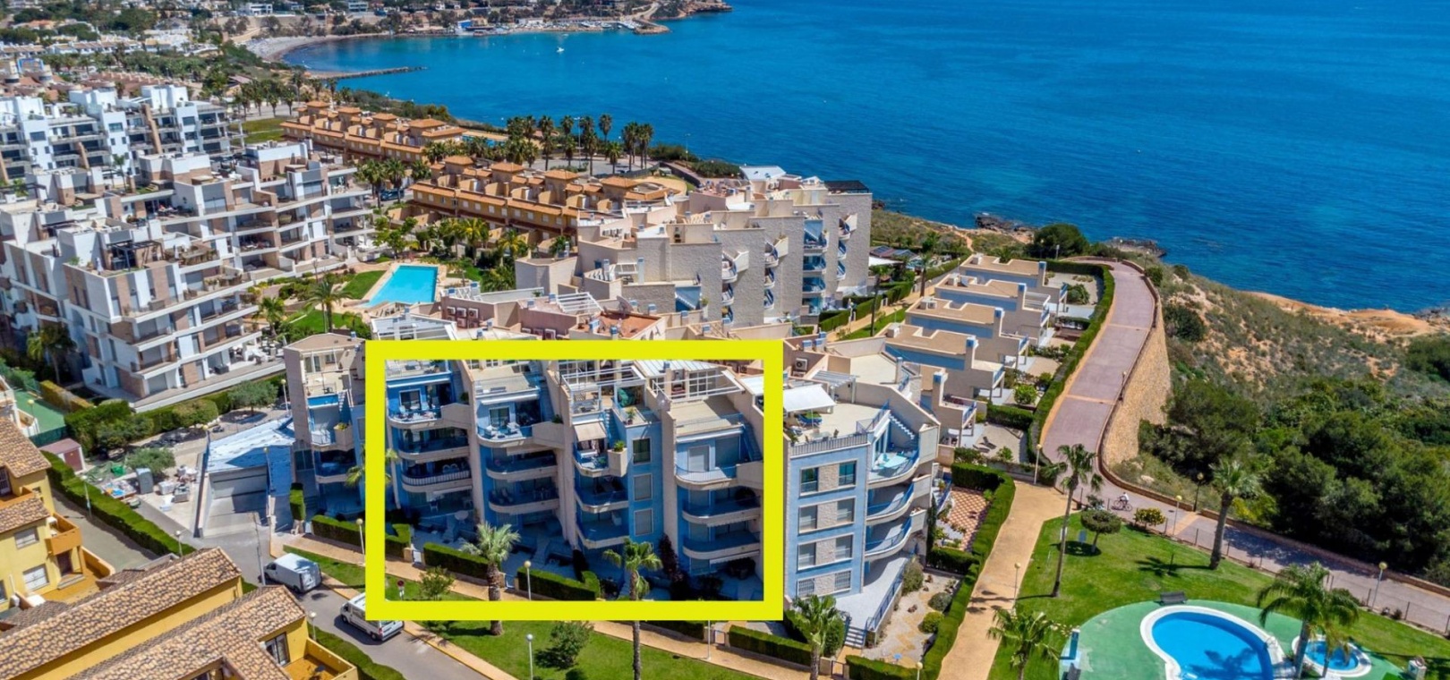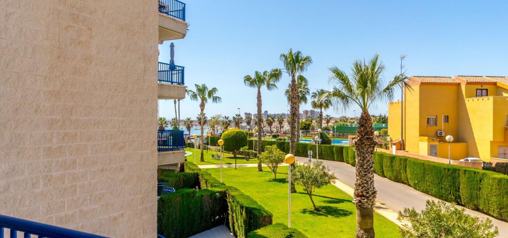 Denna rymliga och ljusa lägenhet ligger i det exklusiva bostadskomplexet Aguamarina, Punta Glea, vid stranden, med direkt tillgång till strandpromenaden. Ligger på första våningen, vetter mot sydost för att njuta av solen nästan hela dagen. Med en yta på 78 m² har den en mycket bekväm layout som erbjuder komfort och funktionalitet.~Lägenheten har två stora sovrum, alla med inbyggda garderober, som ger gott om förvaringsutrymme, och två kompletta badrum.~Det separata köket är fullt utrustat och inkluderar en tvättstuga. Ett ljust vardagsrum/matsal och en stor terrass, som nås från vardagsrummet och sovrummet, är den perfekta platsen för att njuta av utsikten över komplexets trädgårdar och havet. Lägenheten säljs delvis möblerad och har luftkonditionering. Lägenheten kommer också med en parkeringsplats i det underjordiska garaget. ~ Bostadskomplexet har en spektakulär pool, omgiven av trädgårdar, perfekt för att njuta av soliga dagar och koppla av bara några steg från havet. Ett oslagbart läge, med bekvämligheten att vara precis vid stranden och med alla bekvämligheter inom gångavstånd.~