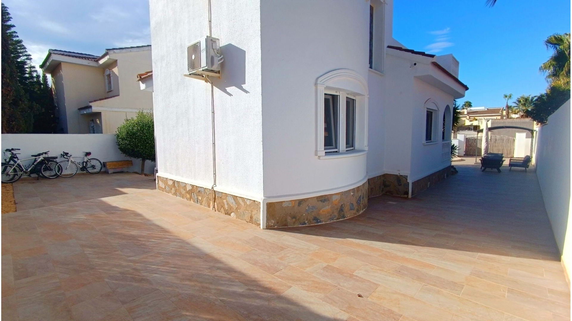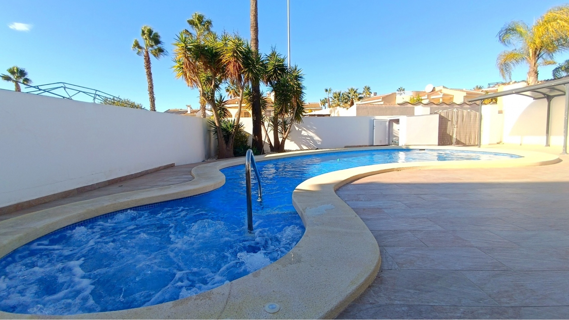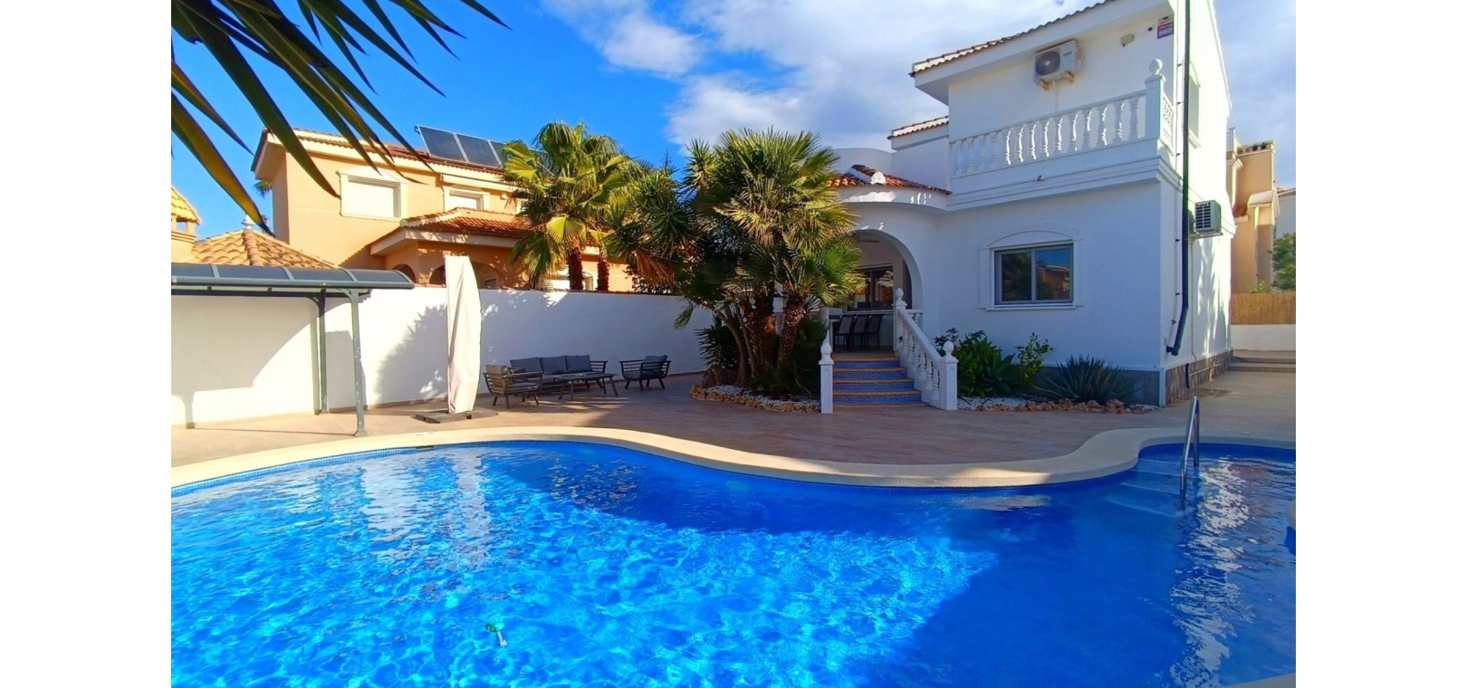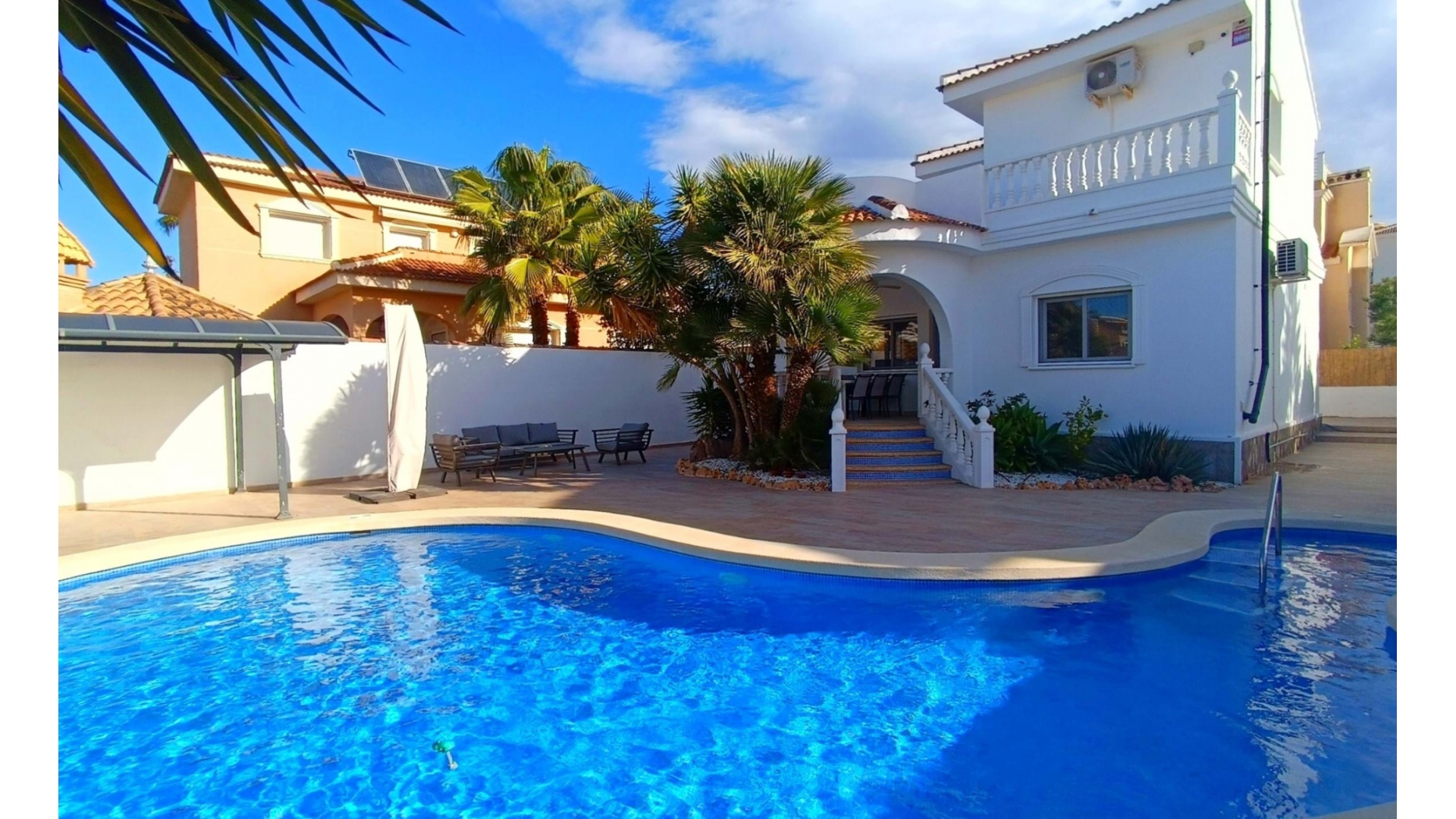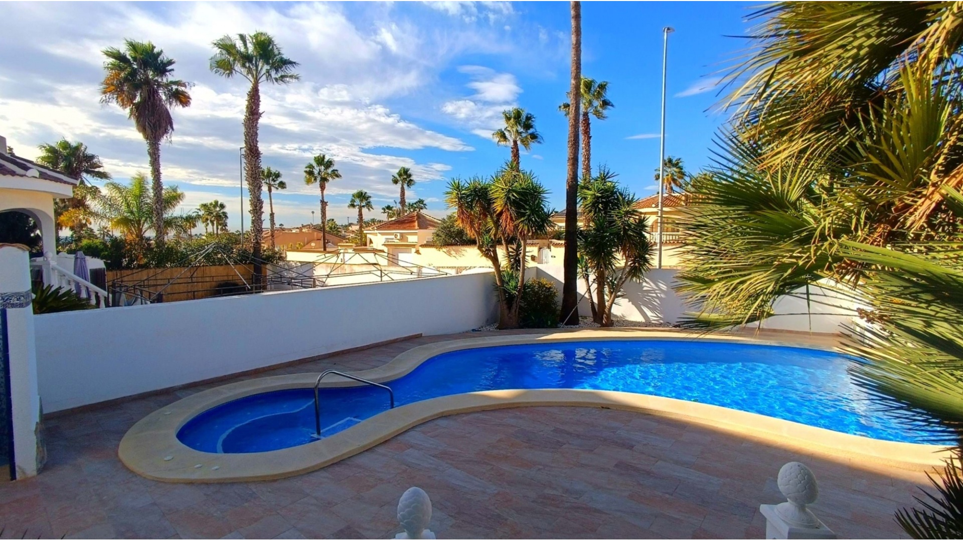 Vi är glada över att kunna presentera denna vackert renoverade fristående villa med 3 sovrum och 1,5 badrum, belägen i det mycket eftertraktade området La Fiesta, Ciudad Quesada. Detta fantastiska hem har totalförvandlats både inifrån och ut, och erbjuder modern komfort och stil genomgående. Beläget på en generös tomt på 384 m², välkomnar fastigheten dig med privata grindar som leder till en glittrande pool med jacuzzi, omgiven av flera utomhussittplatser och gott om förvaring. Den noggrant designade trädgården blandar kaklade och gröna ytor och skapar en lugn oas perfekt för avkoppling och underhållning. Entrén har en charmig, rund, täckt veranda, perfekt för att njuta av måltider utomhus eller underhålla medan du har utsikt över poolen och lummiga palmer. Inuti har det rymliga vardagsrummet och matsalen i öppen planlösning rikligt med naturligt ljus, sömlöst anslutet till ett moderniserat kök med grovkök och direkt tillgång till den bakre grillplatsen. Bottenvåningen har ett helt renoverat vardagsrum och matsal i öppen planlösning med fantastiskt kök som når trädgården på baksidan och har ett användbart grovkök, denna nivå innehåller också ett stort dubbelrum och en bekväm separat toalett. Gå upp för trappan med sina eleganta glaspaneler för att hitta ytterligare två generöst tilltagna dubbelrum och ett lyxigt familjebadrum. Det stora sovrummet har direkt tillgång till en privat terrass, perfekt för att njuta av det spanska solskenet. Denna villa är fullspäckad med extrafunktioner, inklusive ett förstklassigt larmsystem, mygggardiner, luftkonditionering i alla sovrum och loungen, en ny poolpump och mycket mer. Bekvämt beläget inom gångavstånd från lokala bekvämligheter, det är bara 5 minuters bilresa till golfbanan La Marquesa, 5 minuter till Quesada High Street och bara 8 minuter till de fantastiska stränderna i Guardamar del Segura.