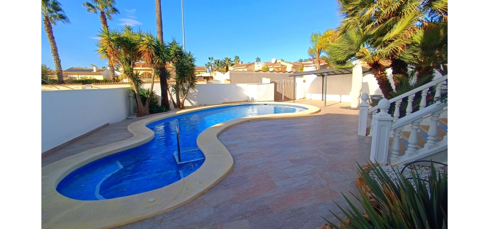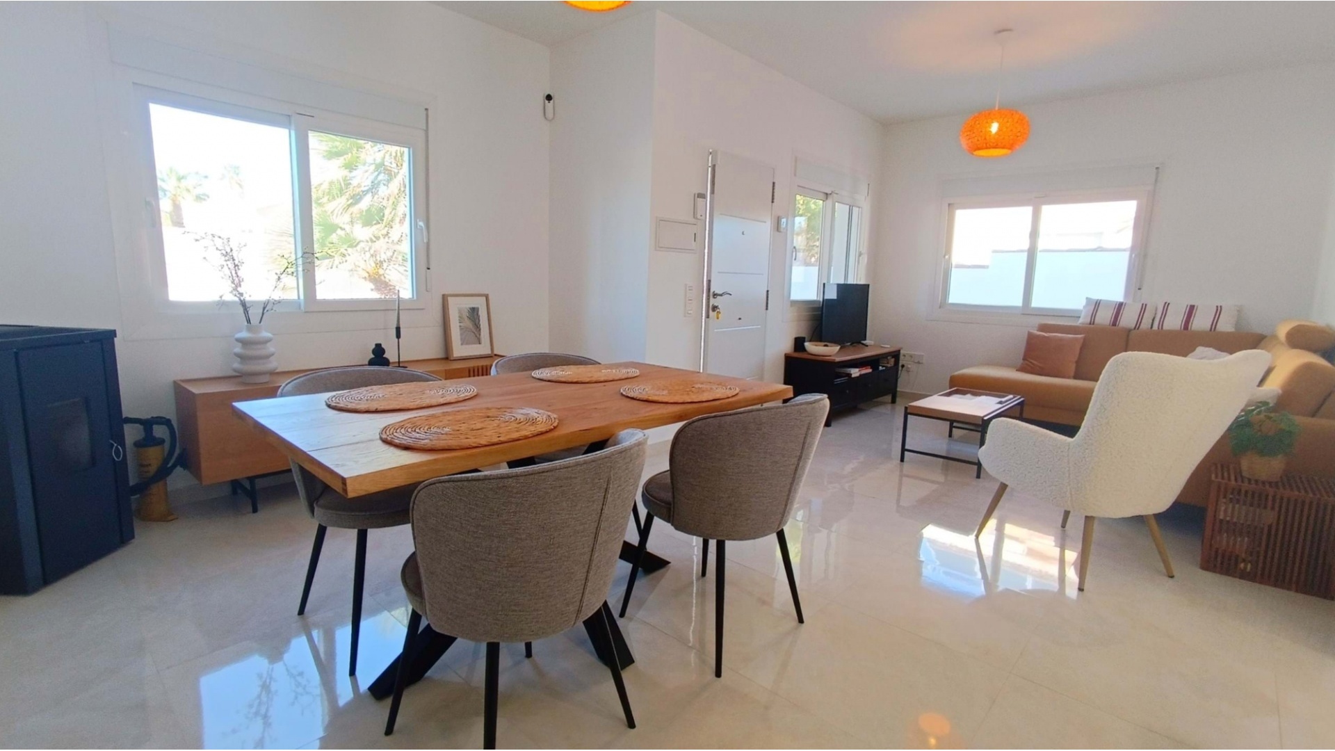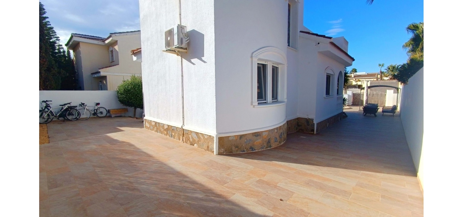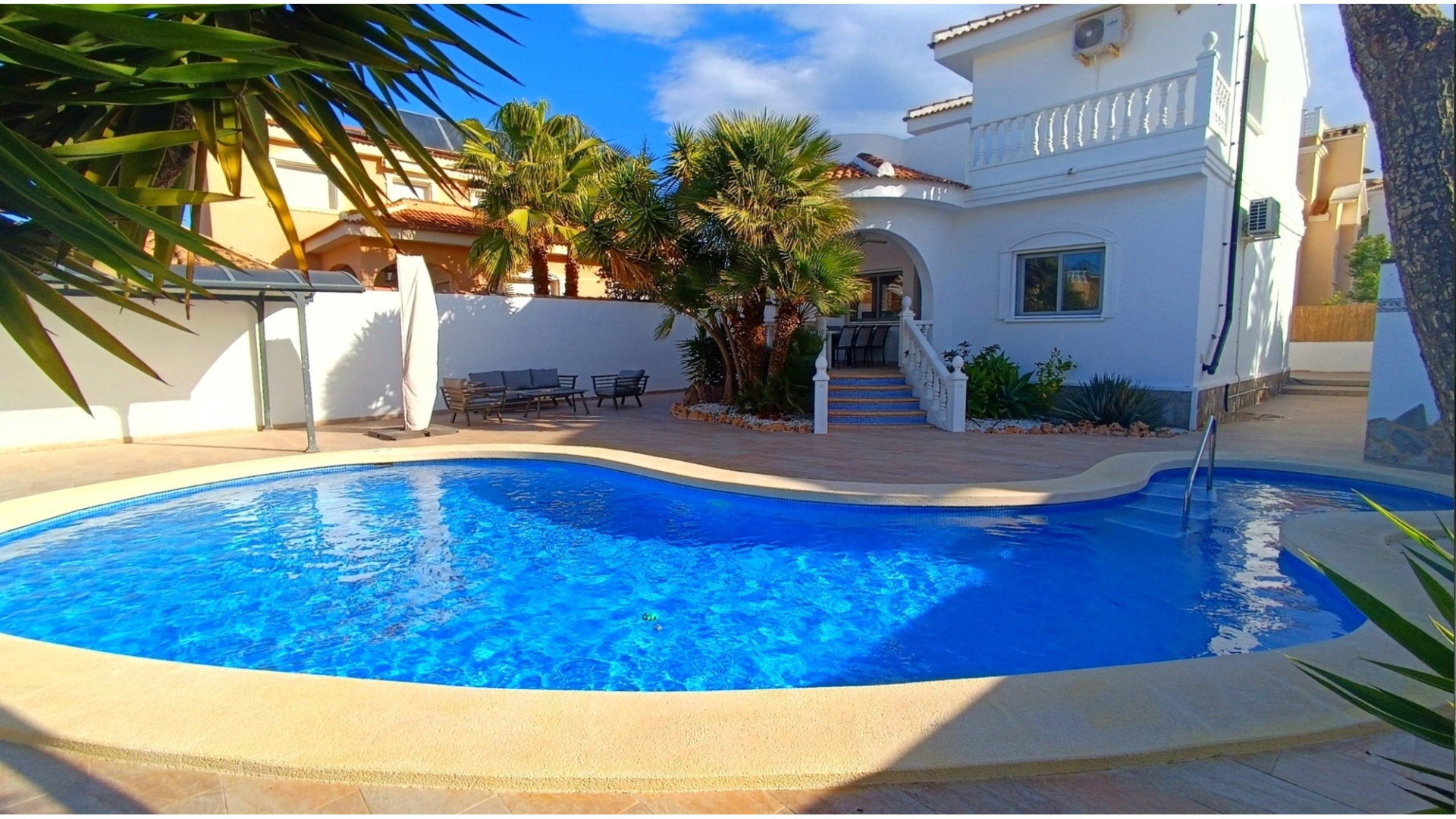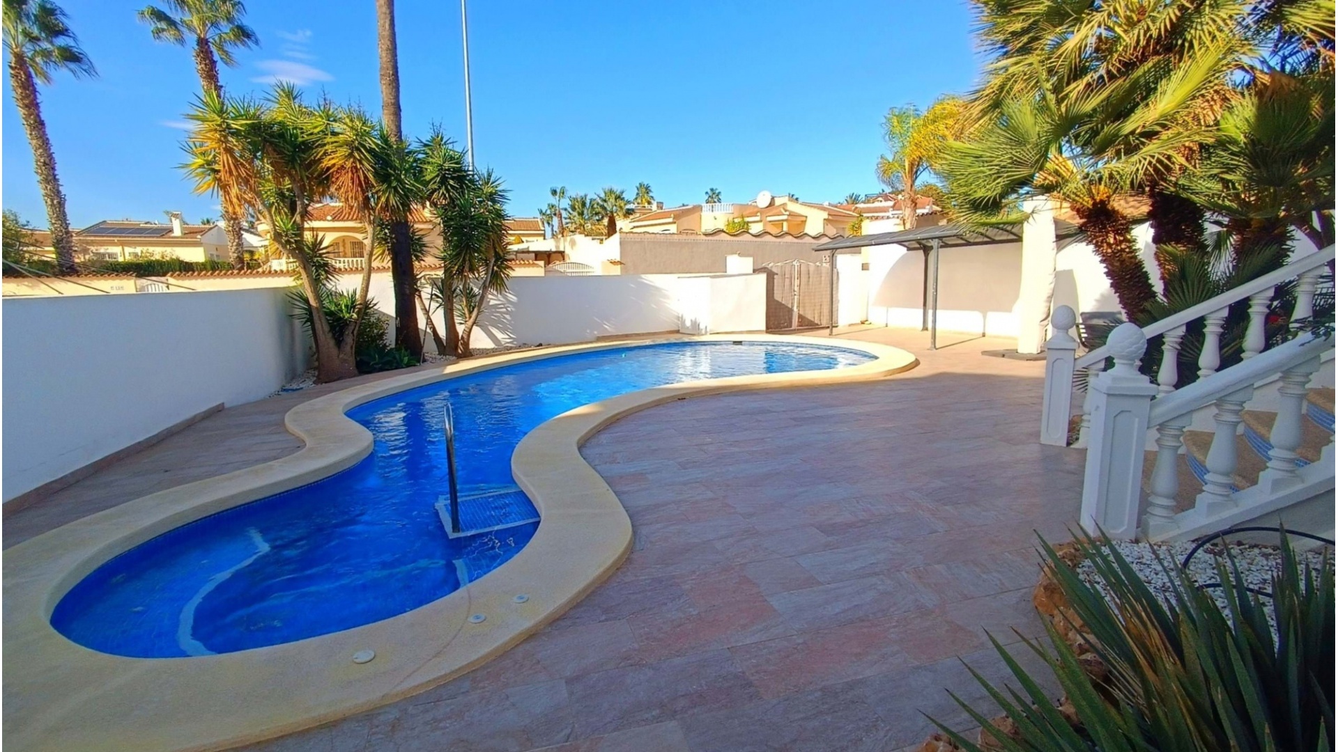 Vi är glada över att kunna presentera denna vackert renoverade fristående villa med 3 sovrum och 1,5 badrum, belägen i det mycket eftertraktade området La Fiesta, Ciudad Quesada. Detta fantastiska hem har totalförvandlats både inifrån och ut, och erbjuder modern komfort och stil genomgående. Beläget på en generös tomt på 384 m², välkomnar fastigheten dig med privata grindar som leder till en glittrande pool med jacuzzi, omgiven av flera utomhussittplatser och gott om förvaring. Den noggrant designade trädgården blandar kaklade och gröna ytor och skapar en lugn oas perfekt för avkoppling och underhållning. Entrén har en charmig, rund, täckt veranda, perfekt för att njuta av måltider utomhus eller underhålla medan du har utsikt över poolen och lummiga palmer. Inuti har det rymliga vardagsrummet och matsalen i öppen planlösning rikligt med naturligt ljus, sömlöst anslutet till ett moderniserat kök med grovkök och direkt tillgång till den bakre grillplatsen. Bottenvåningen har ett helt renoverat vardagsrum och matsal i öppen planlösning med fantastiskt kök som når trädgården på baksidan och har ett användbart grovkök, denna nivå innehåller också ett stort dubbelrum och en bekväm separat toalett. Gå upp för trappan med sina eleganta glaspaneler för att hitta ytterligare två generöst tilltagna dubbelrum och ett lyxigt familjebadrum. Det stora sovrummet har direkt tillgång till en privat terrass, perfekt för att njuta av det spanska solskenet. Denna villa är fullspäckad med extrafunktioner, inklusive ett förstklassigt larmsystem, mygggardiner, luftkonditionering i alla sovrum och loungen, en ny poolpump och mycket mer. Bekvämt beläget inom gångavstånd från lokala bekvämligheter, det är bara 5 minuters bilresa till golfbanan La Marquesa, 5 minuter till Quesada High Street och bara 8 minuter till de fantastiska stränderna i Guardamar del Segura.
