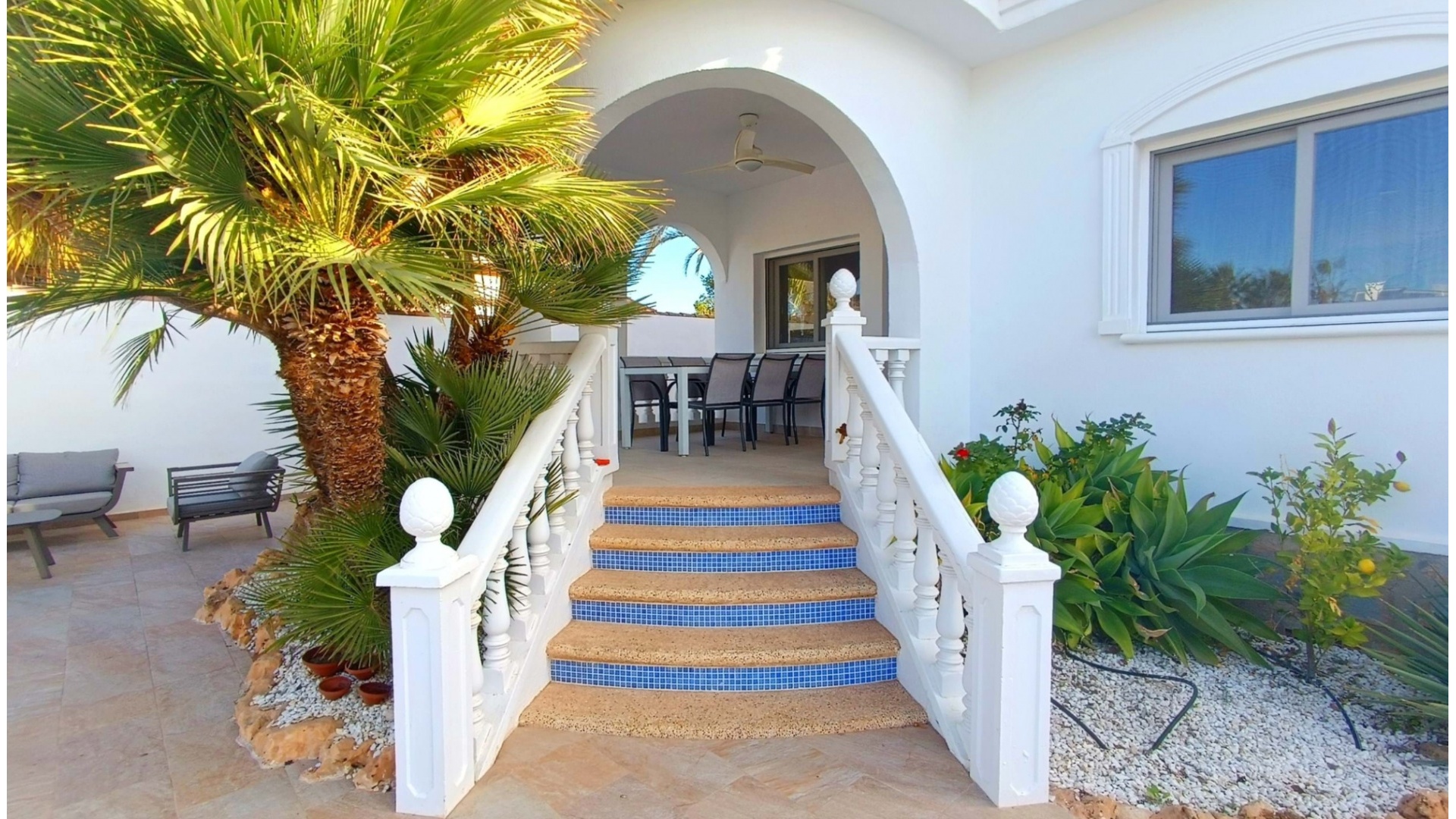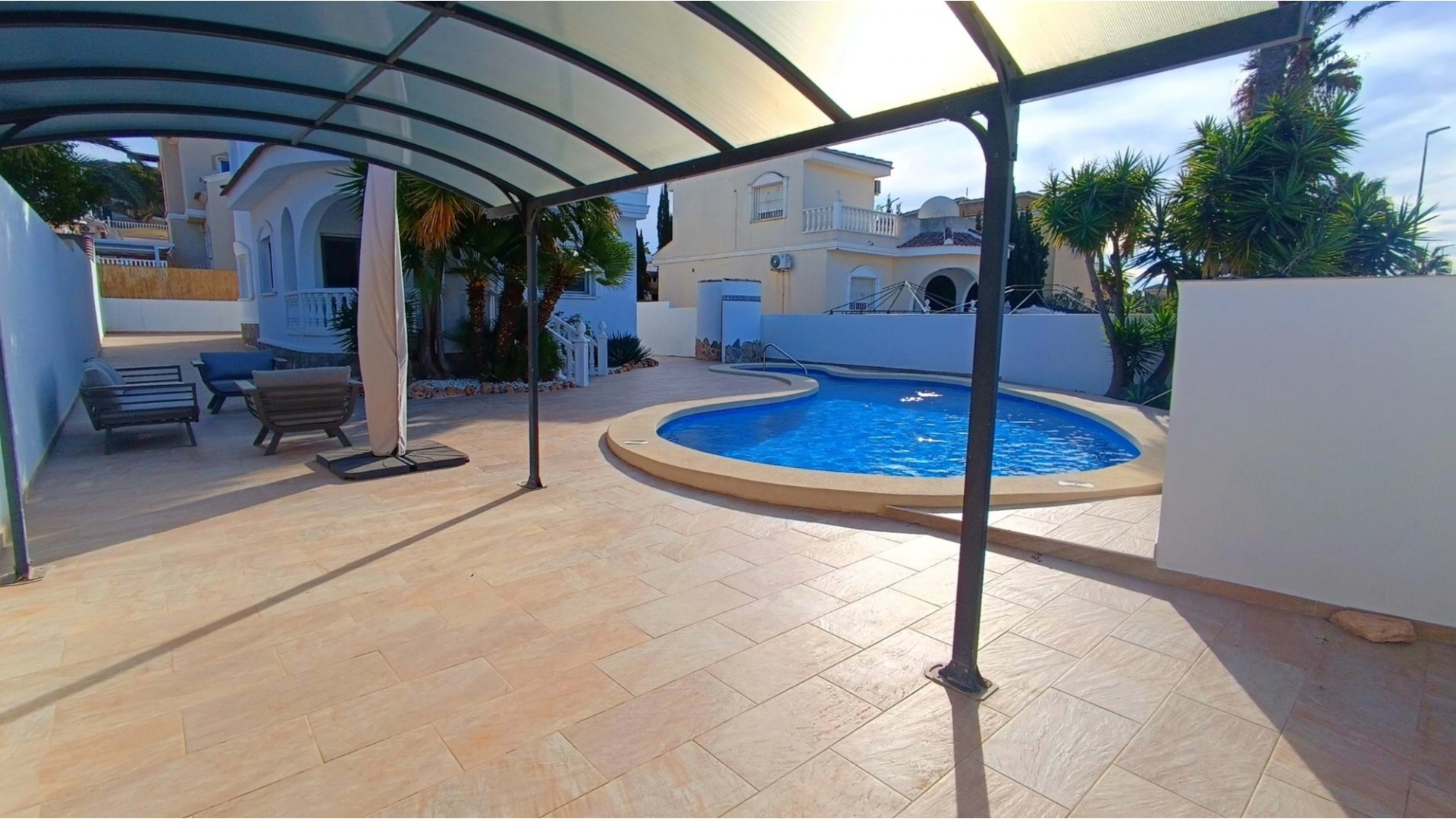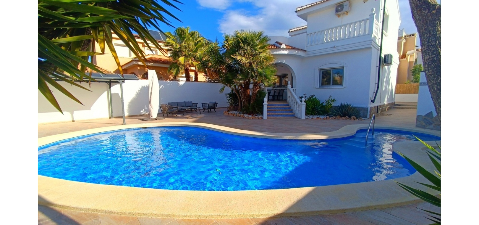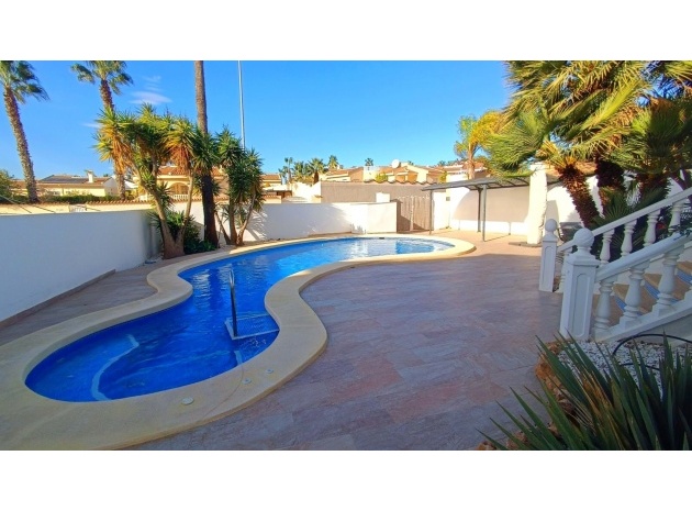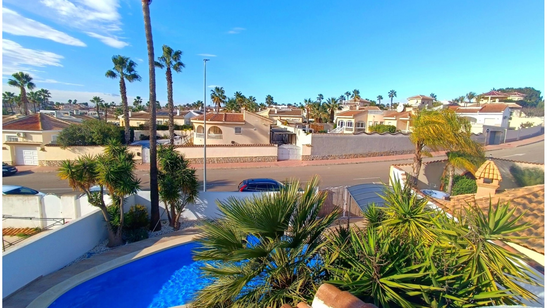Vi är glada över att kunna presentera denna vackert renoverade fristående villa med 3 sovrum och 1,5 badrum, belägen i det mycket eftertraktade området La Fiesta, Ciudad Quesada. Detta fantastiska hem har totalförvandlats både inifrån och ut, och erbjuder modern komfort och stil genomgående. Beläget på en generös tomt på 384 m², välkomnar fastigheten dig med privata grindar som leder till en glittrande pool med jacuzzi, omgiven av flera utomhussittplatser och gott om förvaring. Den noggrant designade trädgården blandar kaklade och gröna ytor och skapar en lugn oas perfekt för avkoppling och underhållning. Entrén har en charmig, rund, täckt veranda, perfekt för att njuta av måltider utomhus eller underhålla medan du har utsikt över poolen och lummiga palmer. Inuti har det rymliga vardagsrummet och matsalen i öppen planlösning rikligt med naturligt ljus, sömlöst anslutet till ett moderniserat kök med grovkök och direkt tillgång till den bakre grillplatsen. Bottenvåningen har ett helt renoverat vardagsrum och matsal i öppen planlösning med fantastiskt kök som når trädgården på baksidan och har ett användbart grovkök, denna nivå innehåller också ett stort dubbelrum och en bekväm separat toalett. Gå upp för trappan med sina eleganta glaspaneler för att hitta ytterligare två generöst tilltagna dubbelrum och ett lyxigt familjebadrum. Det stora sovrummet har direkt tillgång till en privat terrass, perfekt för att njuta av det spanska solskenet. Denna villa är fullspäckad med extrafunktioner, inklusive ett förstklassigt larmsystem, mygggardiner, luftkonditionering i alla sovrum och loungen, en ny poolpump och mycket mer. Bekvämt beläget inom gångavstånd från lokala bekvämligheter, det är bara 5 minuters bilresa till golfbanan La Marquesa, 5 minuter till Quesada High Street och bara 8 minuter till de fantastiska stränderna i Guardamar del Segura.