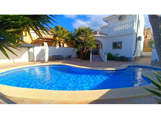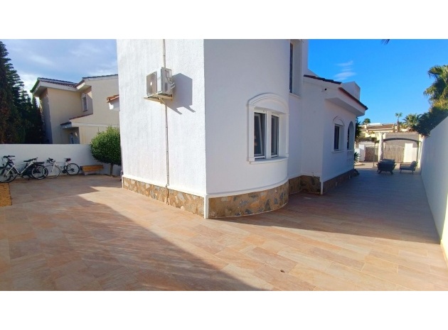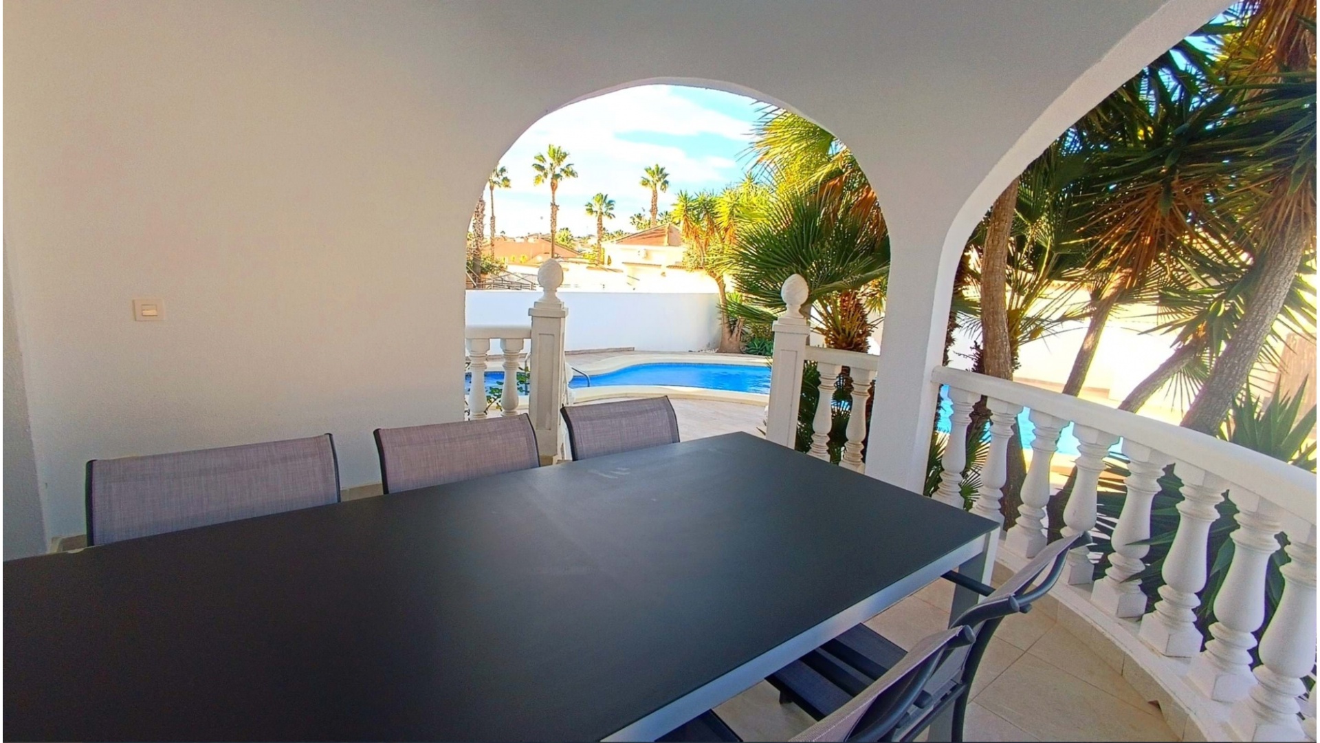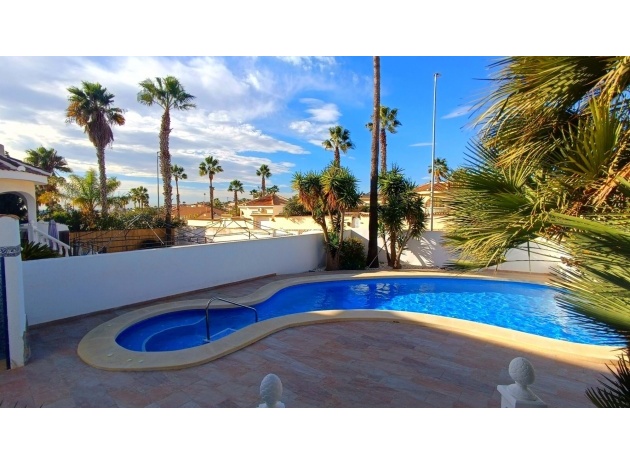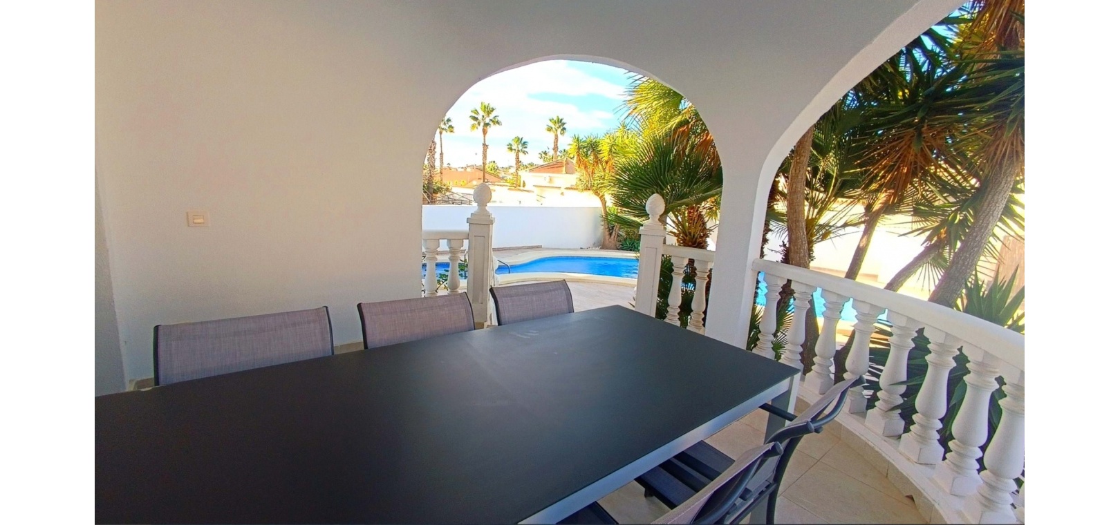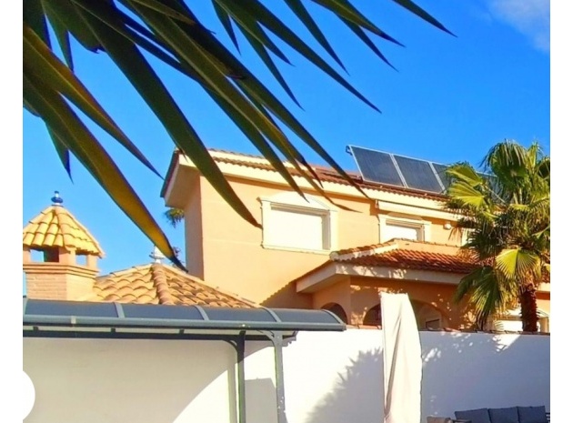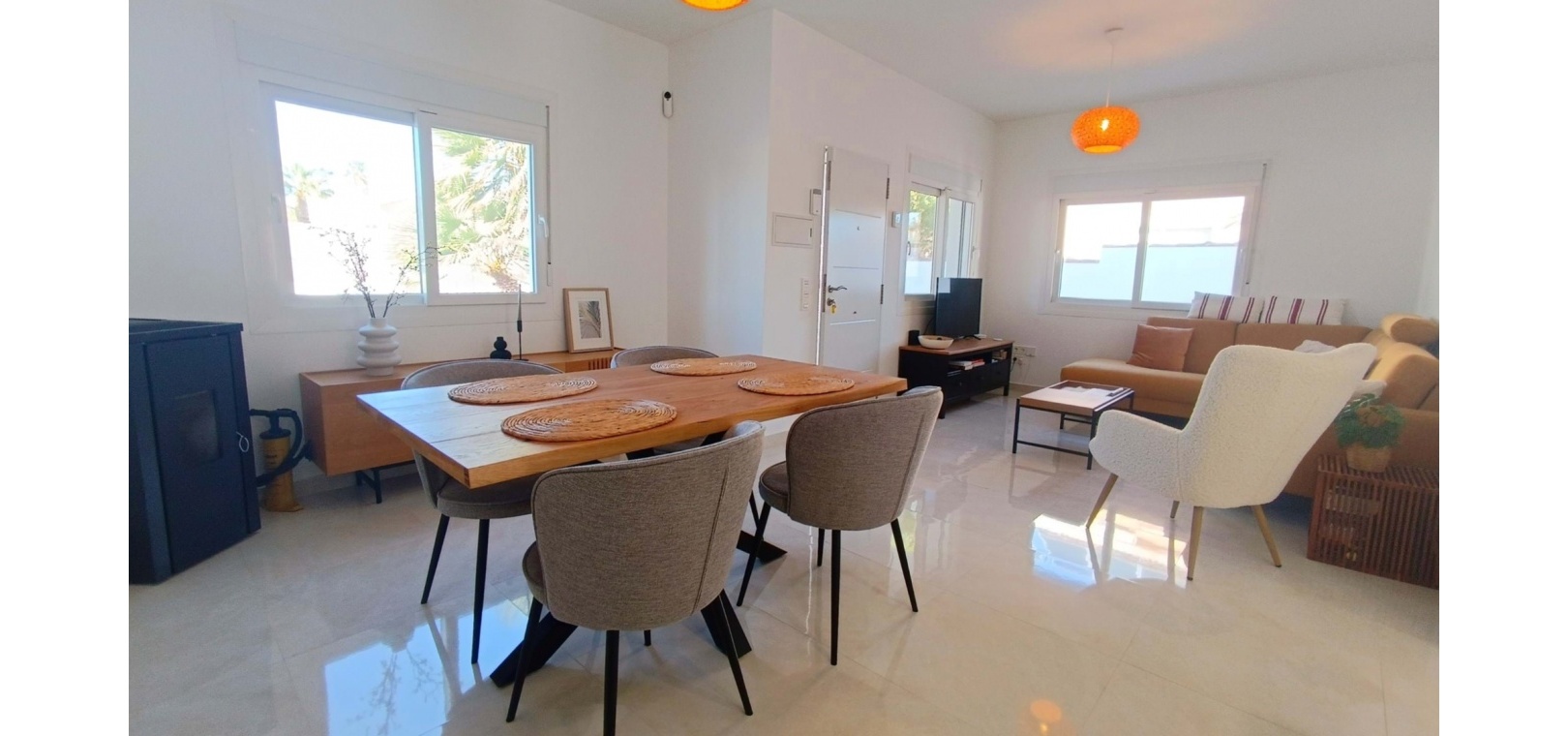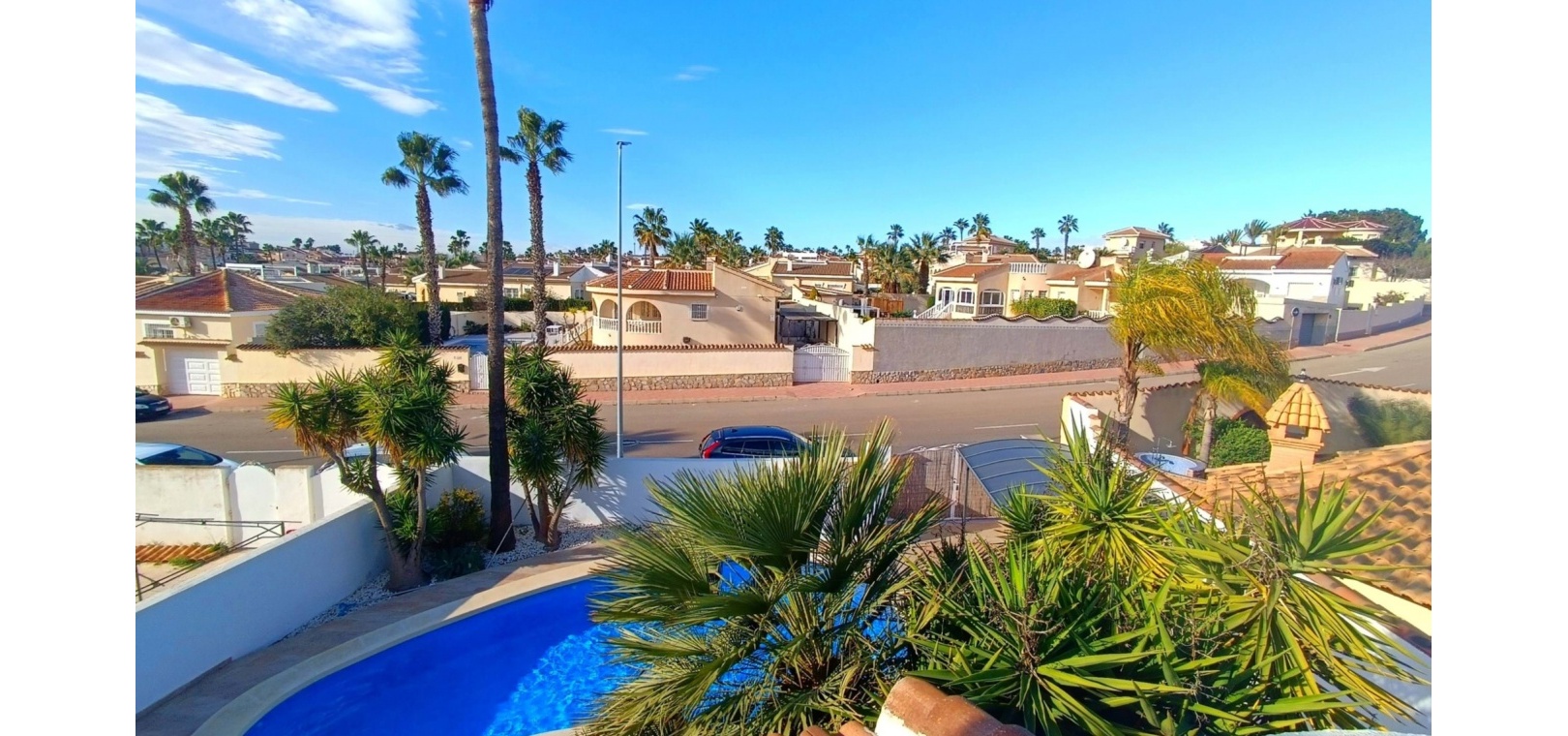 Vi är glada över att kunna presentera denna vackert renoverade fristående villa med 3 sovrum och 1,5 badrum, belägen i det mycket eftertraktade området La Fiesta, Ciudad Quesada. Detta fantastiska hem har totalförvandlats både inifrån och ut, och erbjuder modern komfort och stil genomgående. Beläget på en generös tomt på 384 m², välkomnar fastigheten dig med privata grindar som leder till en glittrande pool med jacuzzi, omgiven av flera utomhussittplatser och gott om förvaring. Den noggrant designade trädgården blandar kaklade och gröna ytor och skapar en lugn oas perfekt för avkoppling och underhållning. Entrén har en charmig, rund, täckt veranda, perfekt för att njuta av måltider utomhus eller underhålla medan du har utsikt över poolen och lummiga palmer. Inuti har det rymliga vardagsrummet och matsalen i öppen planlösning rikligt med naturligt ljus, sömlöst anslutet till ett moderniserat kök med grovkök och direkt tillgång till den bakre grillplatsen. Bottenvåningen har ett helt renoverat vardagsrum och matsal i öppen planlösning med fantastiskt kök som når trädgården på baksidan och har ett användbart grovkök, denna nivå innehåller också ett stort dubbelrum och en bekväm separat toalett. Gå upp för trappan med sina eleganta glaspaneler för att hitta ytterligare två generöst tilltagna dubbelrum och ett lyxigt familjebadrum. Det stora sovrummet har direkt tillgång till en privat terrass, perfekt för att njuta av det spanska solskenet. Denna villa är fullspäckad med extrafunktioner, inklusive ett förstklassigt larmsystem, mygggardiner, luftkonditionering i alla sovrum och loungen, en ny poolpump och mycket mer. Bekvämt beläget inom gångavstånd från lokala bekvämligheter, det är bara 5 minuters bilresa till golfbanan La Marquesa, 5 minuter till Quesada High Street och bara 8 minuter till de fantastiska stränderna i Guardamar del Segura.