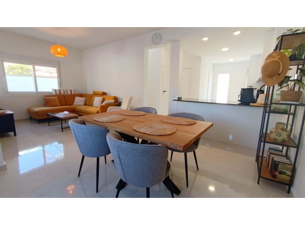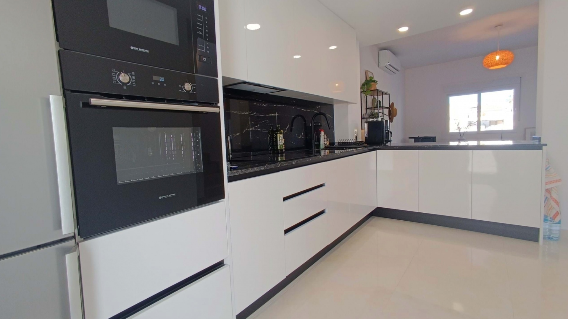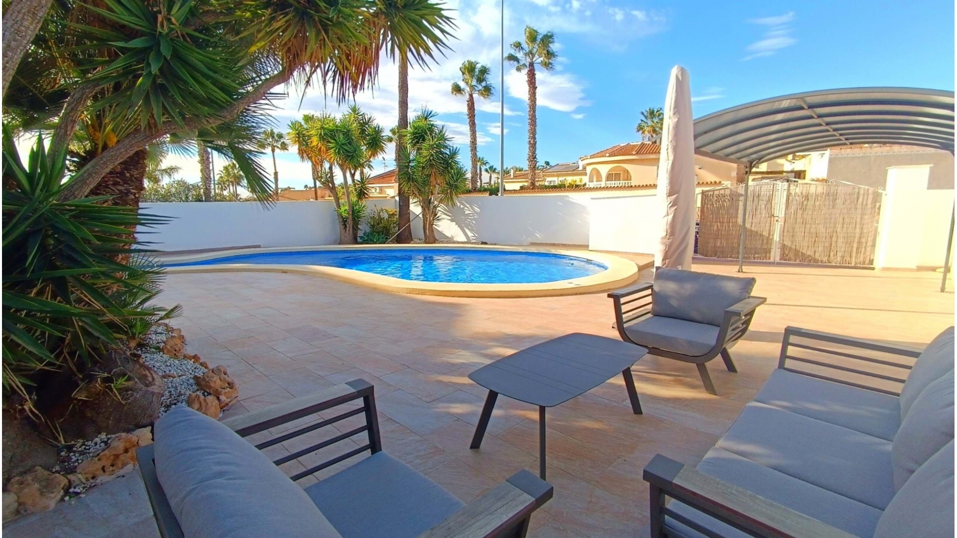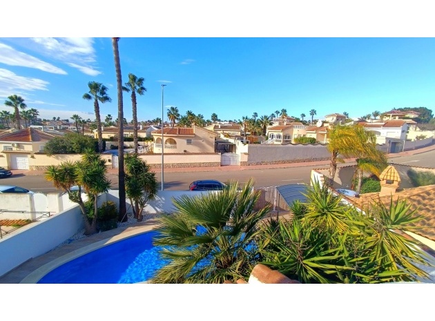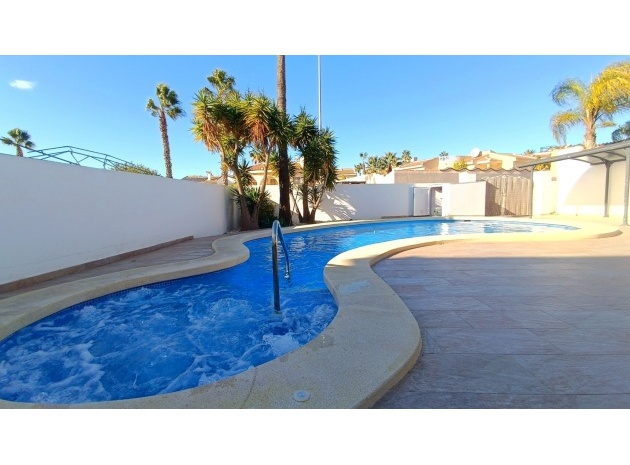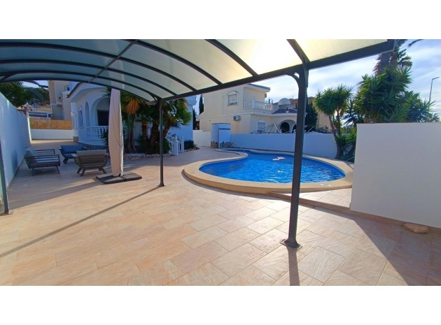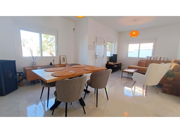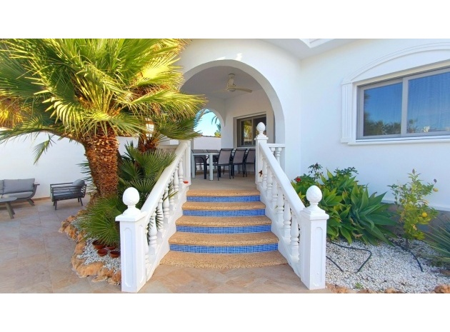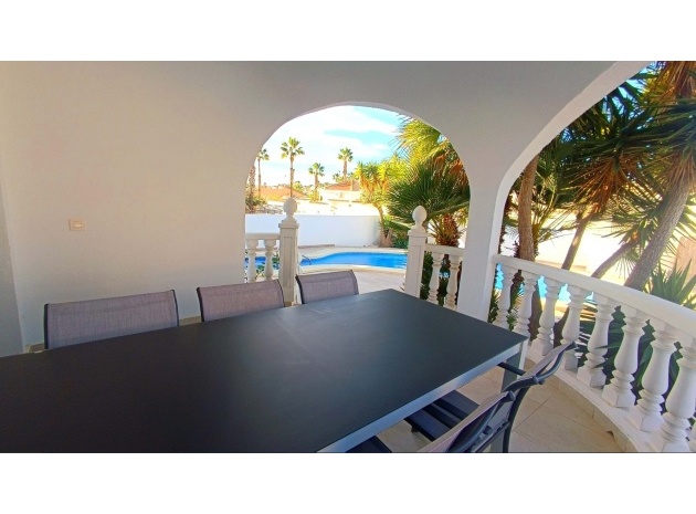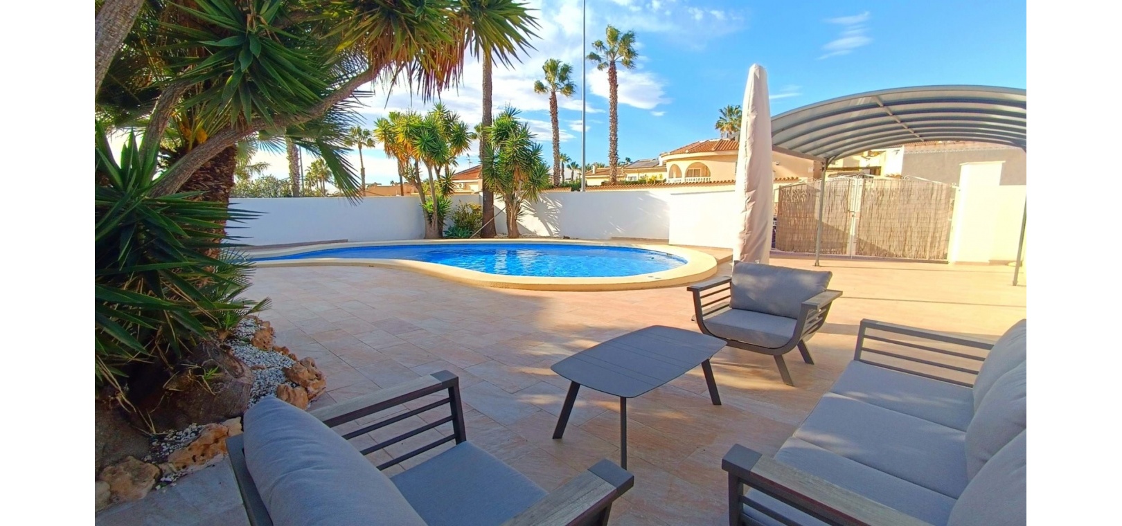 Vi är glada över att kunna presentera denna vackert renoverade fristående villa med 3 sovrum och 1,5 badrum, belägen i det mycket eftertraktade området La Fiesta, Ciudad Quesada. Detta fantastiska hem har totalförvandlats både inifrån och ut, och erbjuder modern komfort och stil genomgående. Beläget på en generös tomt på 384 m², välkomnar fastigheten dig med privata grindar som leder till en glittrande pool med jacuzzi, omgiven av flera utomhussittplatser och gott om förvaring. Den noggrant designade trädgården blandar kaklade och gröna ytor och skapar en lugn oas perfekt för avkoppling och underhållning. Entrén har en charmig, rund, täckt veranda, perfekt för att njuta av måltider utomhus eller underhålla medan du har utsikt över poolen och lummiga palmer. Inuti har det rymliga vardagsrummet och matsalen i öppen planlösning rikligt med naturligt ljus, sömlöst anslutet till ett moderniserat kök med grovkök och direkt tillgång till den bakre grillplatsen. Bottenvåningen har ett helt renoverat vardagsrum och matsal i öppen planlösning med fantastiskt kök som når trädgården på baksidan och har ett användbart grovkök, denna nivå innehåller också ett stort dubbelrum och en bekväm separat toalett. Gå upp för trappan med sina eleganta glaspaneler för att hitta ytterligare två generöst tilltagna dubbelrum och ett lyxigt familjebadrum. Det stora sovrummet har direkt tillgång till en privat terrass, perfekt för att njuta av det spanska solskenet. Denna villa är fullspäckad med extrafunktioner, inklusive ett förstklassigt larmsystem, mygggardiner, luftkonditionering i alla sovrum och loungen, en ny poolpump och mycket mer. Bekvämt beläget inom gångavstånd från lokala bekvämligheter, det är bara 5 minuters bilresa till golfbanan La Marquesa, 5 minuter till Quesada High Street och bara 8 minuter till de fantastiska stränderna i Guardamar del Segura.