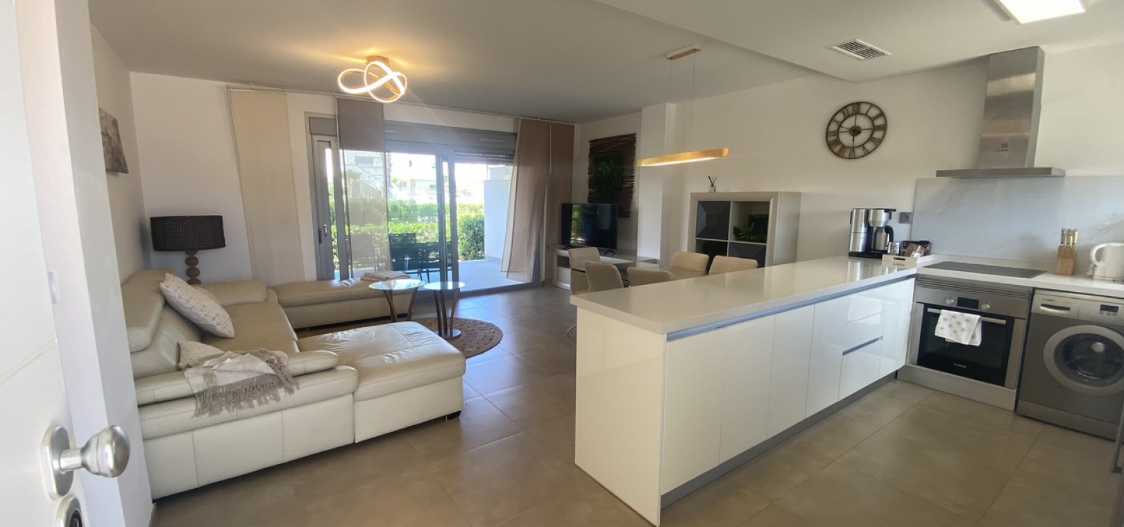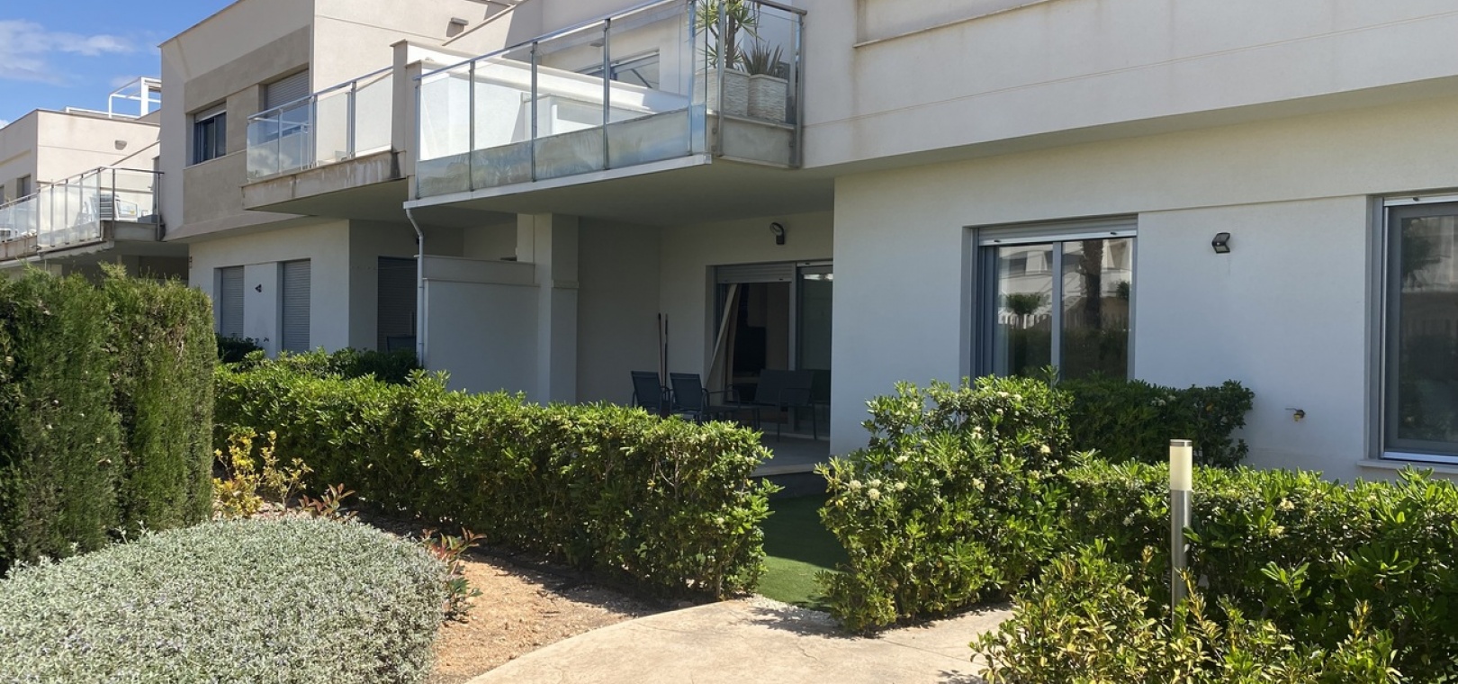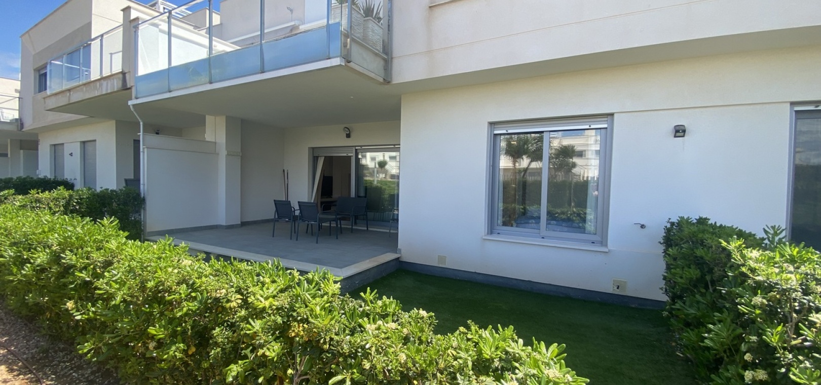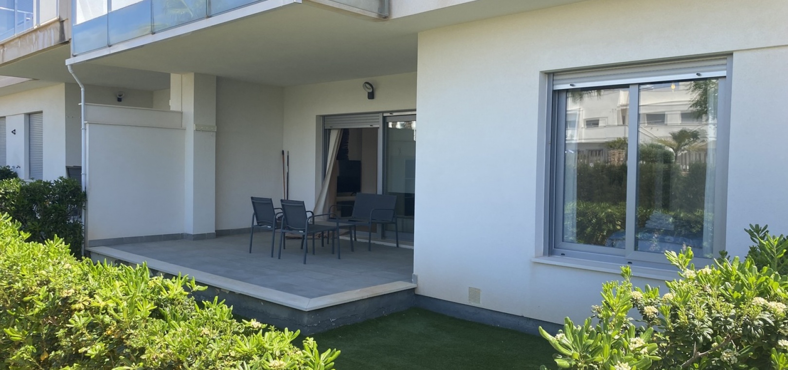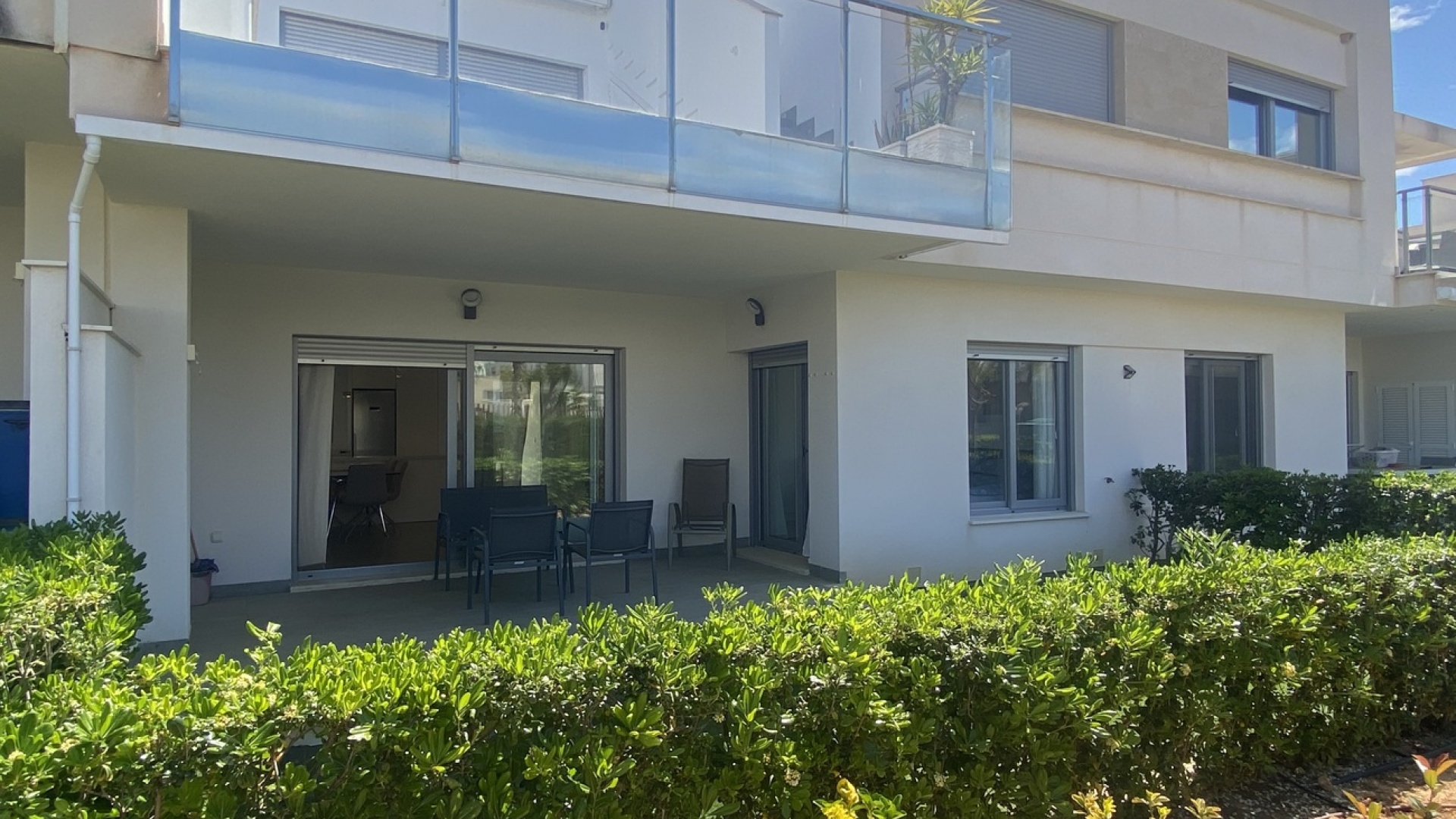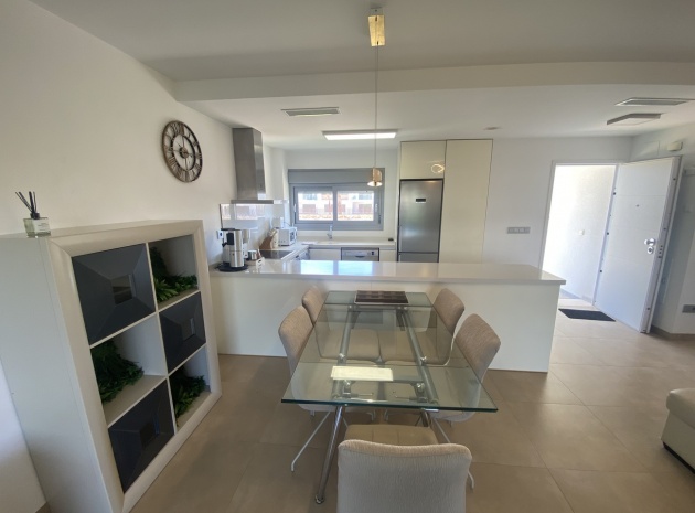 Belägen i den eftertraktade golforten Vistabella, denna oklanderligt underhållna lägenhet med 2 sovrum och 2 badrum exemplifierar symbolen för komfort och elegans. Vardagsrummet är mästerligt utformat med en öppen planlösning som harmoniserar avkoppling och funktionalitet, kompletterat med ett elegant modernt kök i amerikansk stil som är idealiskt för sammankomster och underhållning. Vart och ett av de två generöst tilltagna dubbelrummen är utrustade med inbyggda garderober, medan huvudsviten öppnar direkt mot den bakre terrassen och erbjuder en pittoresk utsikt över de noggrant anlagda trädgårdarna. Lägenheten förstärks ytterligare av rymliga inomhus- och utomhusutrymmen, inklusive en härlig framträdgård och en bakre trädgård som sömlöst ansluter till de välskötta gemensamma utrymmena och poolen. Dessutom är alla rum utrustade med både värme och luftkonditionering, vilket gör detta boende till ett utmärkt val för komfort året runt, avkopplande semester eller en lukrativ investering. Denna plats ligger inom bekvämt promenadavstånd och erbjuder en mängd faciliteter inklusive restauranger, butiker, en golfklubb och olika fritidssysselsättningar. Ta vara på detta exceptionella tillfälle att förvärva en sofistikerad och anpassningsbar fastighet inom det prestigefyllda Vistabella Golf-communityt.