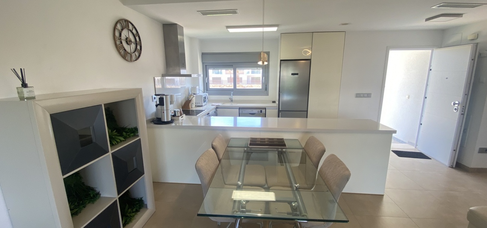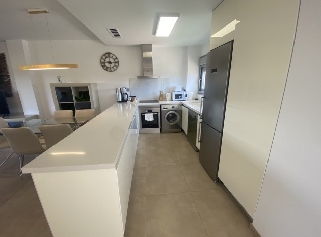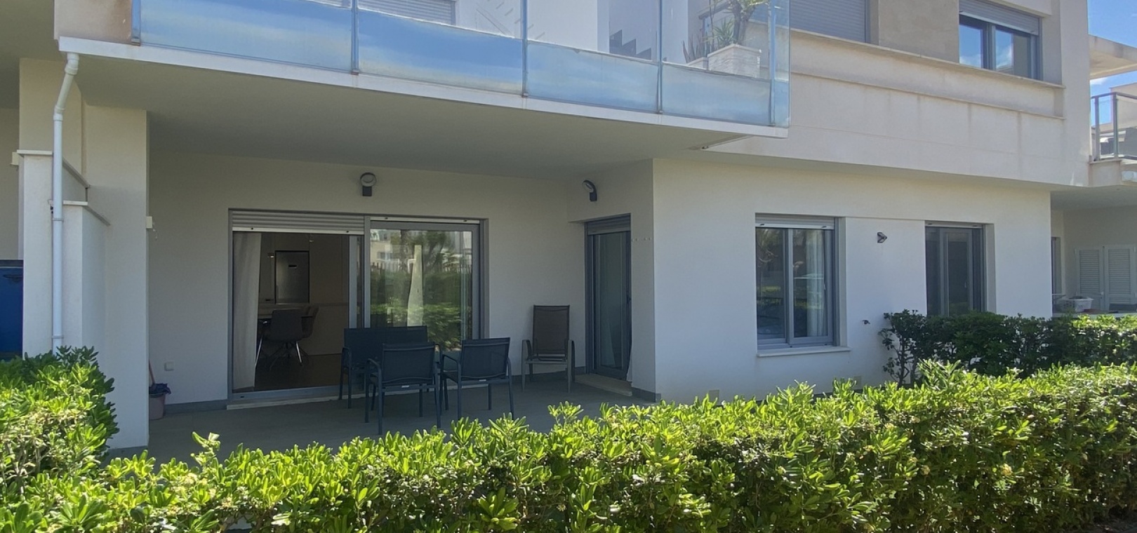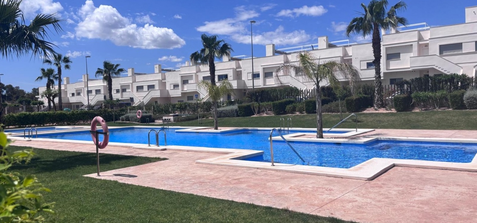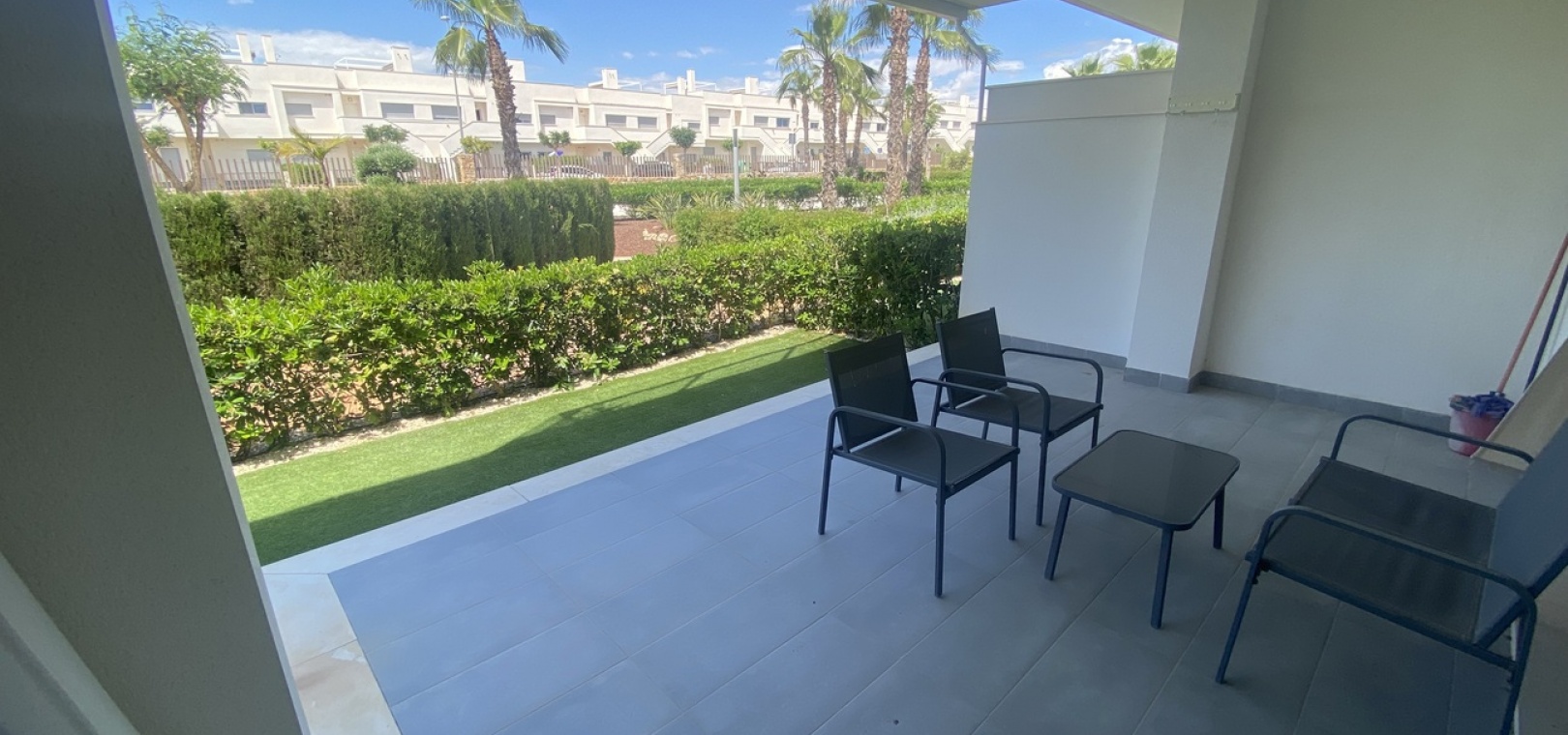 Belägen i den eftertraktade golforten Vistabella, denna oklanderligt underhållna lägenhet med 2 sovrum och 2 badrum exemplifierar symbolen för komfort och elegans. Vardagsrummet är mästerligt utformat med en öppen planlösning som harmoniserar avkoppling och funktionalitet, kompletterat med ett elegant modernt kök i amerikansk stil som är idealiskt för sammankomster och underhållning. Vart och ett av de två generöst tilltagna dubbelrummen är utrustade med inbyggda garderober, medan huvudsviten öppnar direkt mot den bakre terrassen och erbjuder en pittoresk utsikt över de noggrant anlagda trädgårdarna. Lägenheten förstärks ytterligare av rymliga inomhus- och utomhusutrymmen, inklusive en härlig framträdgård och en bakre trädgård som sömlöst ansluter till de välskötta gemensamma utrymmena och poolen. Dessutom är alla rum utrustade med både värme och luftkonditionering, vilket gör detta boende till ett utmärkt val för komfort året runt, avkopplande semester eller en lukrativ investering. Denna plats ligger inom bekvämt promenadavstånd och erbjuder en mängd faciliteter inklusive restauranger, butiker, en golfklubb och olika fritidssysselsättningar. Ta vara på detta exceptionella tillfälle att förvärva en sofistikerad och anpassningsbar fastighet inom det prestigefyllda Vistabella Golf-communityt.