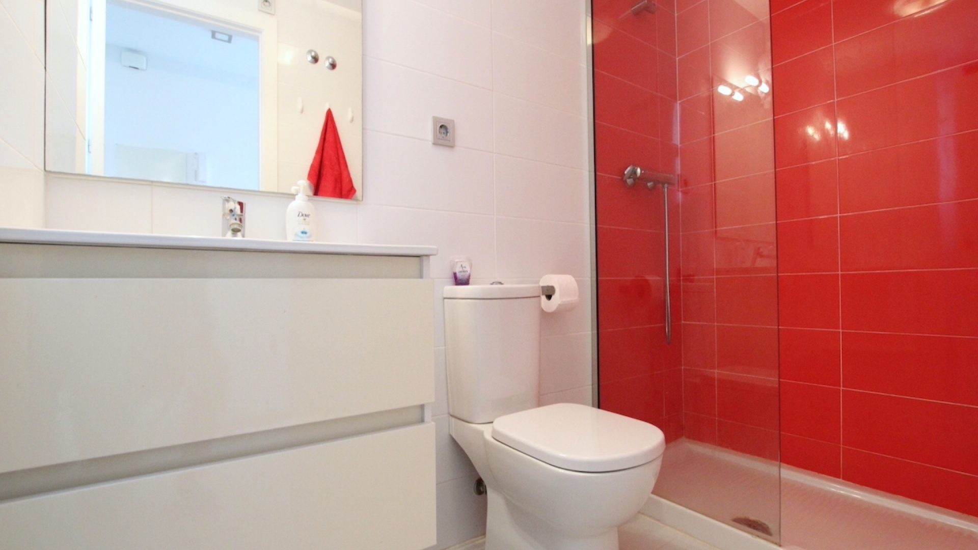 Det finns två sovrum med dubbelsäng på denna våning (ett med inbyggd garderob och luftkonditionering). Sovrummen har ett lika imponerande familjebadrum med duschkabin.