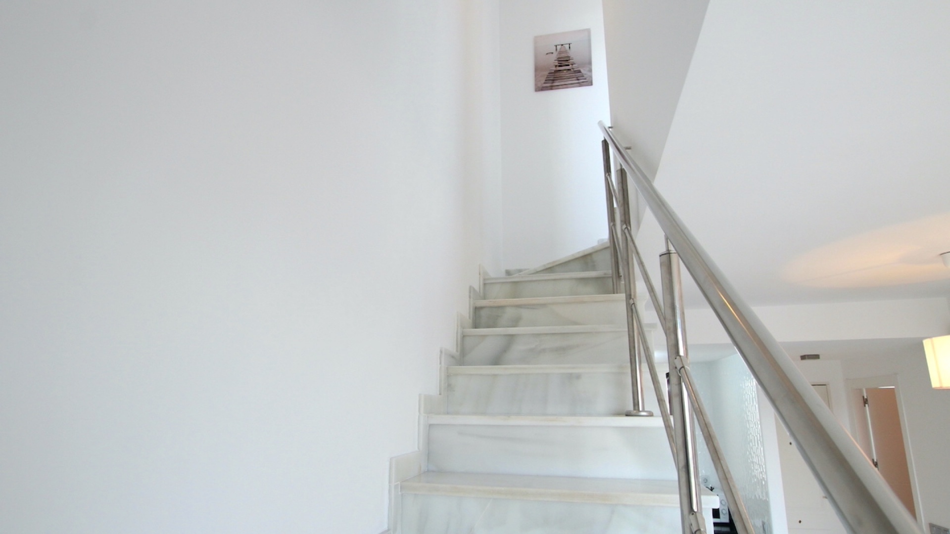 En elegant trappa leder upp till andra våningen där du har ett rymligt sovrum med luftkonditionering och dubbelgarderob. Detta sovrum har tillgång till ett eget duschrum.