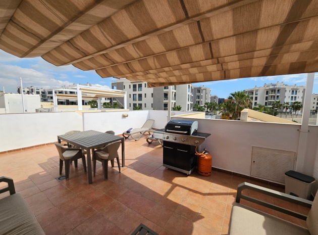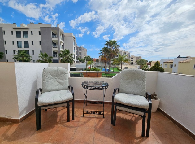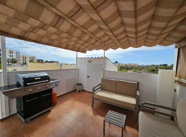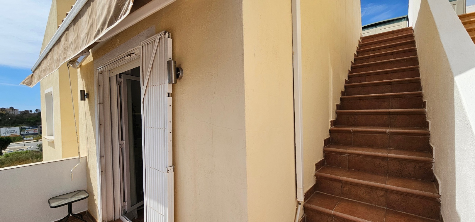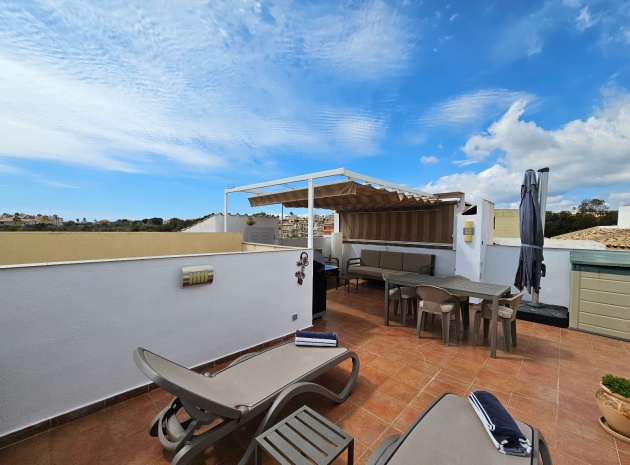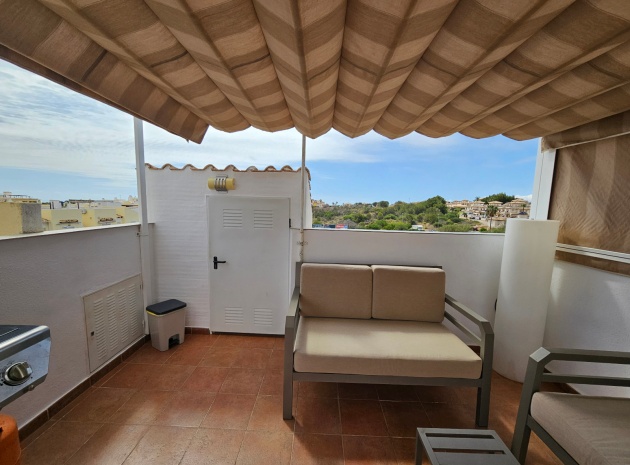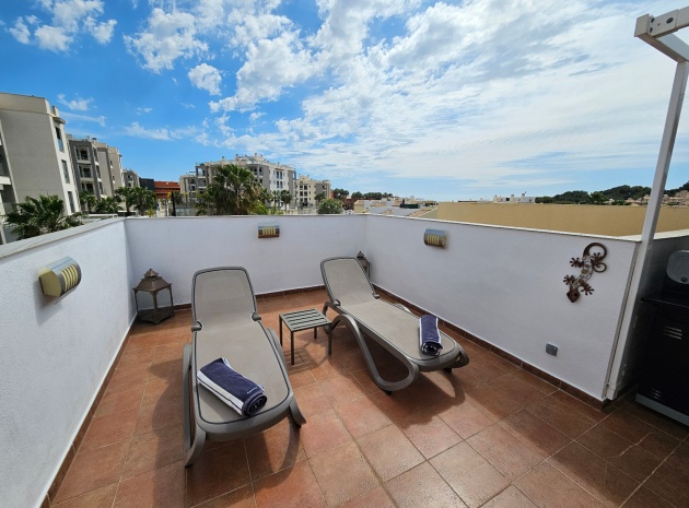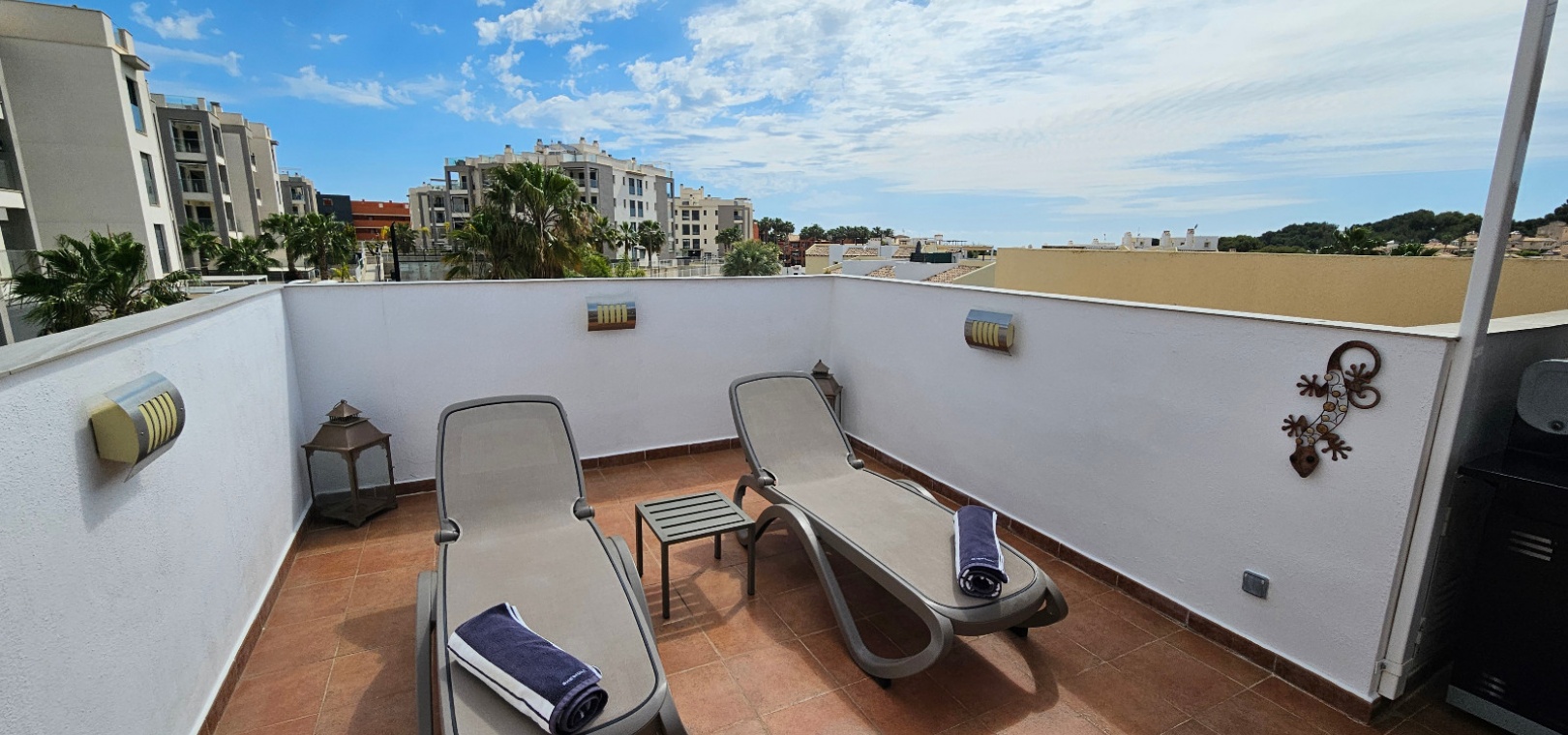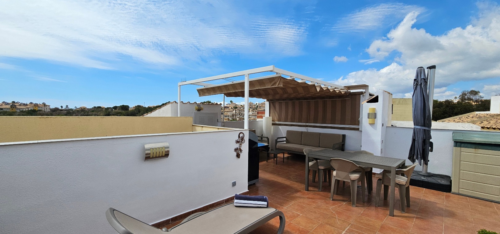 En hörnlägenhet med 2 sovrum och 2 badrum i sydostläge på översta våningen med ett stort privat takterrass, belägen i Panorama Golf, Villamartin, Costa Blanca Södra.