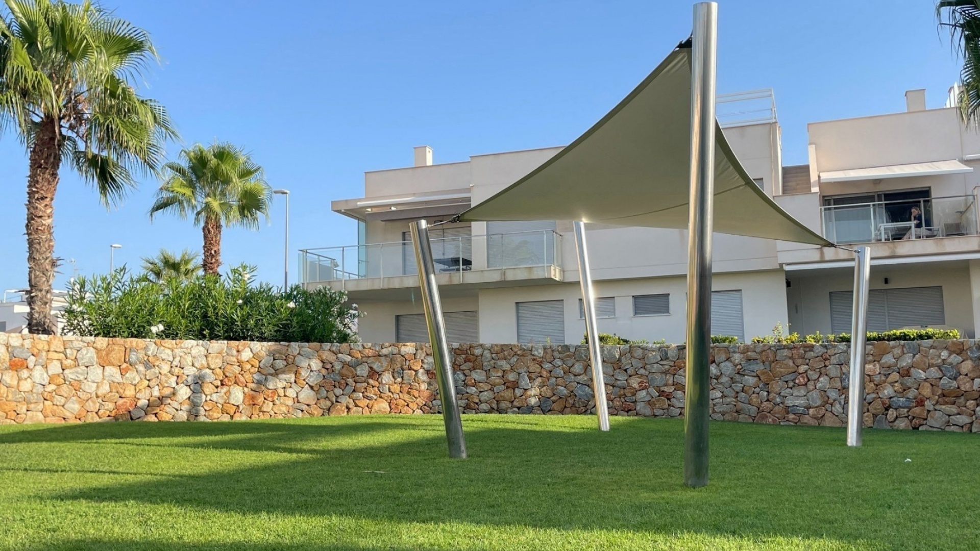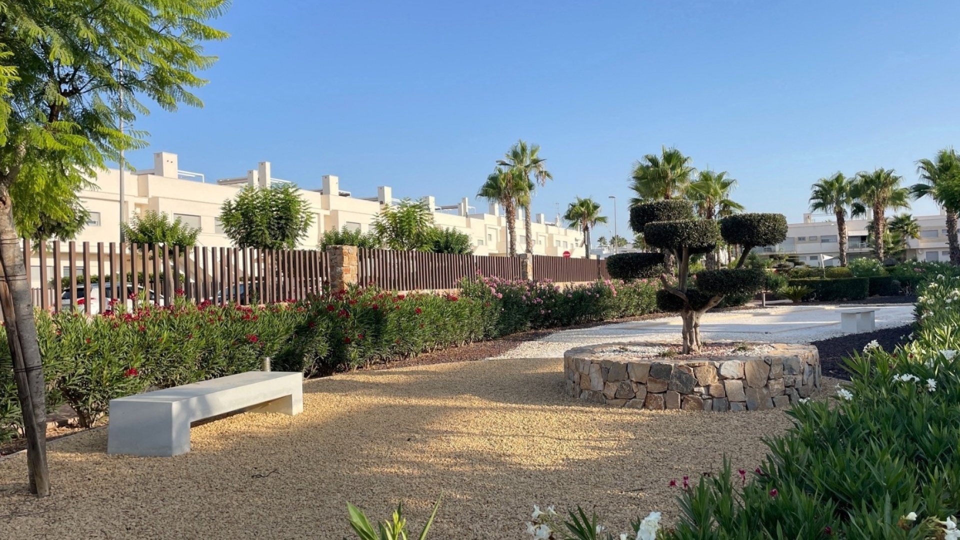 En av huvudfunktionerna i detta komplex är dess gemensamma utrymmen, som är särskilt stora, gröna och luftiga, med en boulebana och en fantastisk gemensam pool omgiven av gräsmattor och parasoller.
