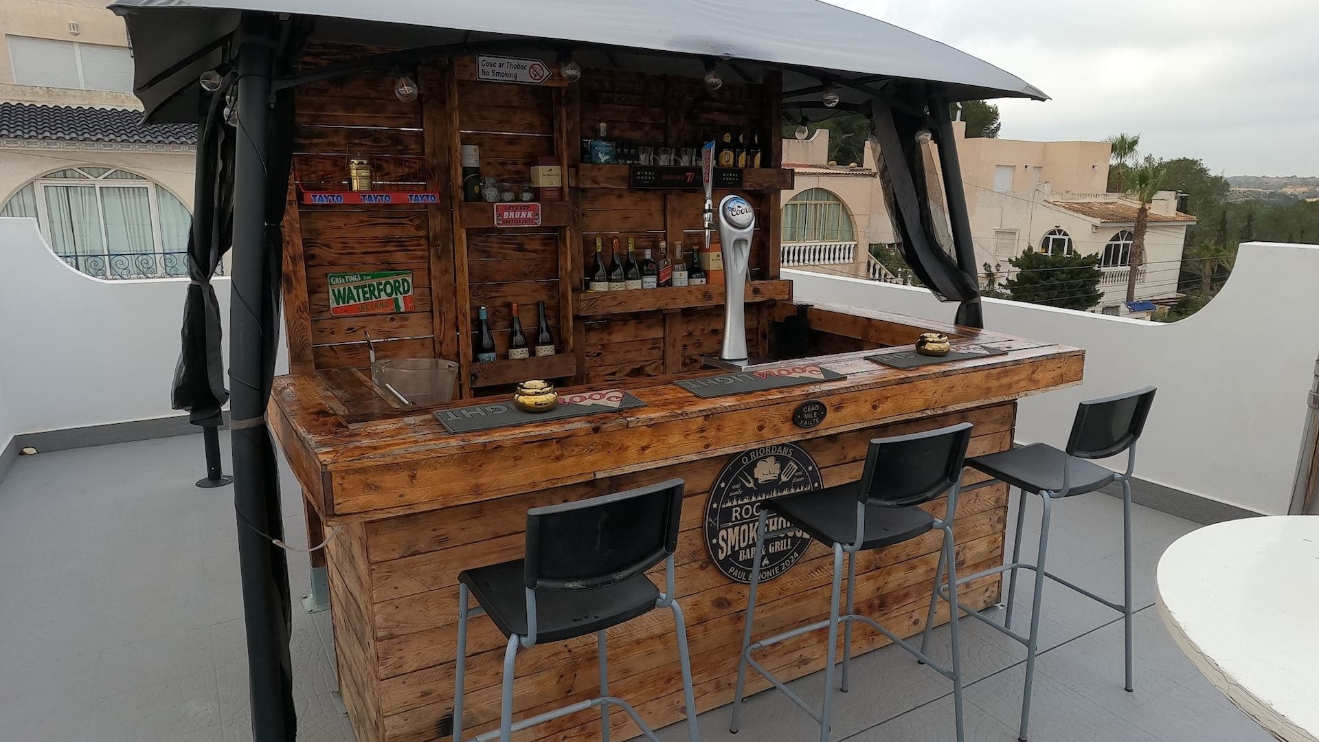 Denna oklanderligt presenterade villa är nu till salu! Trappa leder upp till ytterdörren och du kommer in i ett stort, ljust öppet utrymme. På entréplanet finns ett stort vardagsrum/matsal med öppet kök och ett duschrum. Vardagsrummet har en nyinstallerad mediavägg med funktionell belysning och en fristående braskamin för de kallare månaderna. Det finns fjärrstyrda fläktar och med öppningar på vardera sidan av utrymmet har luftkonditionering inte varit nödvändig. Terrassdörrarna från matsalen och köket öppnar upp mot en vacker terrass med havsutsikt. Det finns en spiraltrappa som leder upp till ett stort privat solarium med bar och sittplatser. Härifrån kan du njuta av din dryck eller dryck och njuta av panoramautsikten över närområdet, havet och saltsjön.