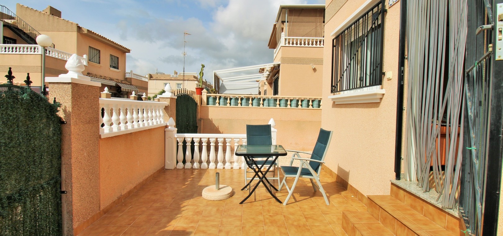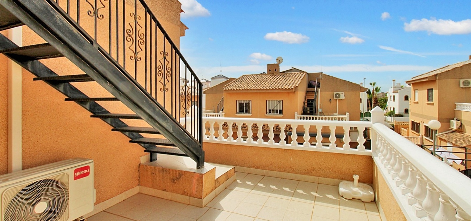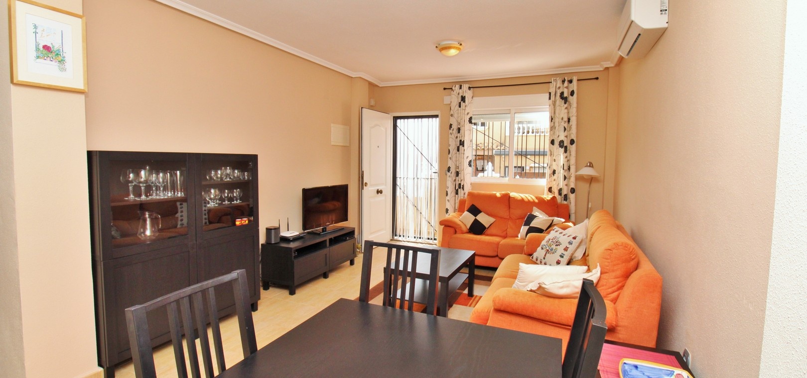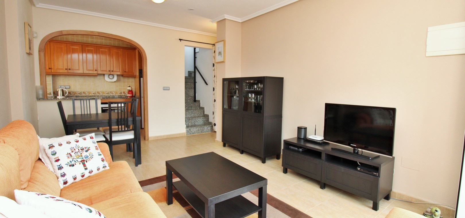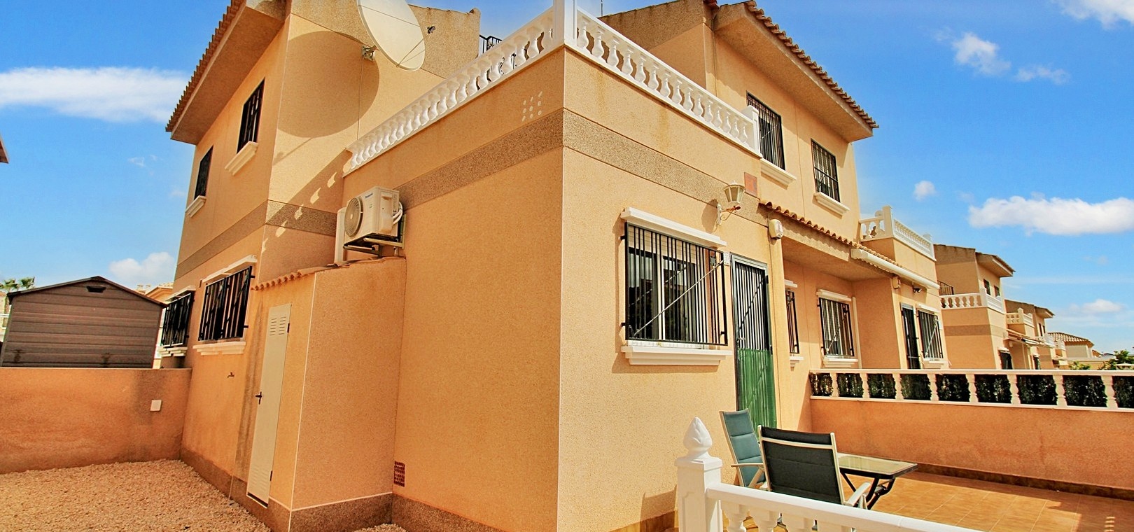 Detta ljusa och rymliga fyrbäddshus med tre sovrum ligger i det populära Pau 8-området i Villamartin, bara en kort promenad från det berömda Villamartin Plaza och golfbanan. Fastigheten har ägts av samma familj sedan den byggdes och har omsorgsfullt underhållits och erbjuder en välkomnande planlösning med utmärkta utomhusutrymmen. Beläget på en tomt i sydostläge har huset en L-formad trädgård med en grindad uppfart, externt förråd, en balkong på första våningen och ett privat takterrass – perfekt för att njuta av solen hela dagen. Bottenvåningen består av ett bekvämt vardagsrum och matplats med ett öppet kök och angränsande tvättstuga, ett sovrum med dubbelsäng, ett modernt badrum med duschkabin och ett praktiskt förvaringsskåp under trappan. På övervåningen finns ytterligare två sovrum med inbyggda garderober, ett familjebadrum och tillgång till en solig balkong som leder upp till takterrassen. Fastigheten säljs möblerad, inklusive vitvaror och luftkonditionering. Den ingår i ett välskött bostadsområde med en gemensam pool i närheten. Bara 900 meter från Villamartin Plaza, med sitt breda utbud av restauranger, barer och en stormarknad, och under tio minuters bilresa till stränderna i Orihuela Costa och köpcentret Zenia Boulevard. Ett idealiskt alternativ för heltidsboende eller som ett lättskött fritidshus. Tidig visning rekommenderas.