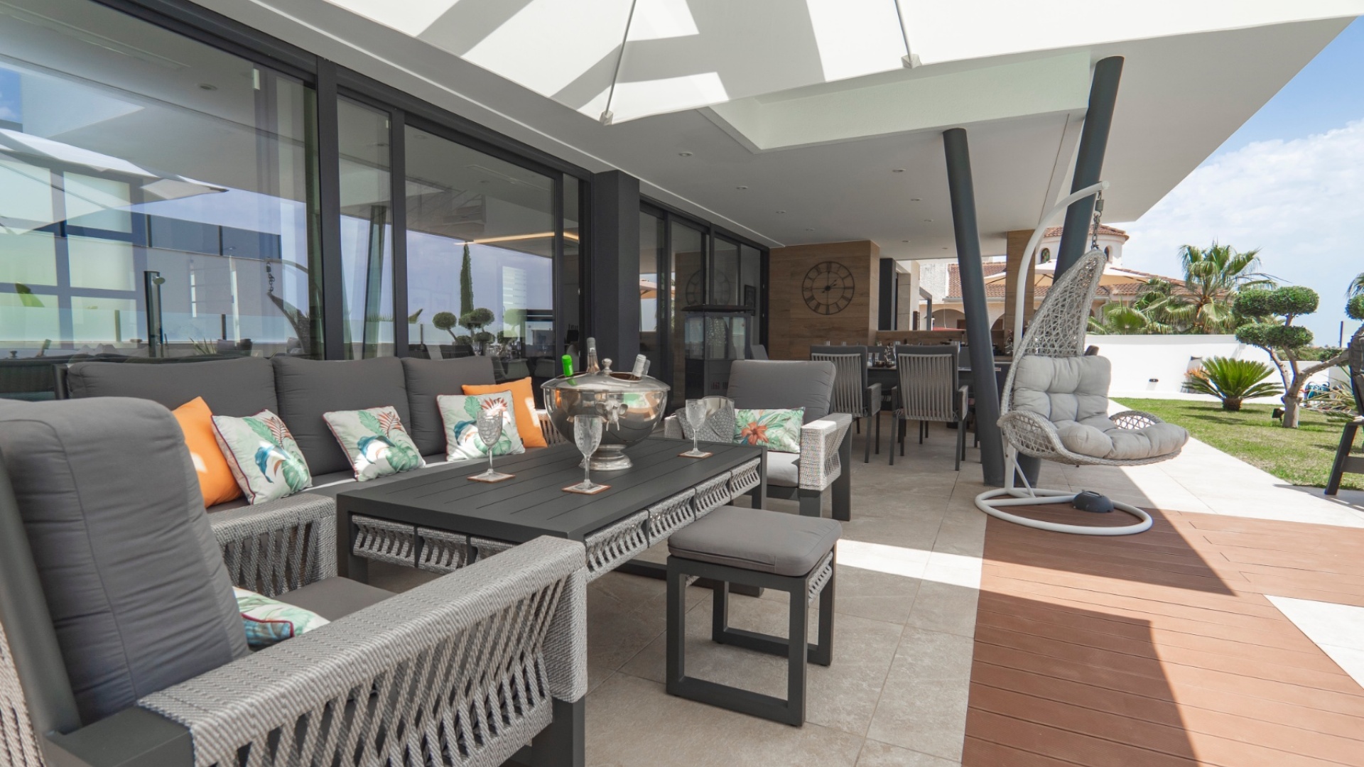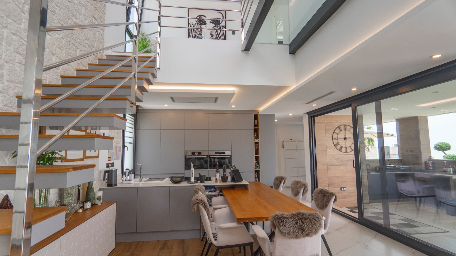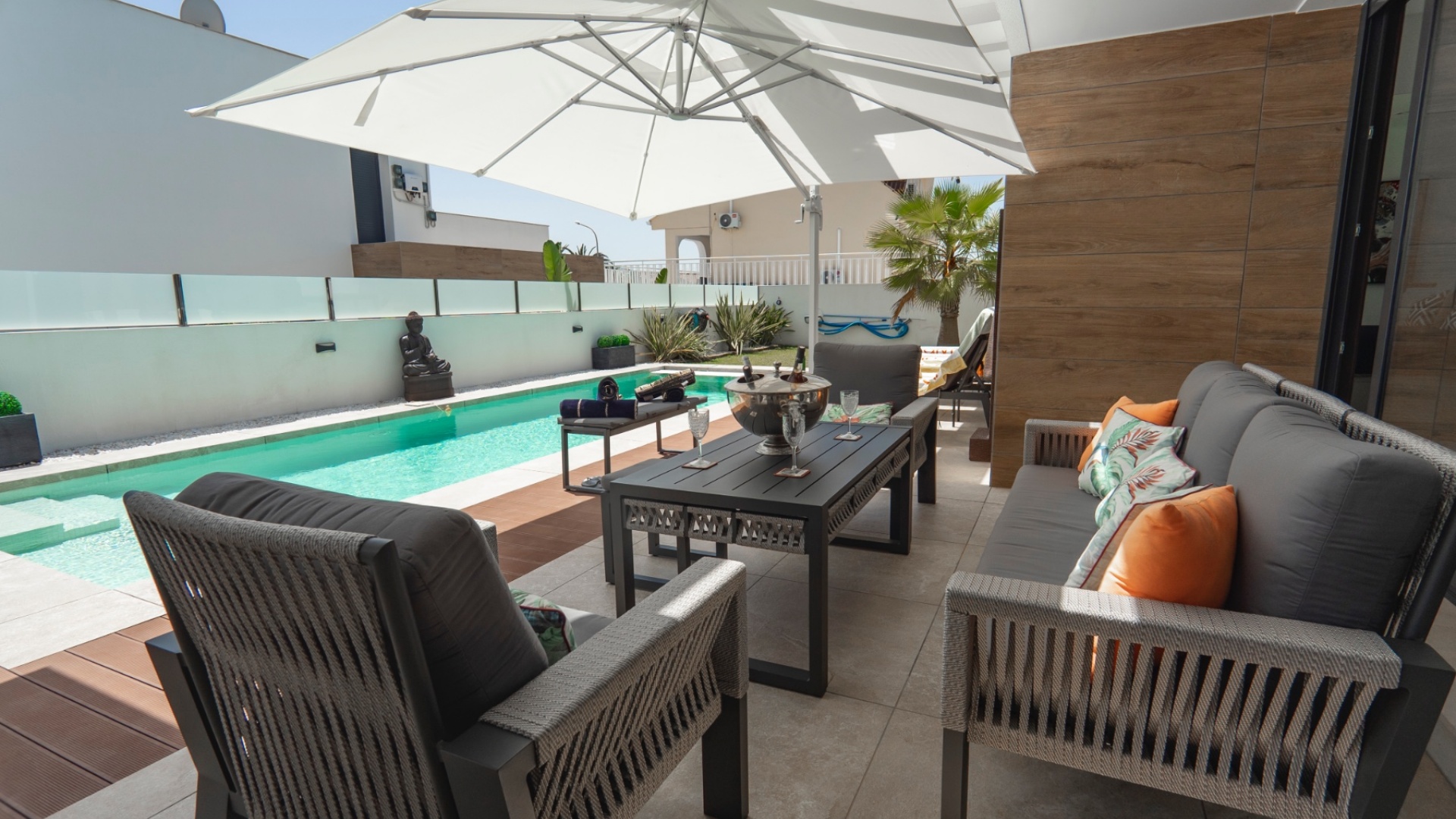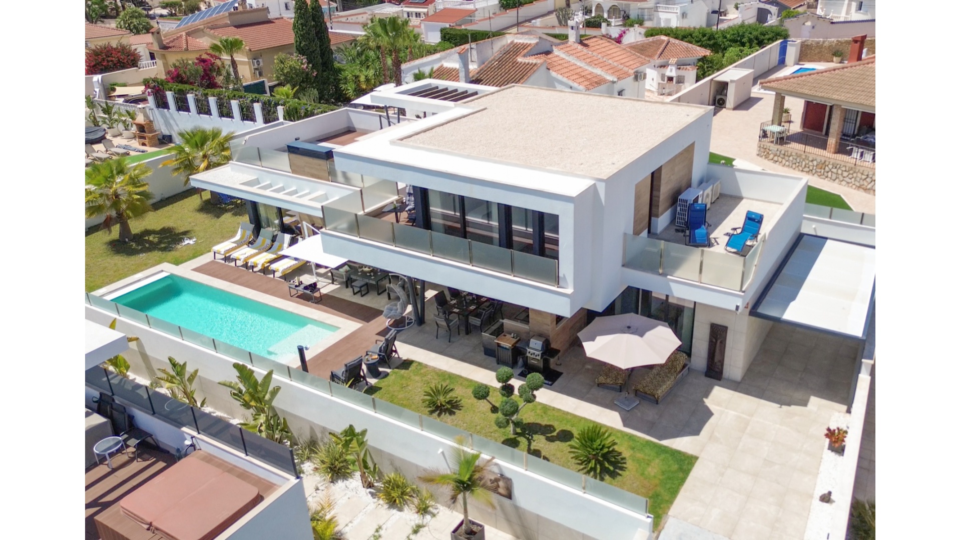 Belägen i hjärtat av Ciudad Quesada erbjuder denna utsökta villa i söderläge en harmonisk blandning av lyx och bekvämlighet. Med fyra rymliga sovrum och fyra moderna badrum är fastigheten utformad för bekvämt familjeliv. Dess utmärkta läge garanterar enkel tillgång till lokala bekvämligheter, inklusive butiker, restauranger och fritidsanläggningar. Villan har en modern öppen planlösning som sömlöst ansluter till ett toppmodernt kök utrustat med avancerade vitvaror. Stora fönster översvämmar utrymmet med naturligt ljus, vilket skapar en varm och inbjudande atmosfär. Varje sovrum är omsorgsfullt utformat och erbjuder gott om förvaring och eget badrum, vilket garanterar avskildhet och komfort för alla boende. Utanför har fastigheten en privat pool omgiven av en vackert anlagd trädgård, perfekt för avkoppling och underhållning av gäster. Ytterligare funktioner inkluderar ett rymligt garage, golvvärme och ett takterrass med panoramautsikt över omgivningarna. Denna villa är ett perfekt exempel på lyxigt boende i en av Costa Blancas mest eftertraktade områden. Nyckelfunktioner: 4 rymliga sovrum med 4 badrum varav 3 har eget badrum Privat pool och anlagd trädgård Modernt vardagsrum och matplats i öppen planlösning Fullt utrustat modernt kök Golvvärme i hela fastigheten Takterrass med panoramautsikt Rymlig parkering med privat uppfart Utmärkt läge i Ciudad Quesada centrum För mer information eller för att boka en visning, vänligen kontakta Petra Honig på info@petrahonig.com eller ring +34 966 718 006.