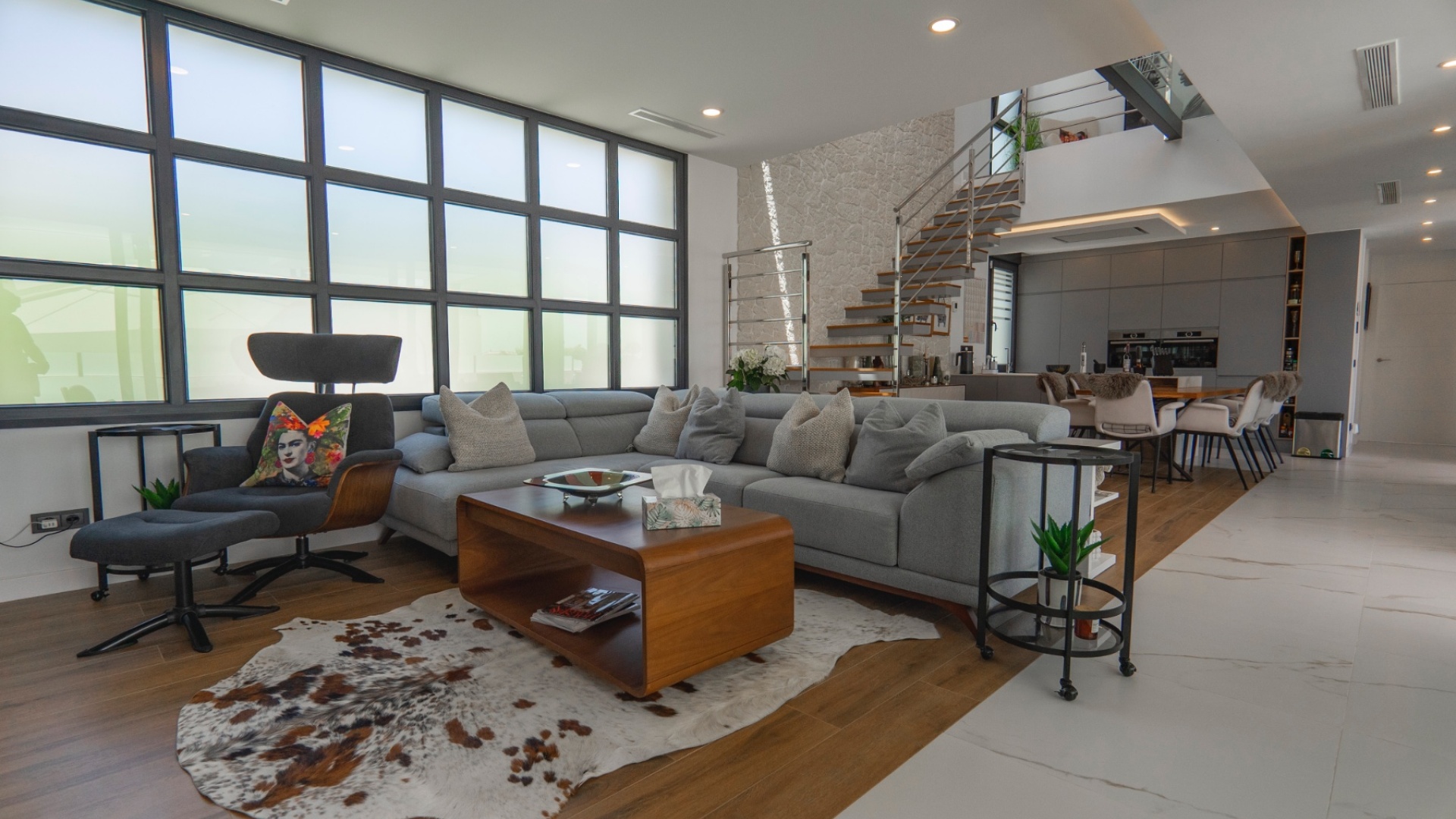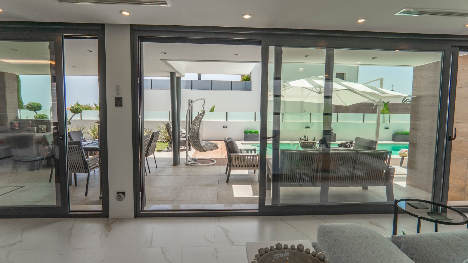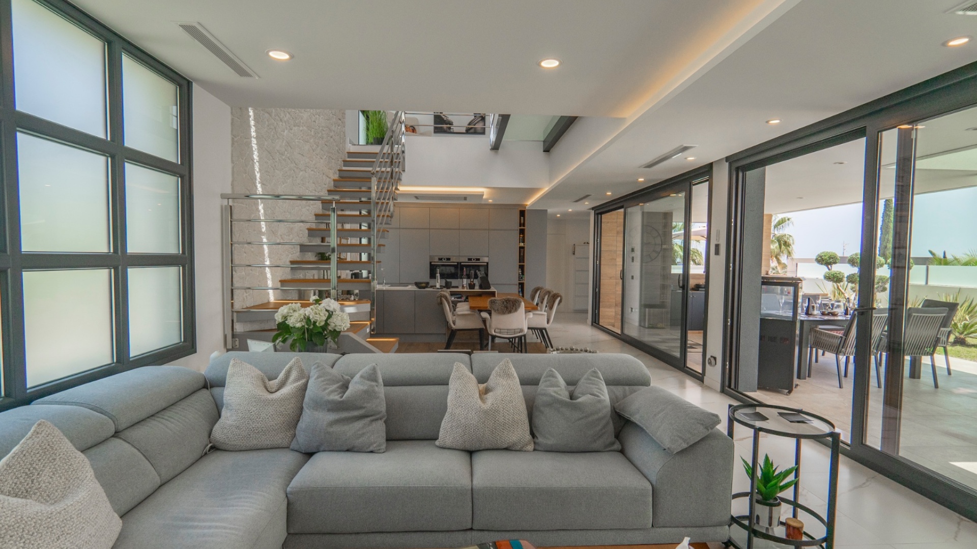 Belägen i hjärtat av Ciudad Quesada erbjuder denna utsökta villa i söderläge en harmonisk blandning av lyx och bekvämlighet. Med fyra rymliga sovrum och fyra moderna badrum är fastigheten utformad för bekvämt familjeliv. Dess utmärkta läge garanterar enkel tillgång till lokala bekvämligheter, inklusive butiker, restauranger och fritidsanläggningar. Villan har en modern öppen planlösning som sömlöst ansluter till ett toppmodernt kök utrustat med avancerade vitvaror. Stora fönster översvämmar utrymmet med naturligt ljus, vilket skapar en varm och inbjudande atmosfär. Varje sovrum är omsorgsfullt utformat och erbjuder gott om förvaring och eget badrum, vilket garanterar avskildhet och komfort för alla boende. Utanför har fastigheten en privat pool omgiven av en vackert anlagd trädgård, perfekt för avkoppling och underhållning av gäster. Ytterligare funktioner inkluderar ett rymligt garage, golvvärme och ett takterrass med panoramautsikt över omgivningarna. Denna villa är ett perfekt exempel på lyxigt boende i en av Costa Blancas mest eftertraktade områden. Nyckelfunktioner: 4 rymliga sovrum med 4 badrum varav 3 har eget badrum Privat pool och anlagd trädgård Modernt vardagsrum och matplats i öppen planlösning Fullt utrustat modernt kök Golvvärme i hela fastigheten Takterrass med panoramautsikt Rymlig parkering med privat uppfart Utmärkt läge i Ciudad Quesada centrum För mer information eller för att boka en visning, vänligen kontakta Petra Honig på info@petrahonig.com eller ring +34 966 718 006.