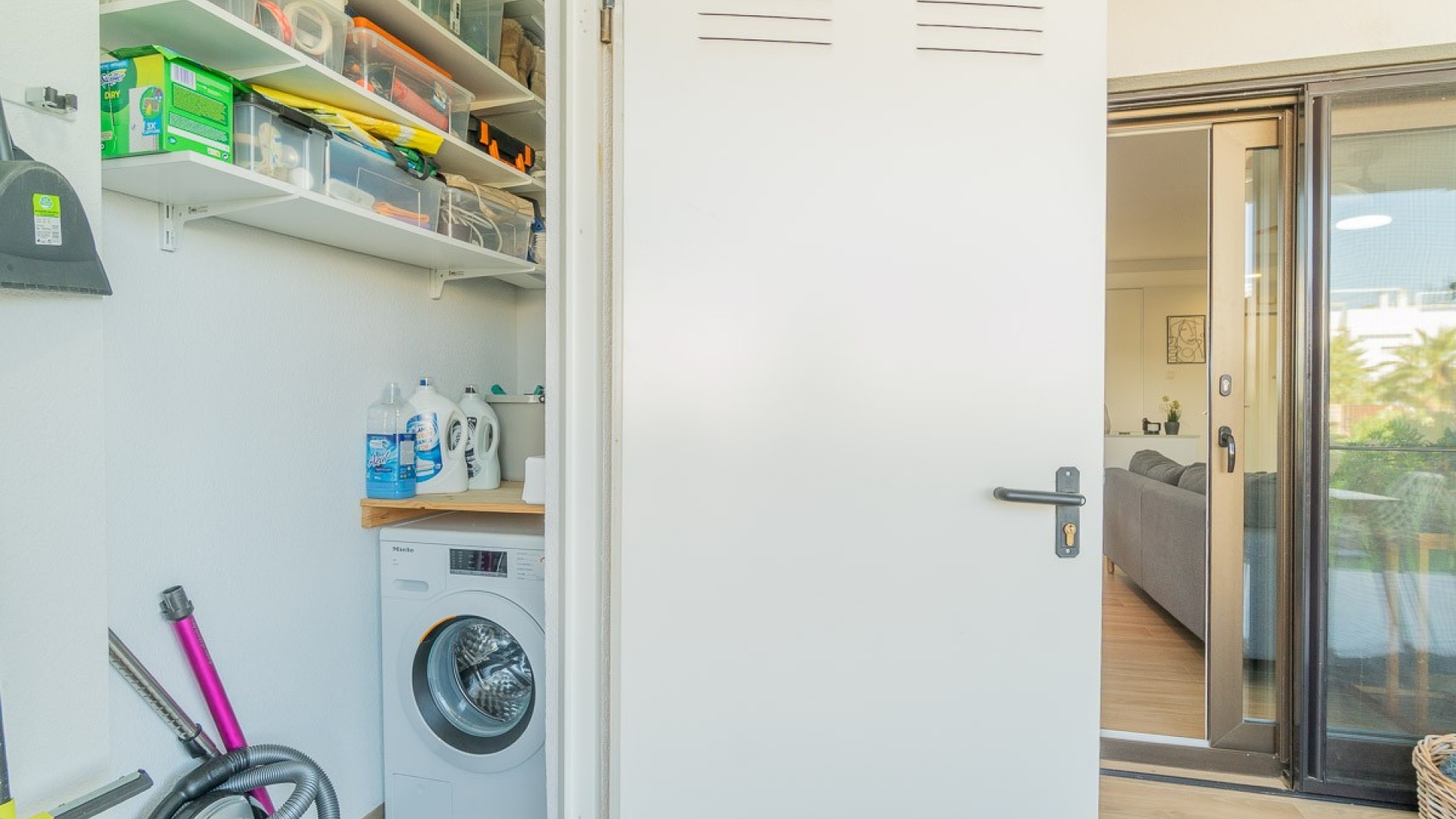 - Tvättstuga utomhus med tvättmaskin och förvaringsutrymme