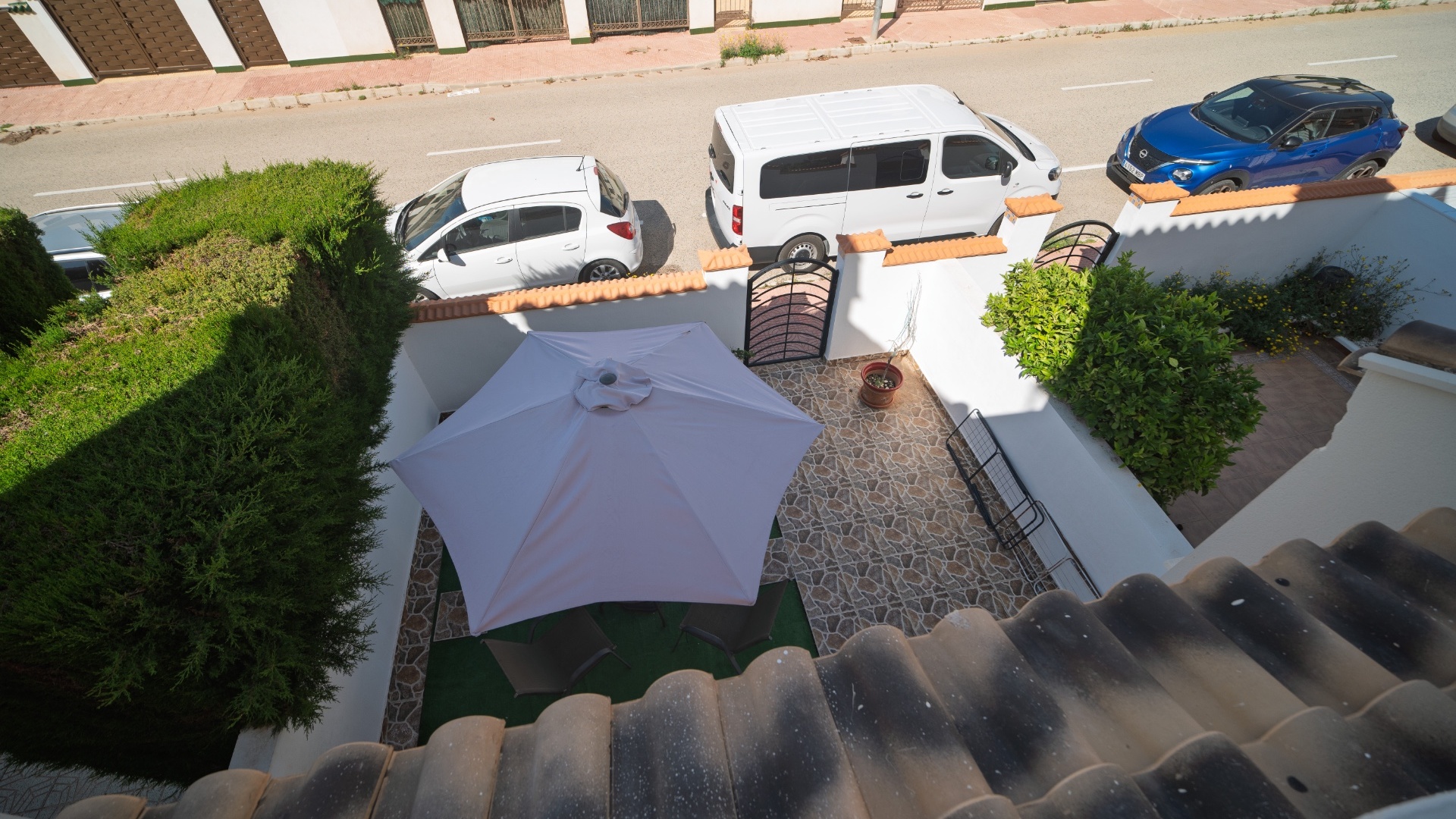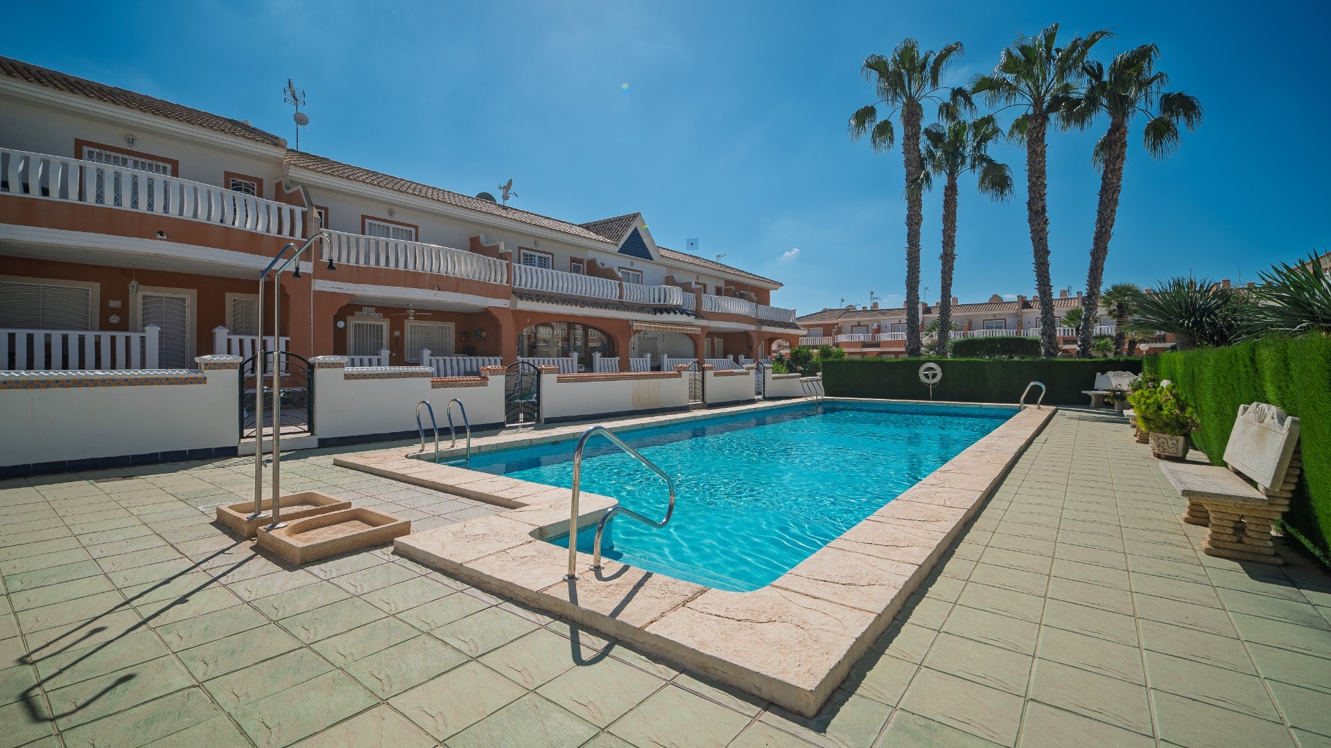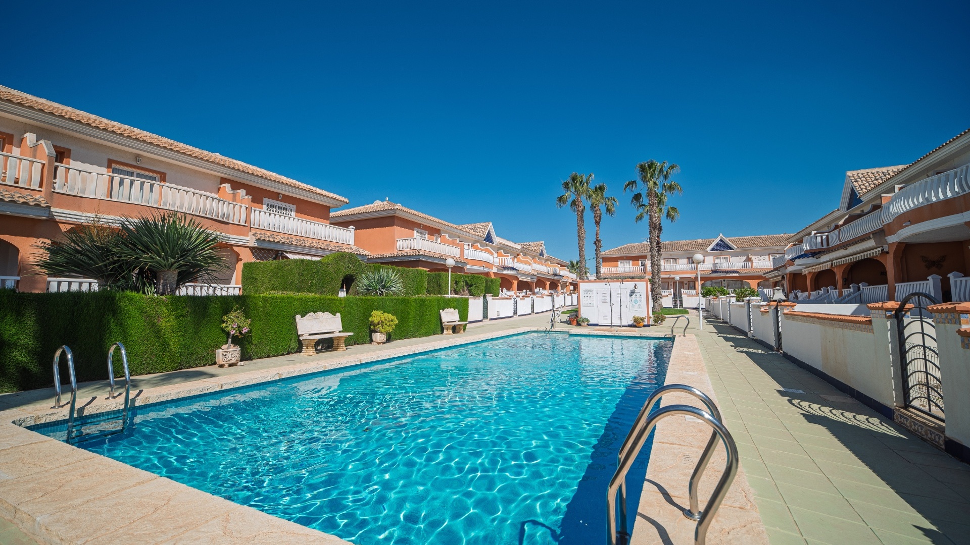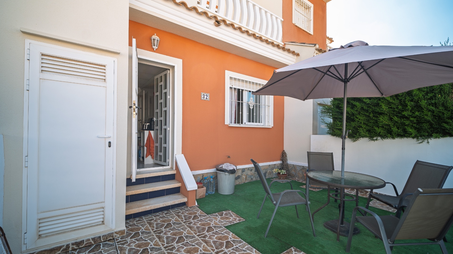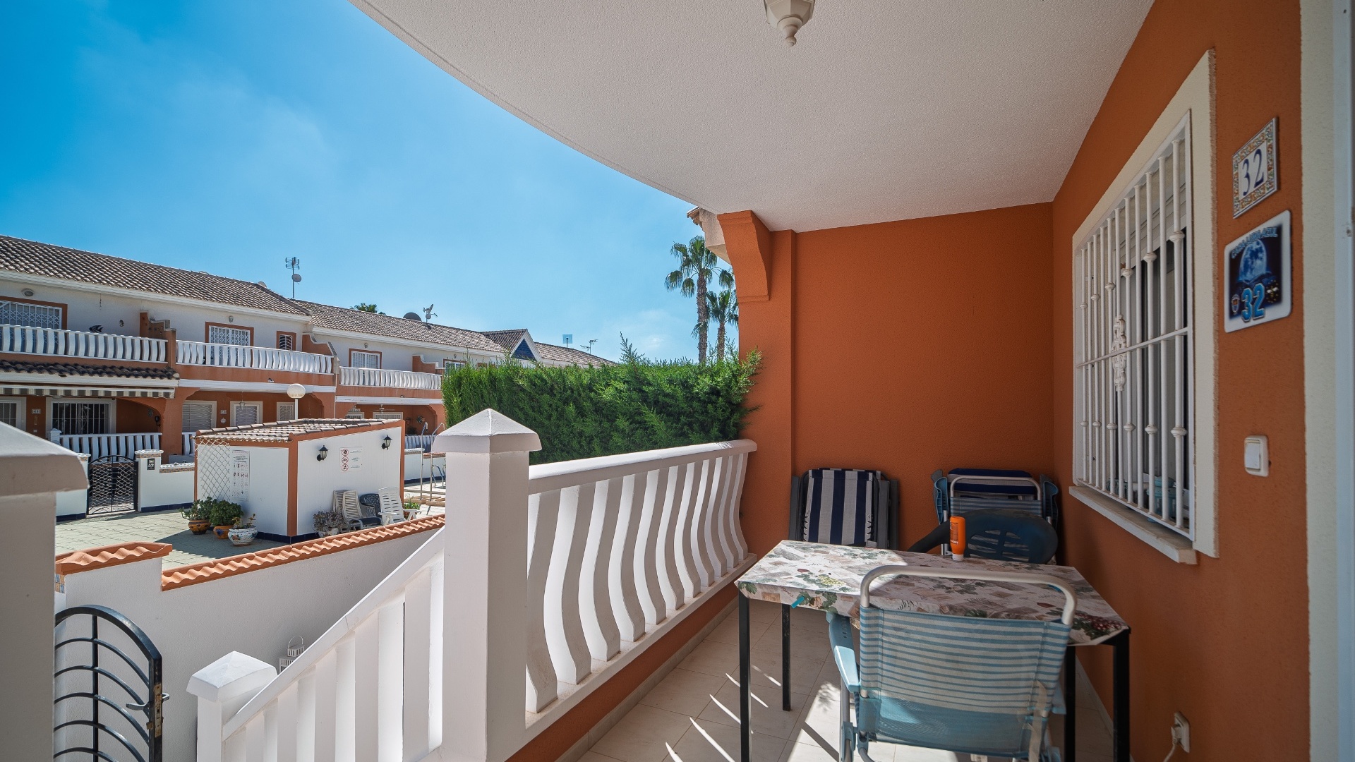 Detta välskötta radhus i Lola-stil med 3 sovrum erbjuder bekvämt boende i två våningar. Bottenvåningen har ett rymligt och ljust vardagsrum, ett gästrum, ett duschrum och ett helt separat kök. Fastigheten har en trädgård på framsidan med utsikt över det gemensamma poolområdet, perfekt för avkoppling eller underhållning, medan bakgården vetter mot vägen och ger extra utomhusutrymme. På övervåningen hittar du sovrummet med tillgång till en privat balkong, ett andra gästrum och ett familjebadrum. Detta vackra hem erbjuder en fantastisk kombination av utrymme, bekvämlighet och läge – perfekt som semesterboende, investering eller heltidsbostad.