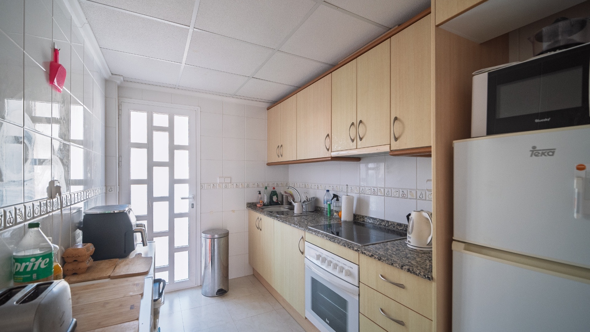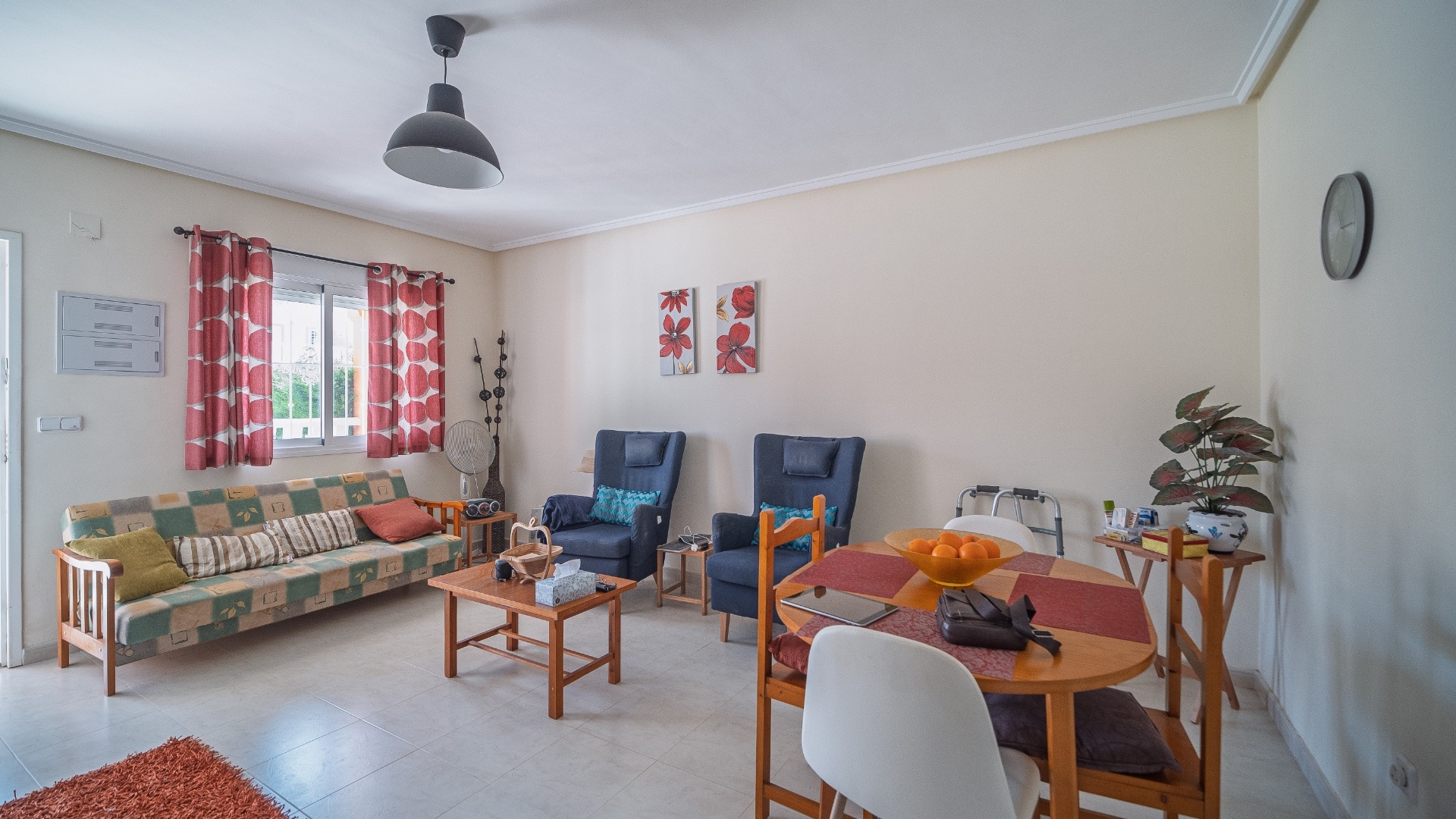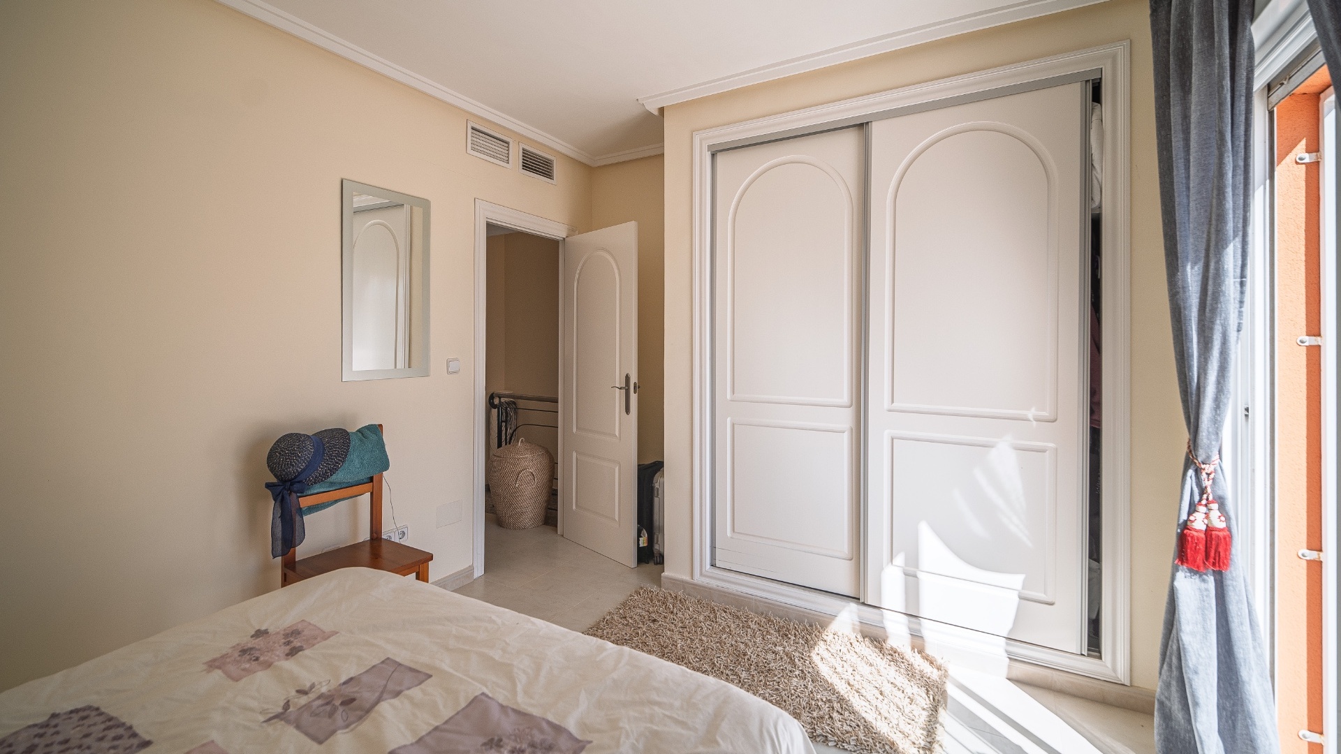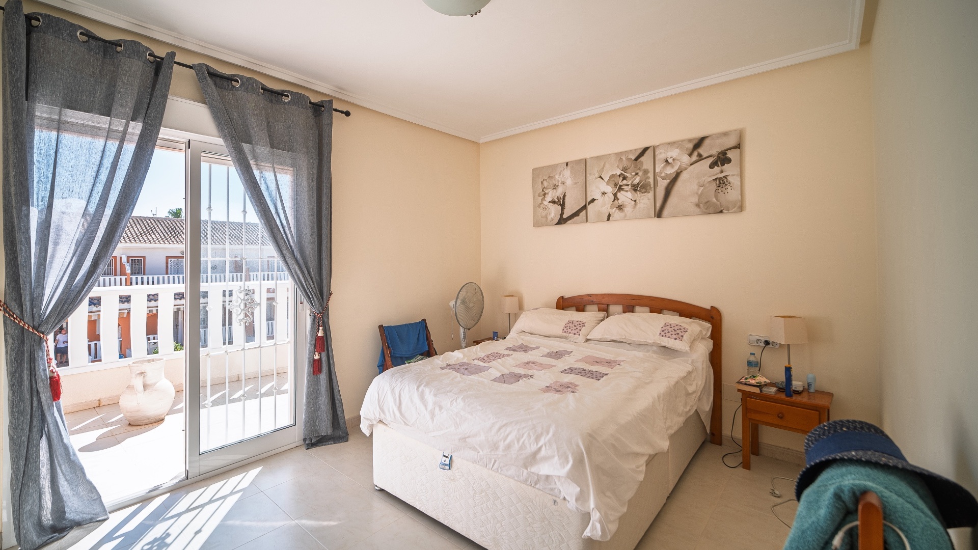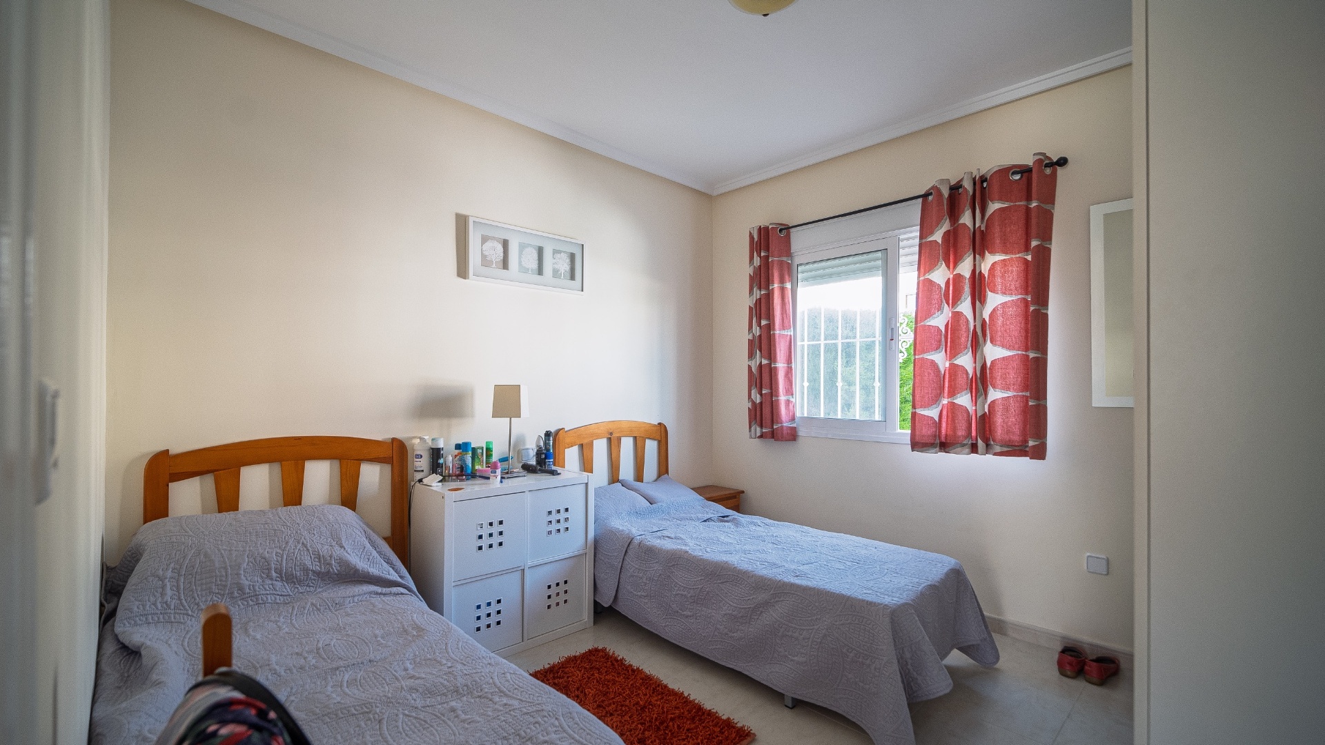 Detta välskötta radhus i Lola-stil med 3 sovrum erbjuder bekvämt boende i två våningar. Bottenvåningen har ett rymligt och ljust vardagsrum, ett gästrum, ett duschrum och ett helt separat kök. Fastigheten har en trädgård på framsidan med utsikt över det gemensamma poolområdet, perfekt för avkoppling eller underhållning, medan bakgården vetter mot vägen och ger extra utomhusutrymme. På övervåningen hittar du sovrummet med tillgång till en privat balkong, ett andra gästrum och ett familjebadrum. Detta vackra hem erbjuder en fantastisk kombination av utrymme, bekvämlighet och läge – perfekt som semesterboende, investering eller heltidsbostad.