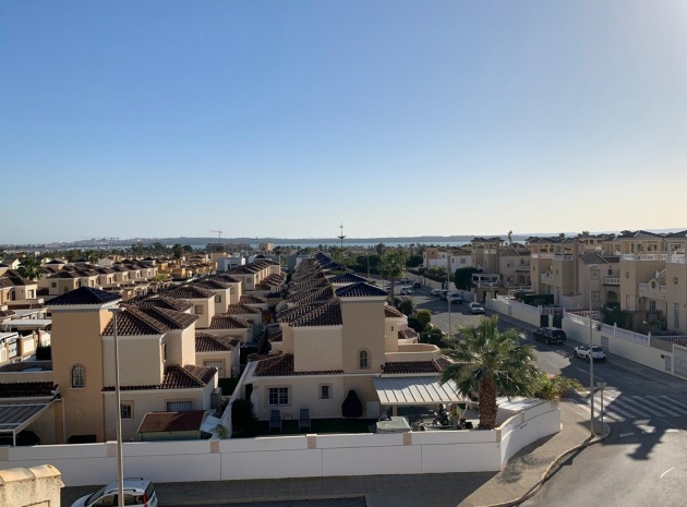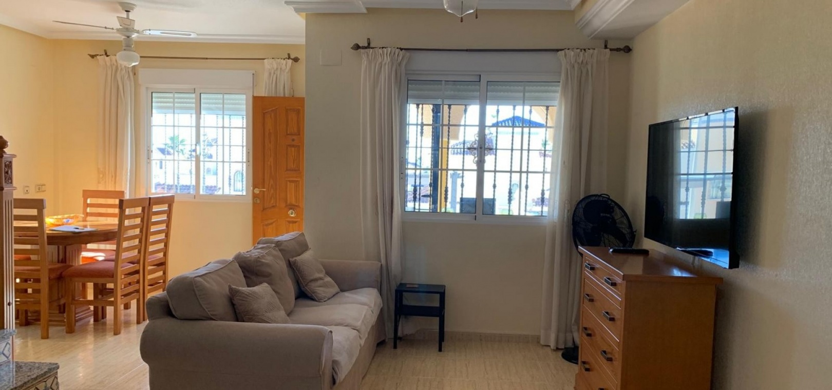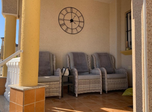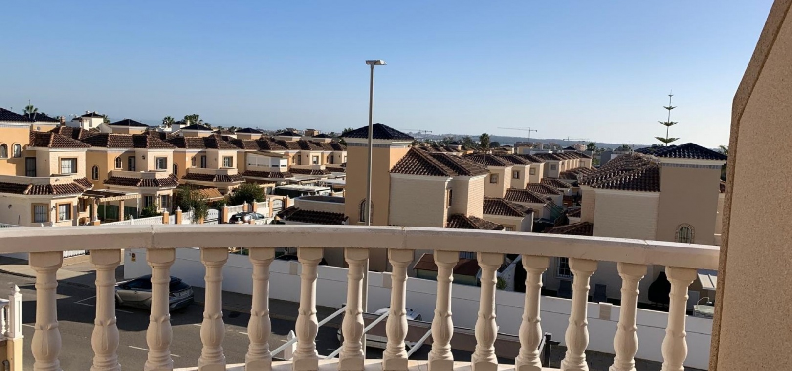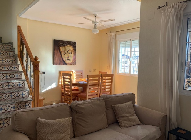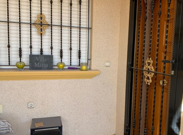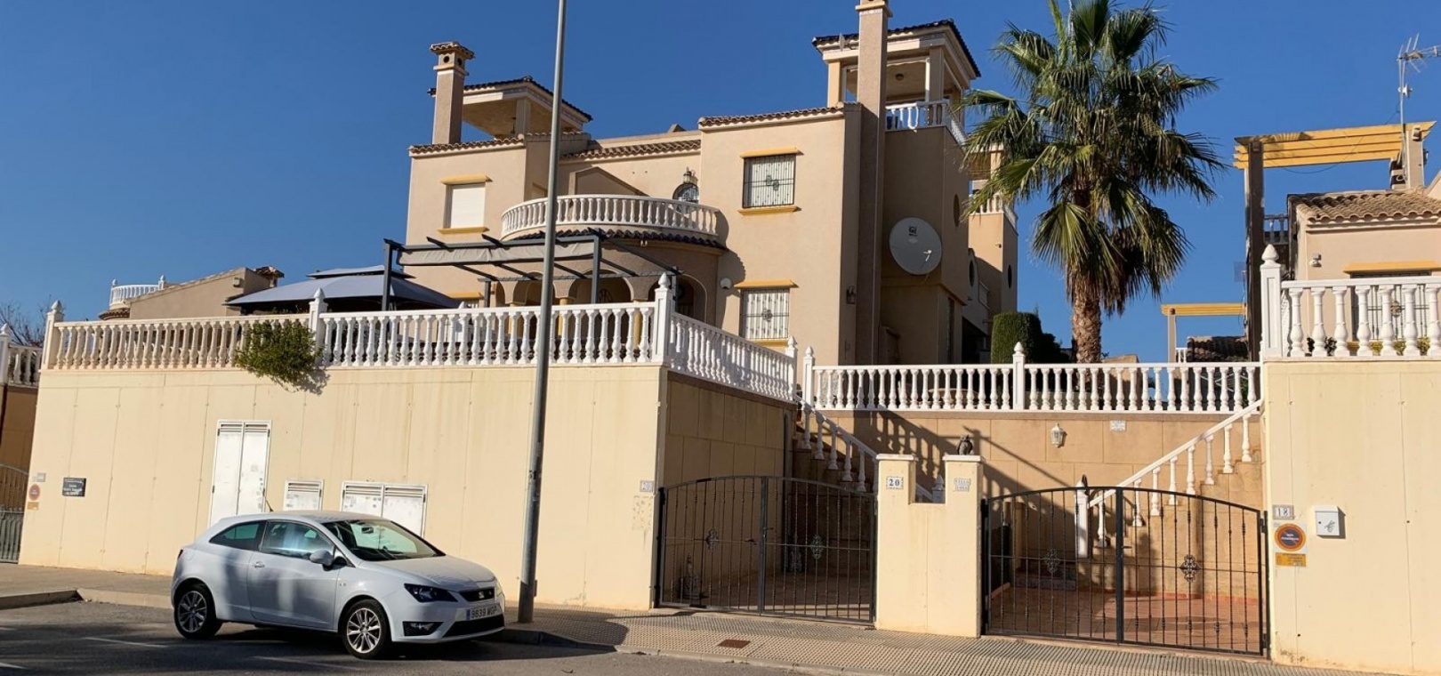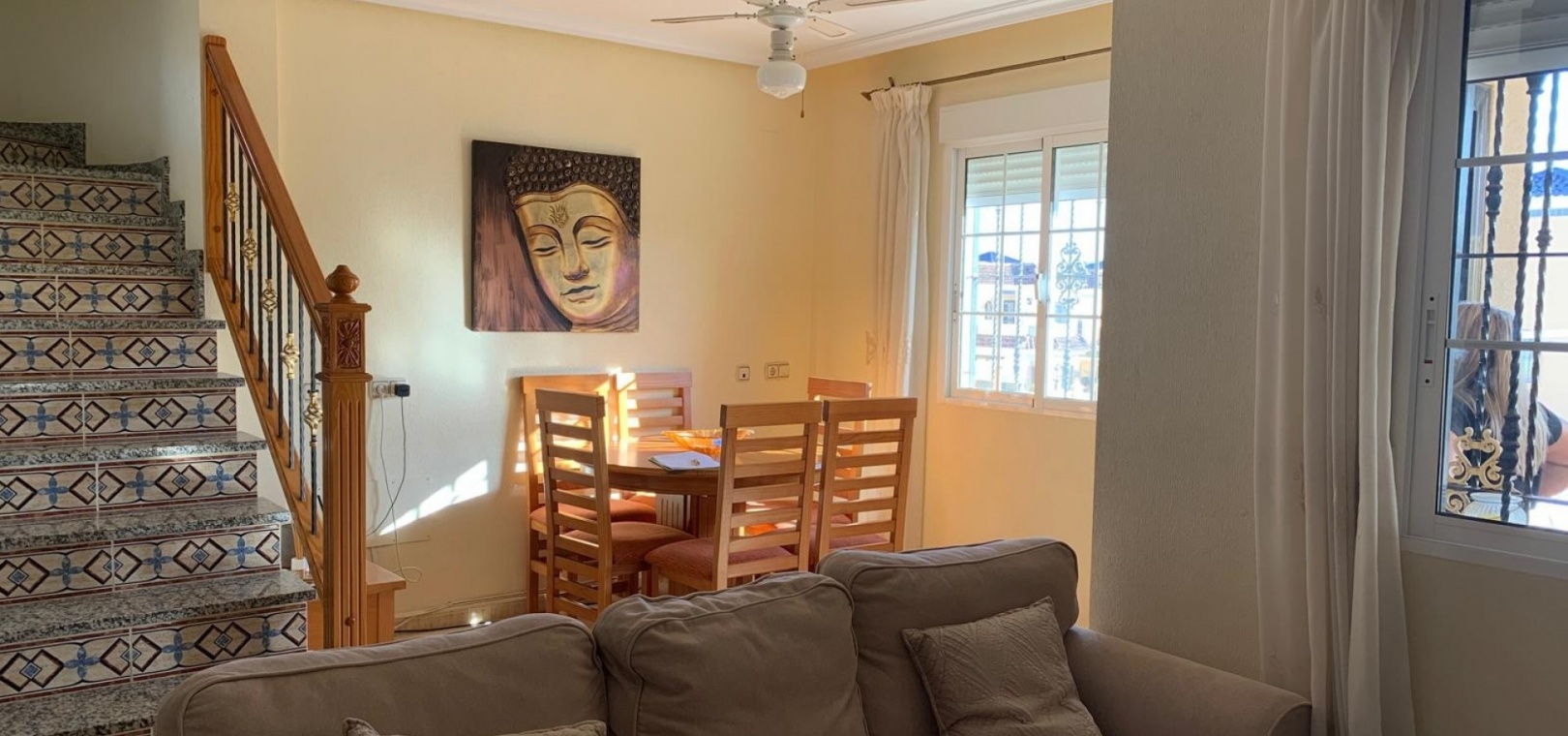 Ett exceptionellt fyrbäddshus i söderläge beläget på en upphöjd tomt med underbar utsikt över omgivningarna ner mot saltsjöarna och bortom. Detta är en mycket fint presenterad fastighet med 3 sovrum belägen på en stor tomt på ca 200 m2 med en stor kaklad terrass för avkoppling och solbad med olika sittgrupper, ett lusthus och förvaringsutrymme. Du kommer in i huset på ca 100 m2 via ett par trappsteg till en täckt terrass och leder in i den öppna planlösningen med matplats och vardagsrum badande i naturligt solljus med luftkonditionering och takfläktar, med ett rymligt fullt utrustat kök. På bottenvåningen finns också ett dubbelrum med inbyggd garderob, luftkonditionering och takfläkt, plus ett stort duschrum med tvättstuga. En elegant trappa leder till ytterligare 2 dubbelrum som båda har luftkonditionering, takfläktar och inbyggda garderober, ett med en privat terrass i söderläge med härlig utsikt och det finns ett stort badrum med badkar och takdusch. Från avsatsen hittar du tillgång till en ytterligare trappa med förråd, som leder till det enorma solariet, återigen med underbar utsikt ner mot sjön och ett specialbyggt lusthus med markiser på tre sidor vilket gör att området kan vara nästan helt inhägnat för de svalare kvällarna. Detta radhus i "Zodiaco"-stil säljs fullt möblerat till en hög standard med många extrafunktioner inklusive luftkonditionering i hela huset, takfläktar i alla rum, inbyggda garderober, väggmonterade värmeelement i badrummen, vitvaror och förvaringsutrymme, privat parkering utanför vägen och gott om gatuparkering, plus tillgång till den stora gemensamma poolen och solterrassen som ligger bara en kort promenad bort. Det har ett utmärkt läge, bara ett par minuters promenad till ett urval av restauranger och barer, ett apotek, en minimarknad och den lokala busslinjen till centrala Guardamar och dess fantastiska blåflaggade stränder.