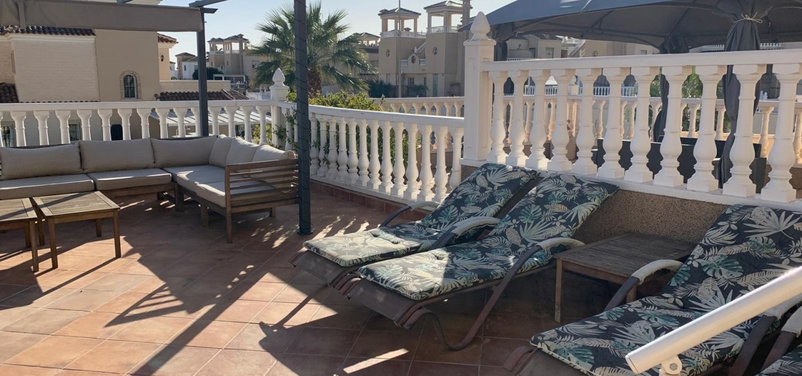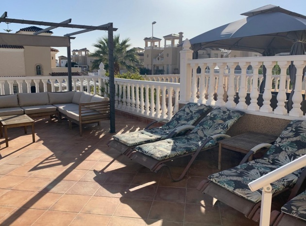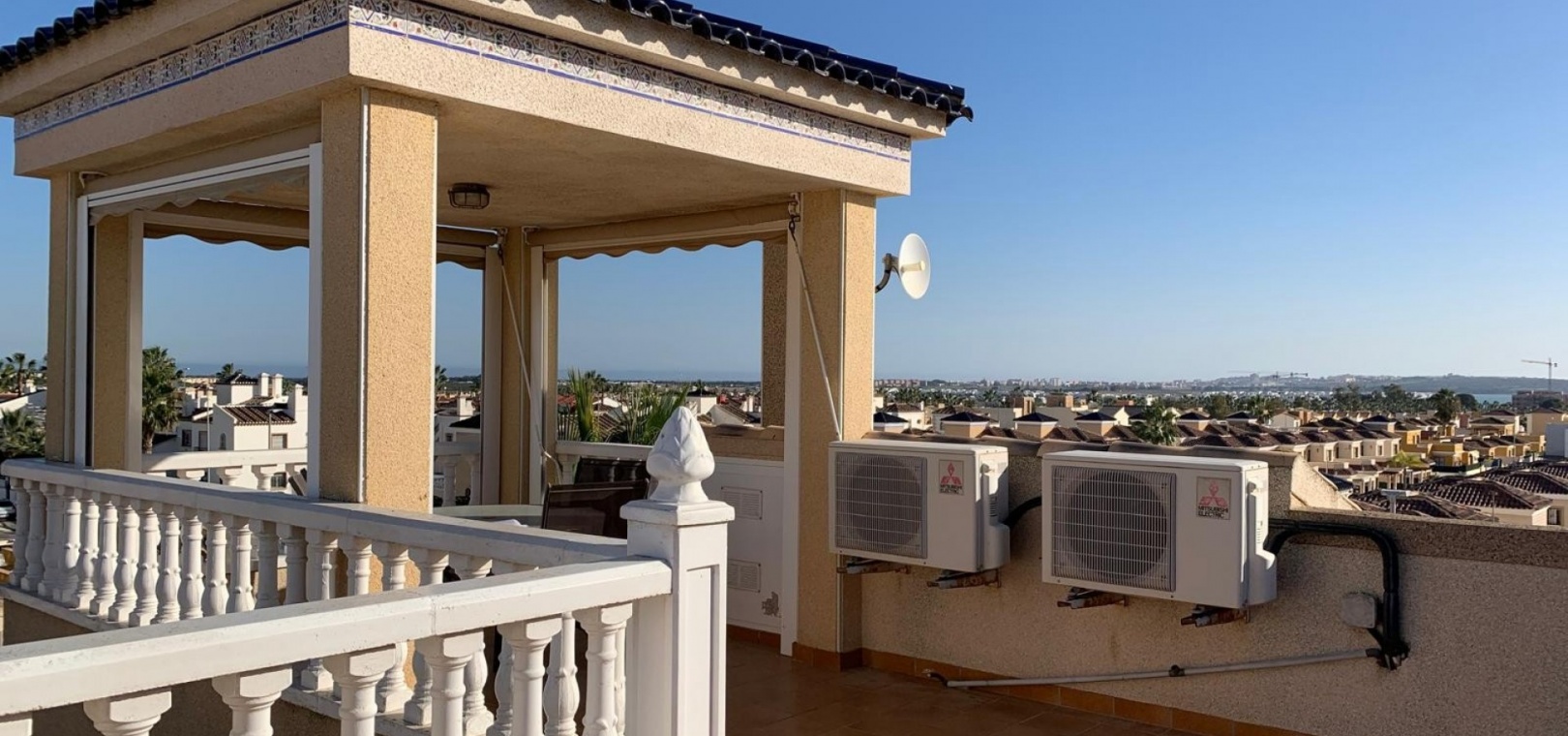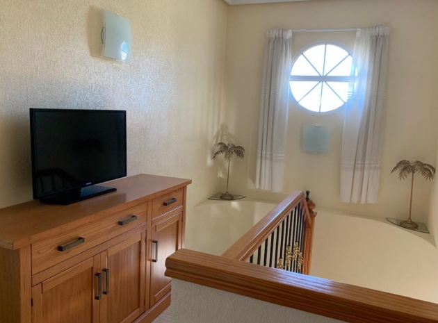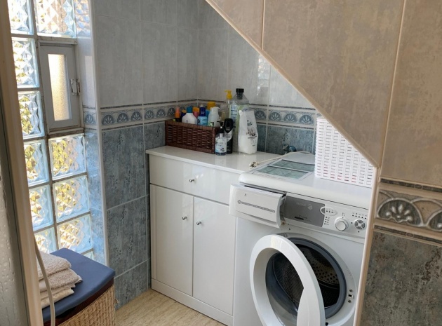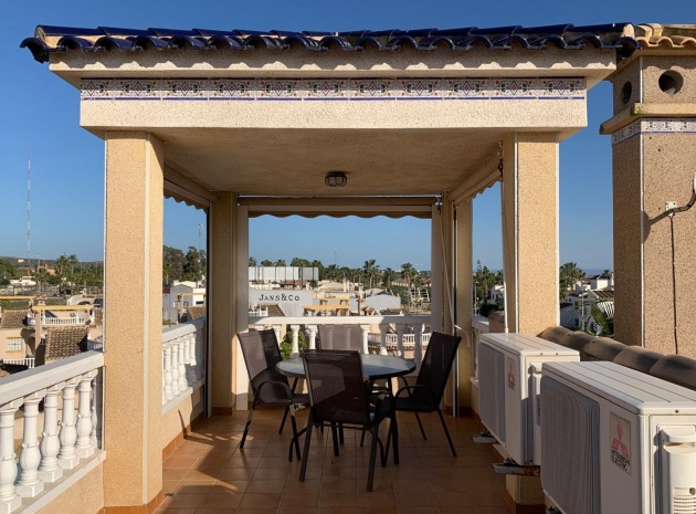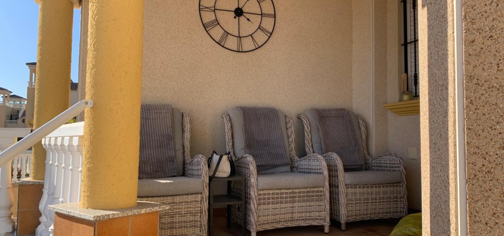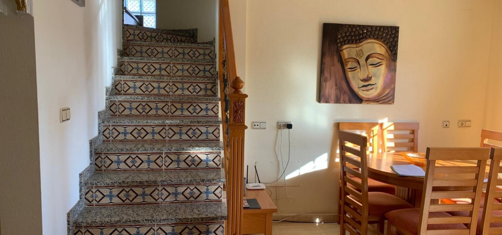 Ett exceptionellt fyrbäddshus i söderläge beläget på en upphöjd tomt med underbar utsikt över omgivningarna ner mot saltsjöarna och bortom. Detta är en mycket fint presenterad fastighet med 3 sovrum belägen på en stor tomt på ca 200 m2 med en stor kaklad terrass för avkoppling och solbad med olika sittgrupper, ett lusthus och förvaringsutrymme. Du kommer in i huset på ca 100 m2 via ett par trappsteg till en täckt terrass och leder in i den öppna planlösningen med matplats och vardagsrum badande i naturligt solljus med luftkonditionering och takfläktar, med ett rymligt fullt utrustat kök. På bottenvåningen finns också ett dubbelrum med inbyggd garderob, luftkonditionering och takfläkt, plus ett stort duschrum med tvättstuga. En elegant trappa leder till ytterligare 2 dubbelrum som båda har luftkonditionering, takfläktar och inbyggda garderober, ett med en privat terrass i söderläge med härlig utsikt och det finns ett stort badrum med badkar och takdusch. Från avsatsen hittar du tillgång till en ytterligare trappa med förråd, som leder till det enorma solariet, återigen med underbar utsikt ner mot sjön och ett specialbyggt lusthus med markiser på tre sidor vilket gör att området kan vara nästan helt inhägnat för de svalare kvällarna. Detta radhus i "Zodiaco"-stil säljs fullt möblerat till en hög standard med många extrafunktioner inklusive luftkonditionering i hela huset, takfläktar i alla rum, inbyggda garderober, väggmonterade värmeelement i badrummen, vitvaror och förvaringsutrymme, privat parkering utanför vägen och gott om gatuparkering, plus tillgång till den stora gemensamma poolen och solterrassen som ligger bara en kort promenad bort. Det har ett utmärkt läge, bara ett par minuters promenad till ett urval av restauranger och barer, ett apotek, en minimarknad och den lokala busslinjen till centrala Guardamar och dess fantastiska blåflaggade stränder.