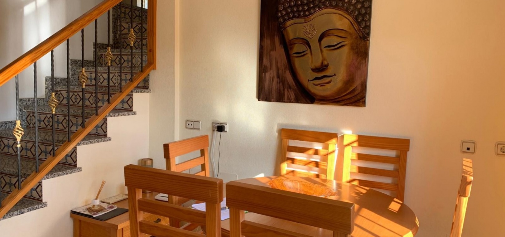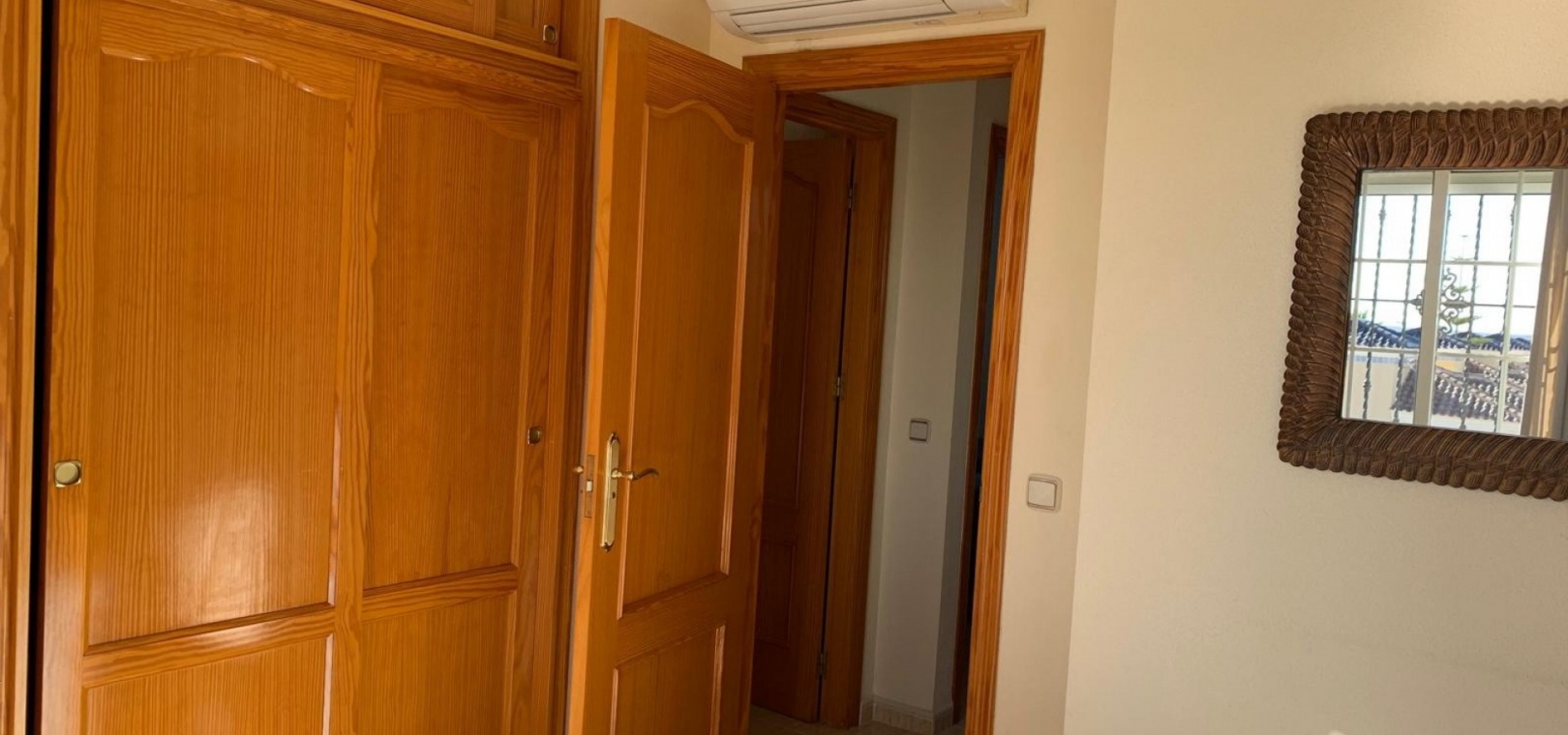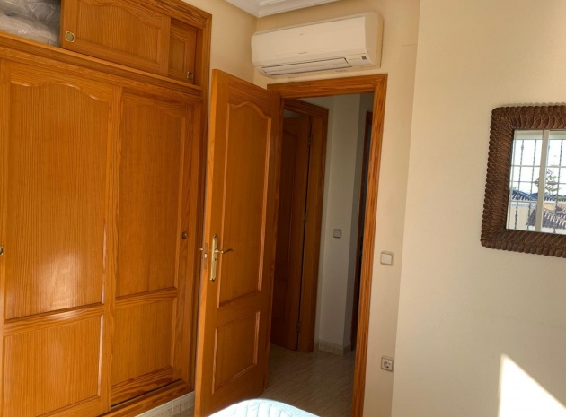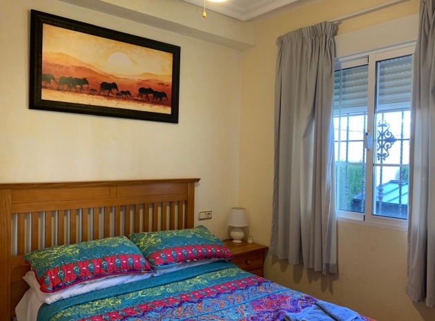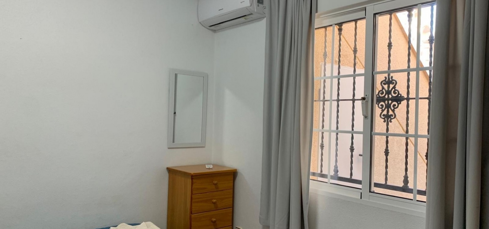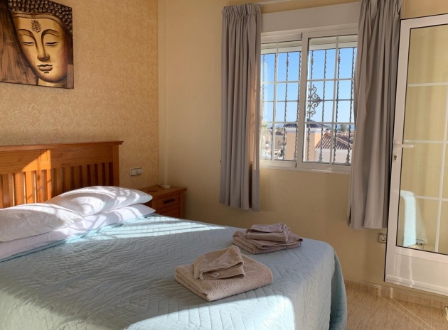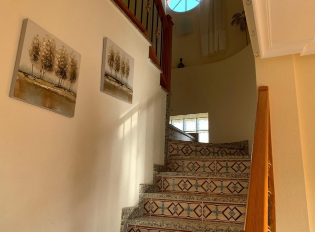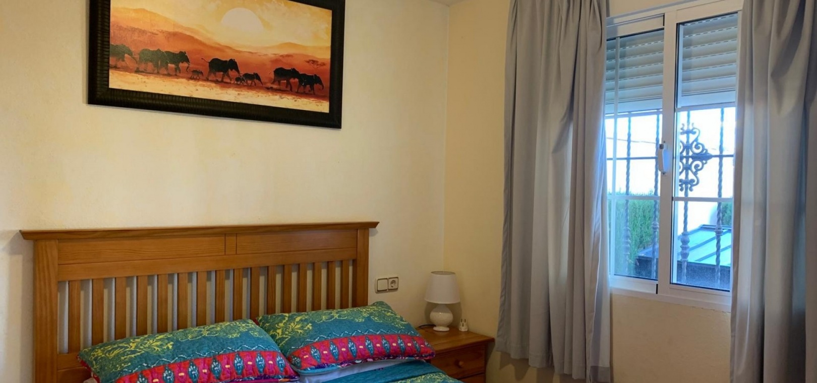 Ett exceptionellt fyrbäddshus i söderläge beläget på en upphöjd tomt med underbar utsikt över omgivningarna ner mot saltsjöarna och bortom. Detta är en mycket fint presenterad fastighet med 3 sovrum belägen på en stor tomt på ca 200 m2 med en stor kaklad terrass för avkoppling och solbad med olika sittgrupper, ett lusthus och förvaringsutrymme. Du kommer in i huset på ca 100 m2 via ett par trappsteg till en täckt terrass och leder in i den öppna planlösningen med matplats och vardagsrum badande i naturligt solljus med luftkonditionering och takfläktar, med ett rymligt fullt utrustat kök. På bottenvåningen finns också ett dubbelrum med inbyggd garderob, luftkonditionering och takfläkt, plus ett stort duschrum med tvättstuga. En elegant trappa leder till ytterligare 2 dubbelrum som båda har luftkonditionering, takfläktar och inbyggda garderober, ett med en privat terrass i söderläge med härlig utsikt och det finns ett stort badrum med badkar och takdusch. Från avsatsen hittar du tillgång till en ytterligare trappa med förråd, som leder till det enorma solariet, återigen med underbar utsikt ner mot sjön och ett specialbyggt lusthus med markiser på tre sidor vilket gör att området kan vara nästan helt inhägnat för de svalare kvällarna. Detta radhus i "Zodiaco"-stil säljs fullt möblerat till en hög standard med många extrafunktioner inklusive luftkonditionering i hela huset, takfläktar i alla rum, inbyggda garderober, väggmonterade värmeelement i badrummen, vitvaror och förvaringsutrymme, privat parkering utanför vägen och gott om gatuparkering, plus tillgång till den stora gemensamma poolen och solterrassen som ligger bara en kort promenad bort. Det har ett utmärkt läge, bara ett par minuters promenad till ett urval av restauranger och barer, ett apotek, en minimarknad och den lokala busslinjen till centrala Guardamar och dess fantastiska blåflaggade stränder.