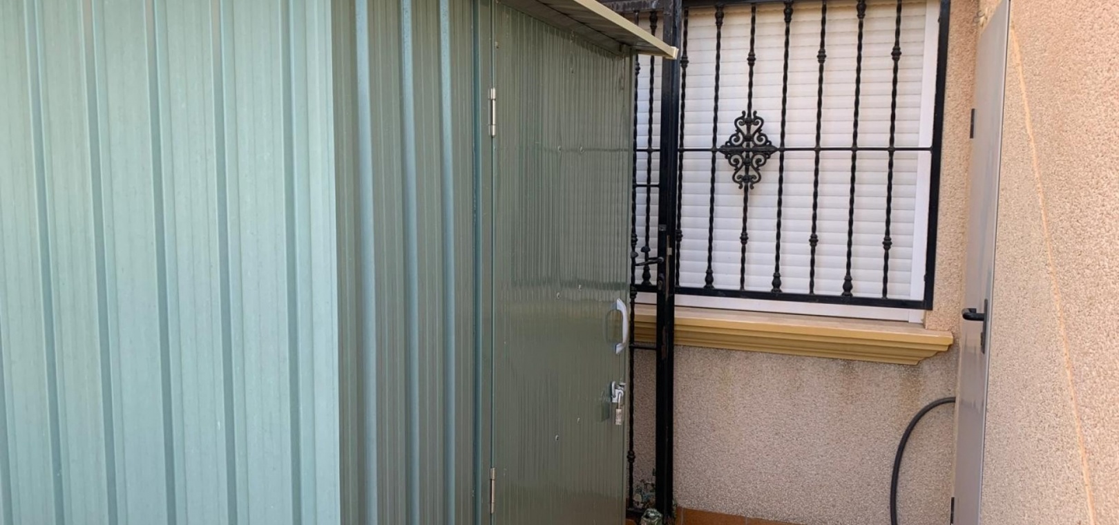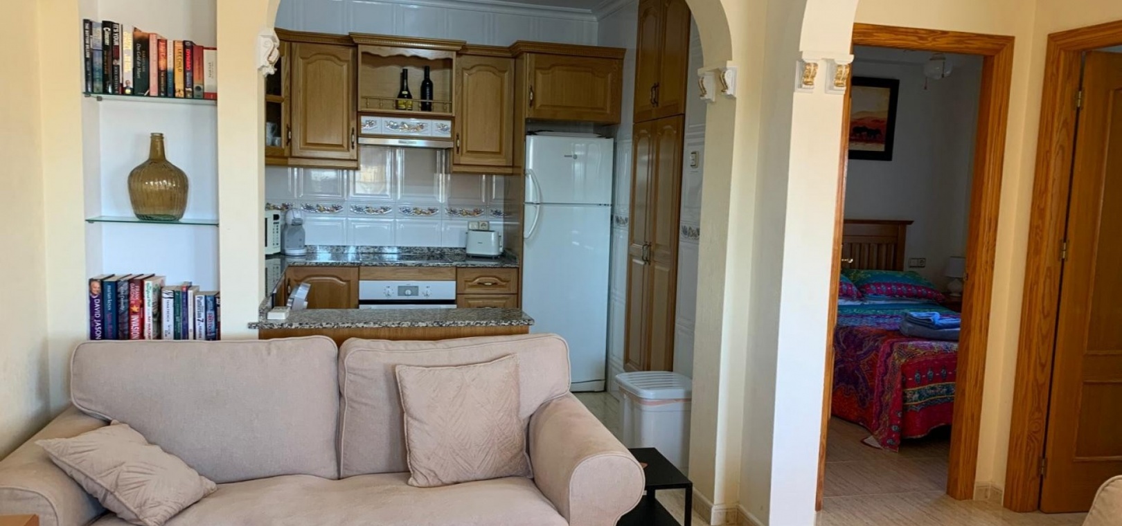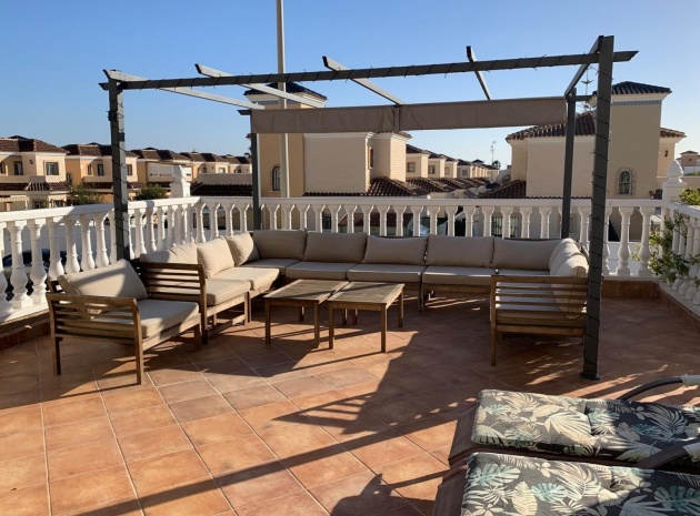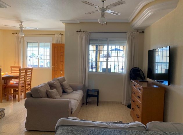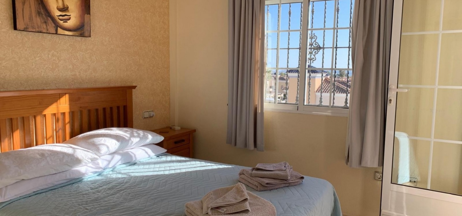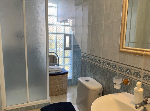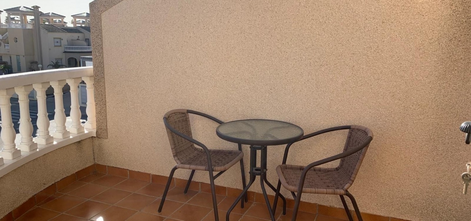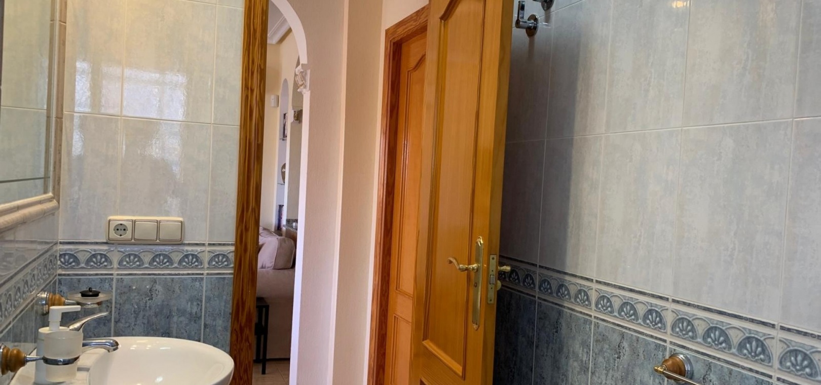 Ett exceptionellt fyrbäddshus i söderläge beläget på en upphöjd tomt med underbar utsikt över omgivningarna ner mot saltsjöarna och bortom. Detta är en mycket fint presenterad fastighet med 3 sovrum belägen på en stor tomt på ca 200 m2 med en stor kaklad terrass för avkoppling och solbad med olika sittgrupper, ett lusthus och förvaringsutrymme. Du kommer in i huset på ca 100 m2 via ett par trappsteg till en täckt terrass och leder in i den öppna planlösningen med matplats och vardagsrum badande i naturligt solljus med luftkonditionering och takfläktar, med ett rymligt fullt utrustat kök. På bottenvåningen finns också ett dubbelrum med inbyggd garderob, luftkonditionering och takfläkt, plus ett stort duschrum med tvättstuga. En elegant trappa leder till ytterligare 2 dubbelrum som båda har luftkonditionering, takfläktar och inbyggda garderober, ett med en privat terrass i söderläge med härlig utsikt och det finns ett stort badrum med badkar och takdusch. Från avsatsen hittar du tillgång till en ytterligare trappa med förråd, som leder till det enorma solariet, återigen med underbar utsikt ner mot sjön och ett specialbyggt lusthus med markiser på tre sidor vilket gör att området kan vara nästan helt inhägnat för de svalare kvällarna. Detta radhus i "Zodiaco"-stil säljs fullt möblerat till en hög standard med många extrafunktioner inklusive luftkonditionering i hela huset, takfläktar i alla rum, inbyggda garderober, väggmonterade värmeelement i badrummen, vitvaror och förvaringsutrymme, privat parkering utanför vägen och gott om gatuparkering, plus tillgång till den stora gemensamma poolen och solterrassen som ligger bara en kort promenad bort. Det har ett utmärkt läge, bara ett par minuters promenad till ett urval av restauranger och barer, ett apotek, en minimarknad och den lokala busslinjen till centrala Guardamar och dess fantastiska blåflaggade stränder.