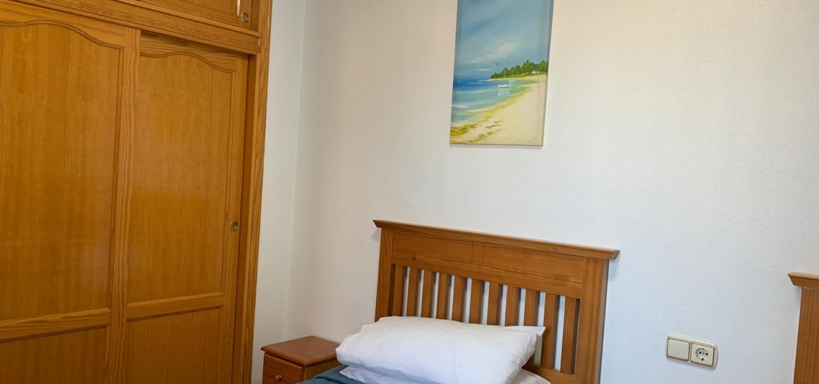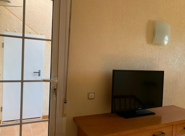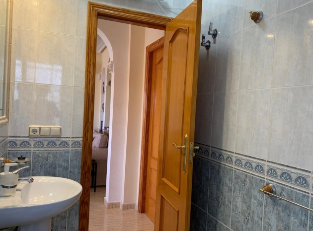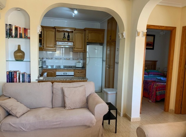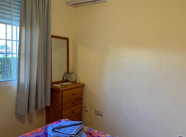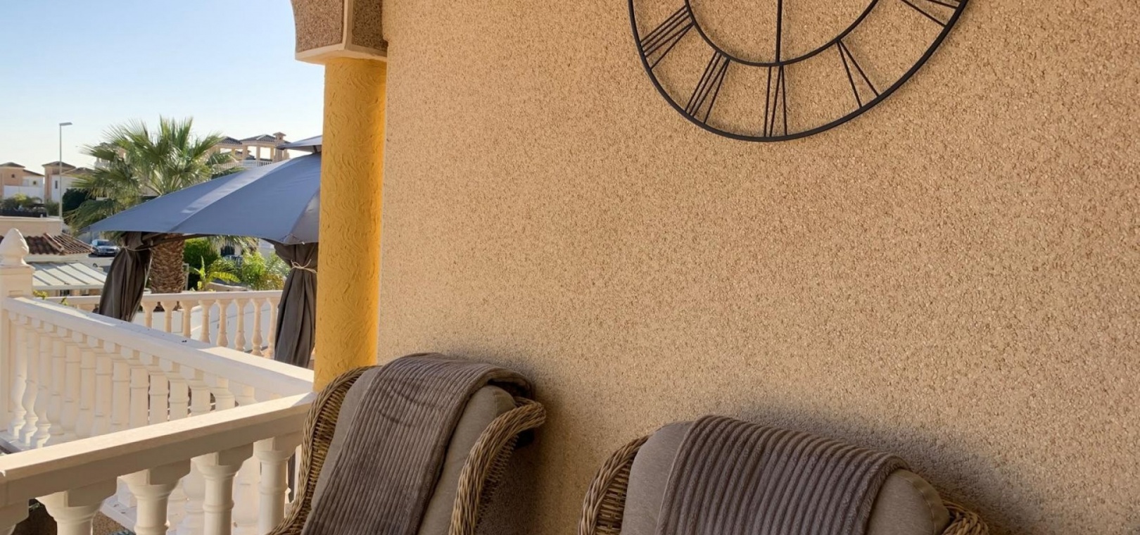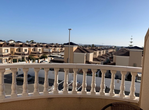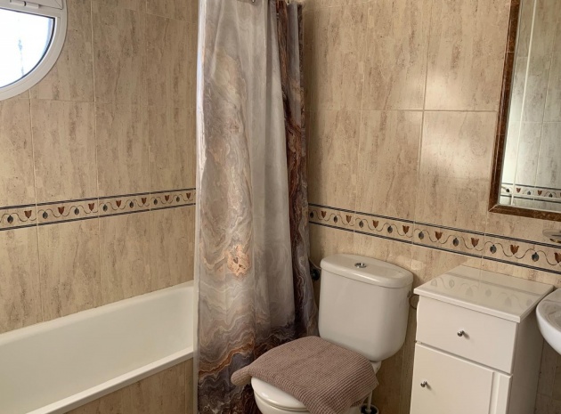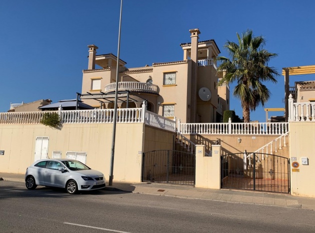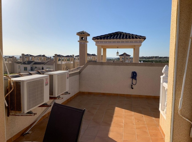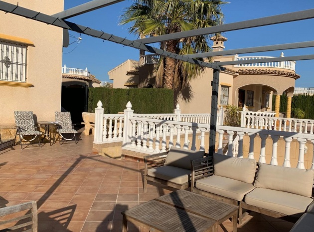 Ett exceptionellt fyrbäddshus i söderläge beläget på en upphöjd tomt med underbar utsikt över omgivningarna ner mot saltsjöarna och bortom. Detta är en mycket fint presenterad fastighet med 3 sovrum belägen på en stor tomt på ca 200 m2 med en stor kaklad terrass för avkoppling och solbad med olika sittgrupper, ett lusthus och förvaringsutrymme. Du kommer in i huset på ca 100 m2 via ett par trappsteg till en täckt terrass och leder in i den öppna planlösningen med matplats och vardagsrum badande i naturligt solljus med luftkonditionering och takfläktar, med ett rymligt fullt utrustat kök. På bottenvåningen finns också ett dubbelrum med inbyggd garderob, luftkonditionering och takfläkt, plus ett stort duschrum med tvättstuga. En elegant trappa leder till ytterligare 2 dubbelrum som båda har luftkonditionering, takfläktar och inbyggda garderober, ett med en privat terrass i söderläge med härlig utsikt och det finns ett stort badrum med badkar och takdusch. Från avsatsen hittar du tillgång till en ytterligare trappa med förråd, som leder till det enorma solariet, återigen med underbar utsikt ner mot sjön och ett specialbyggt lusthus med markiser på tre sidor vilket gör att området kan vara nästan helt inhägnat för de svalare kvällarna. Detta radhus i "Zodiaco"-stil säljs fullt möblerat till en hög standard med många extrafunktioner inklusive luftkonditionering i hela huset, takfläktar i alla rum, inbyggda garderober, väggmonterade värmeelement i badrummen, vitvaror och förvaringsutrymme, privat parkering utanför vägen och gott om gatuparkering, plus tillgång till den stora gemensamma poolen och solterrassen som ligger bara en kort promenad bort. Det har ett utmärkt läge, bara ett par minuters promenad till ett urval av restauranger och barer, ett apotek, en minimarknad och den lokala busslinjen till centrala Guardamar och dess fantastiska blåflaggade stränder.