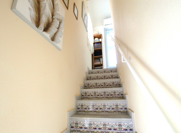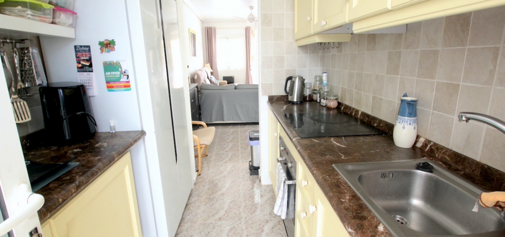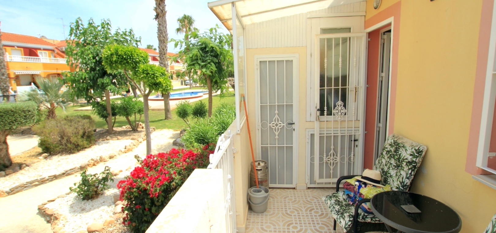 På bottenvåningen hittar du ett rymligt vardagsrum/matsal med luftkonditionering, en praktisk garderob med toalett och handfat, ett sovrum med dubbelsäng och ett väl tilltaget kök med gott om förvaring och arbetsyta. Garderoben på denna våning erbjuder möjligheten att omvandlas till ett komplett duschrum, något som några av grannarna har gjort.