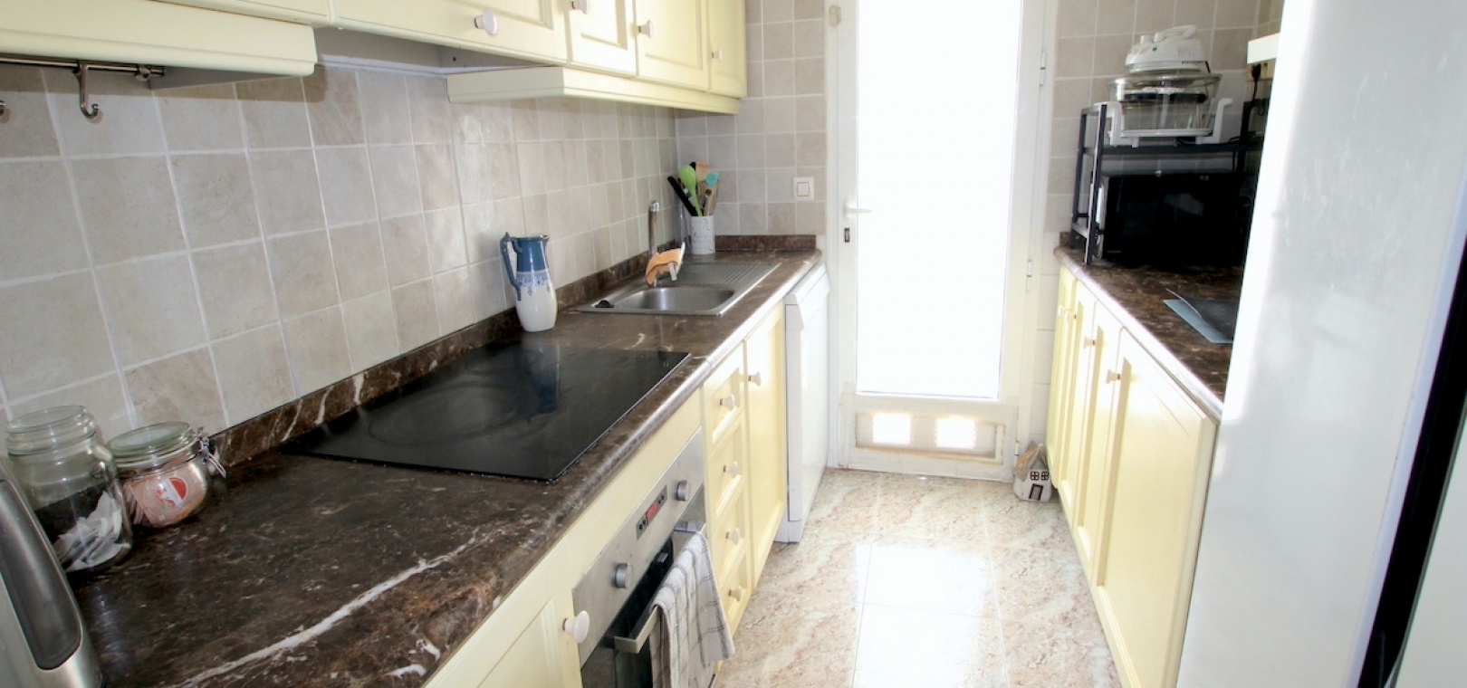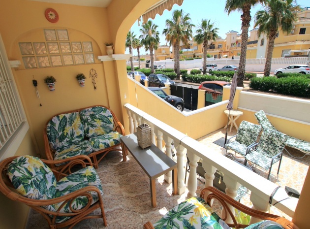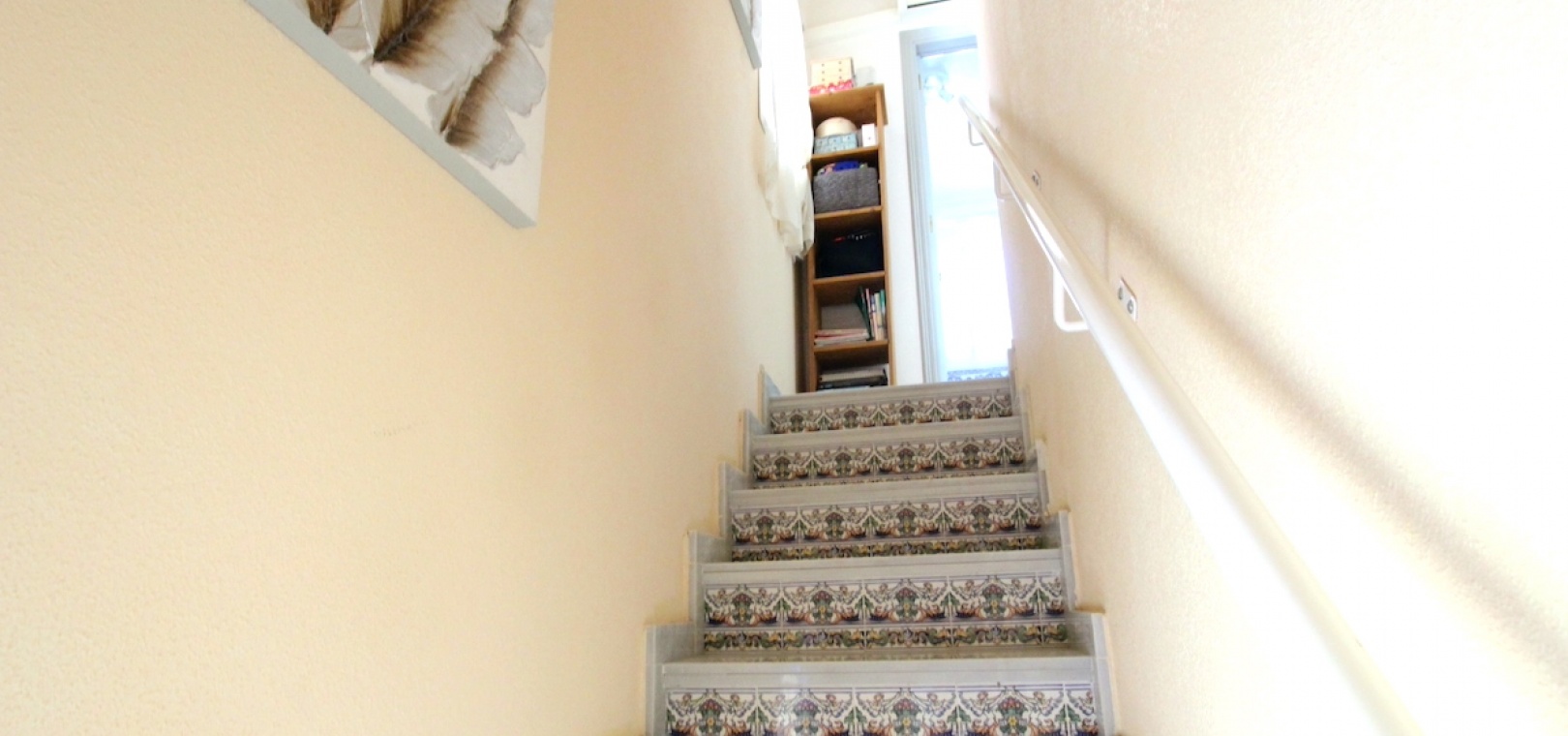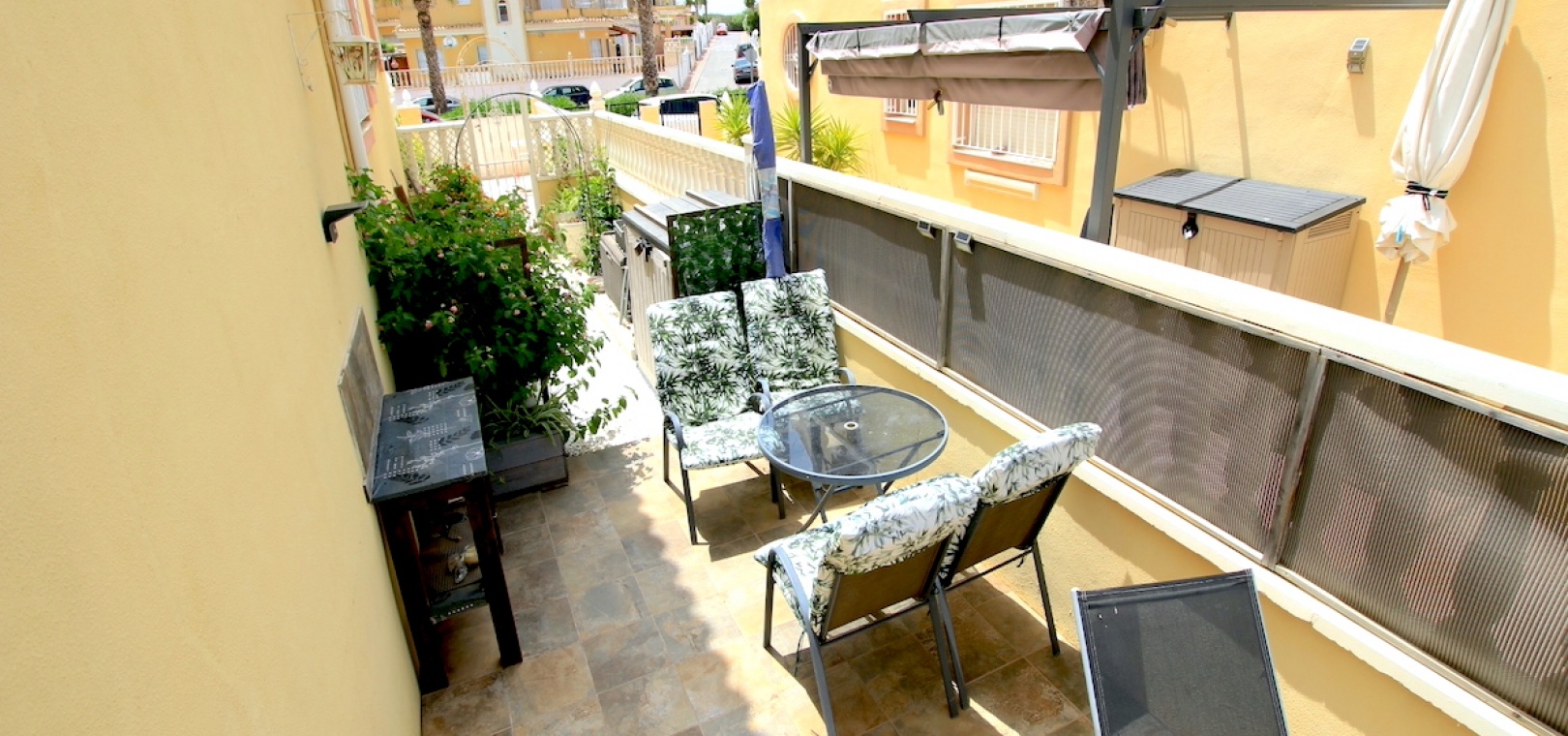 På bottenvåningen hittar du ett rymligt vardagsrum/matsal med luftkonditionering, en praktisk garderob med toalett och handfat, ett sovrum med dubbelsäng och ett väl tilltaget kök med gott om förvaring och arbetsyta. Garderoben på denna våning erbjuder möjligheten att omvandlas till ett komplett duschrum, något som några av grannarna har gjort.