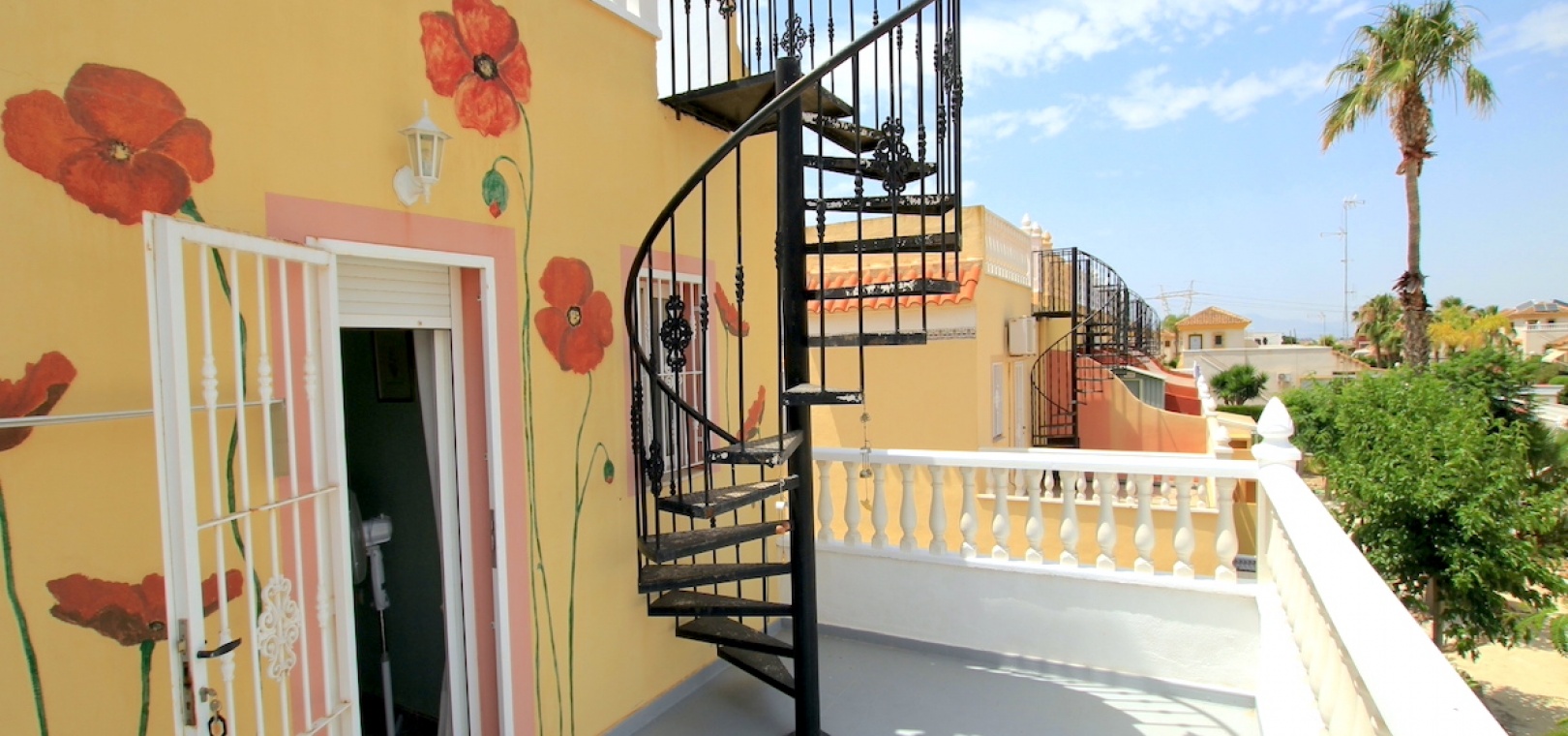 Terrassen som är ansluten till gästrummet har en utvändig trappa som leder upp till ett soldränkt privat solarium, med fantastisk utsikt över de noggrant underhållna gemensamma trädgårdarna och en av poolerna.