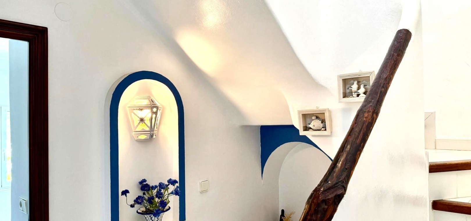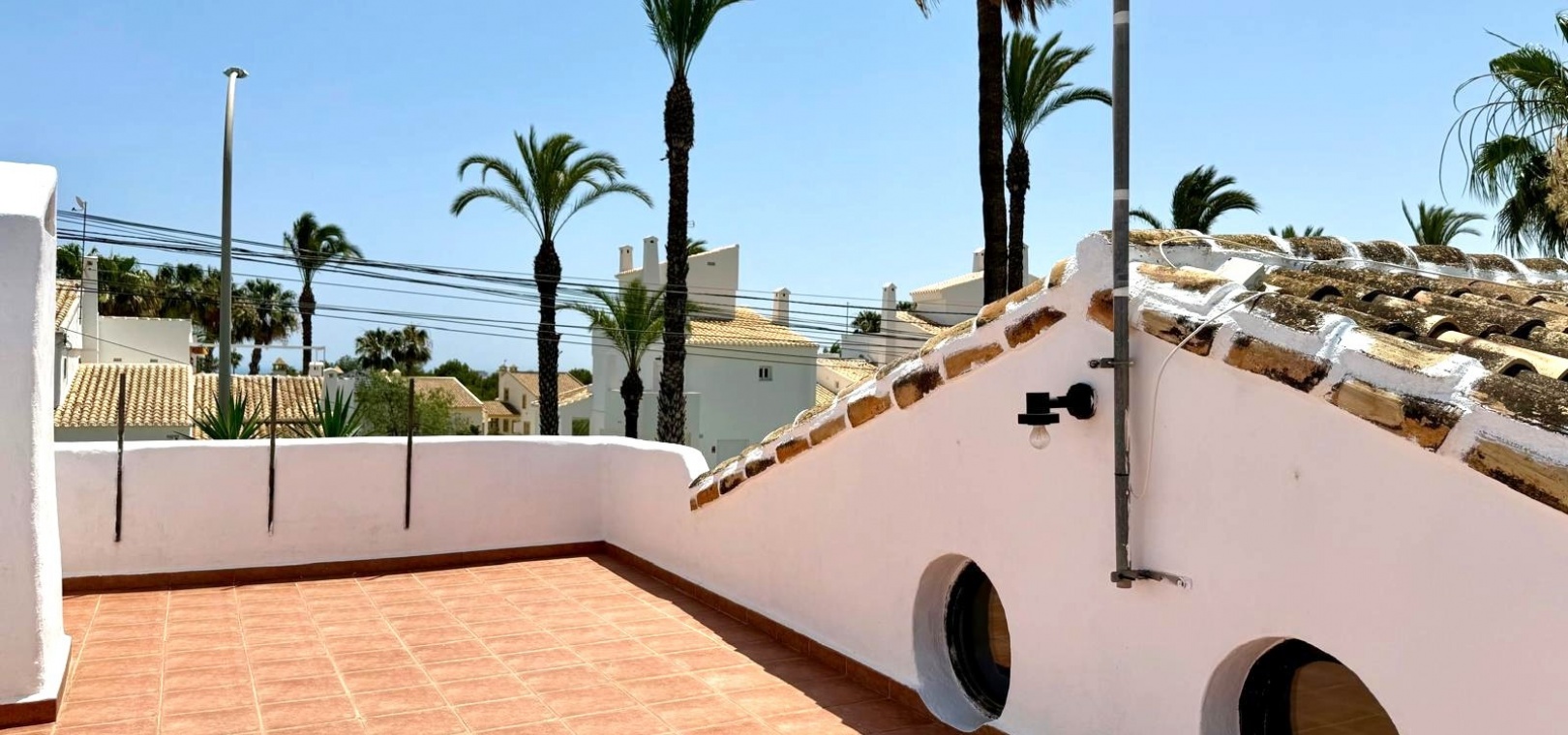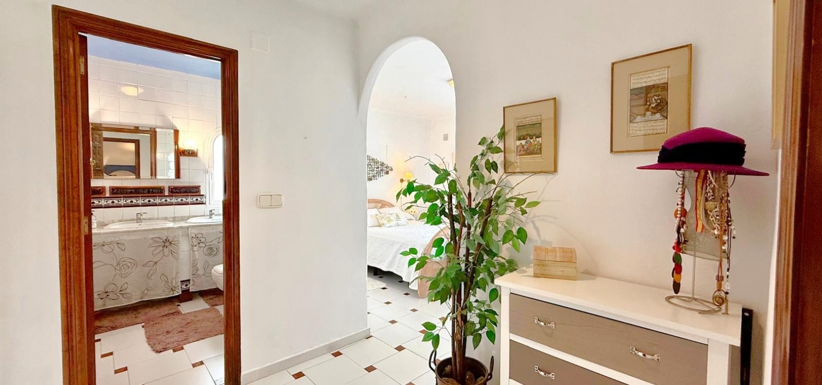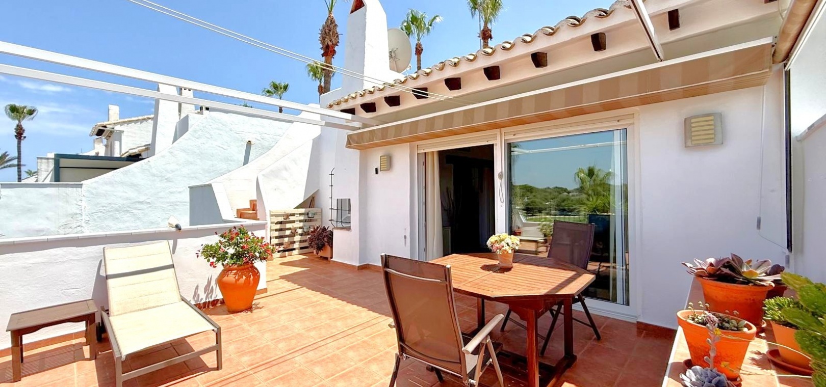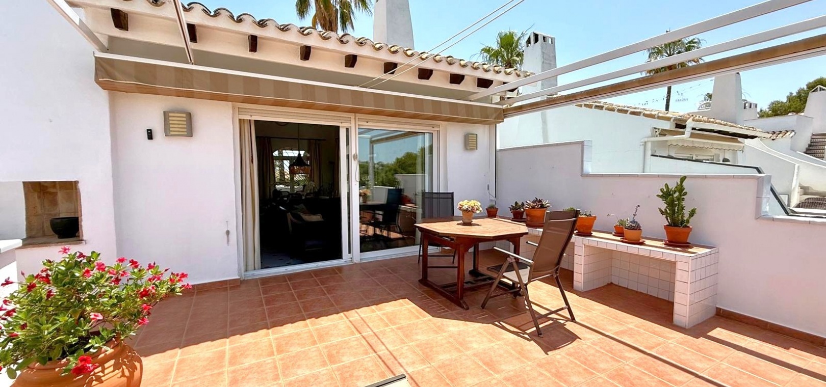 Charmiga bostadsutrymmen På entréplan välkomnar en delvis täckt terrass dig till ett rymligt vardagsrum och matsal med öppen planlösning, komplett med ett barkök, tvättstuga och gästtoalett. Vardagsrummet är perfekt för underhållning och har direkt tillgång till en fantastisk terrass på 35 m² med inbyggd grill, praktiskt förråd och tillgång till en liten takterrass – perfekt för att njuta av medelhavssolen.