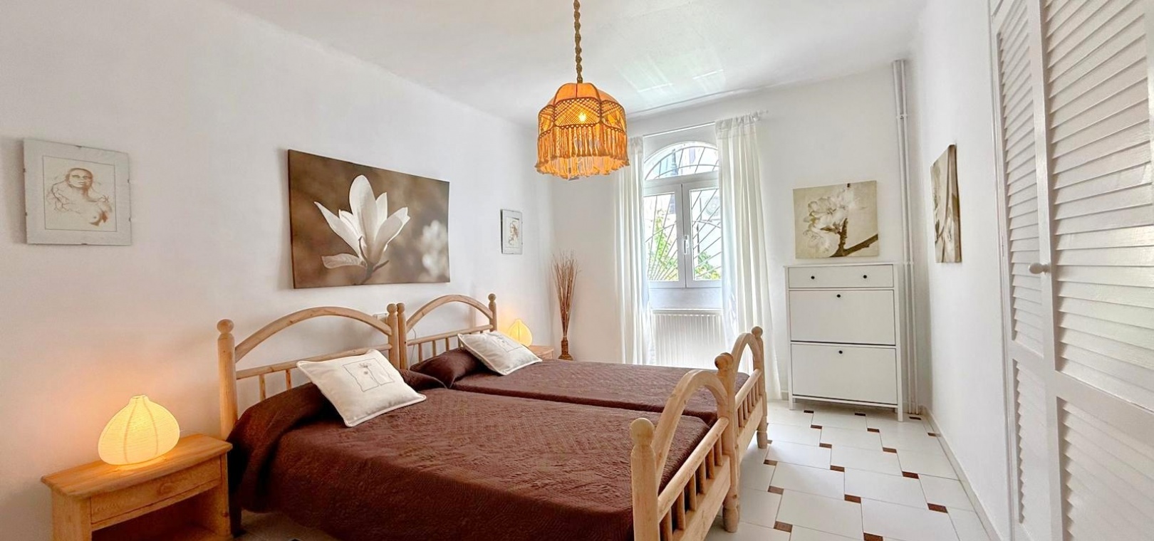 Bekväma sovrum och avskildhet På nedre våningen finns tre generöst tilltagna dubbelrum , alla med inbyggda garderober. Det stora sovrummet har en egen balkong och ett modernt badrum , vilket erbjuder en lugn tillflyktsort i hemmet.