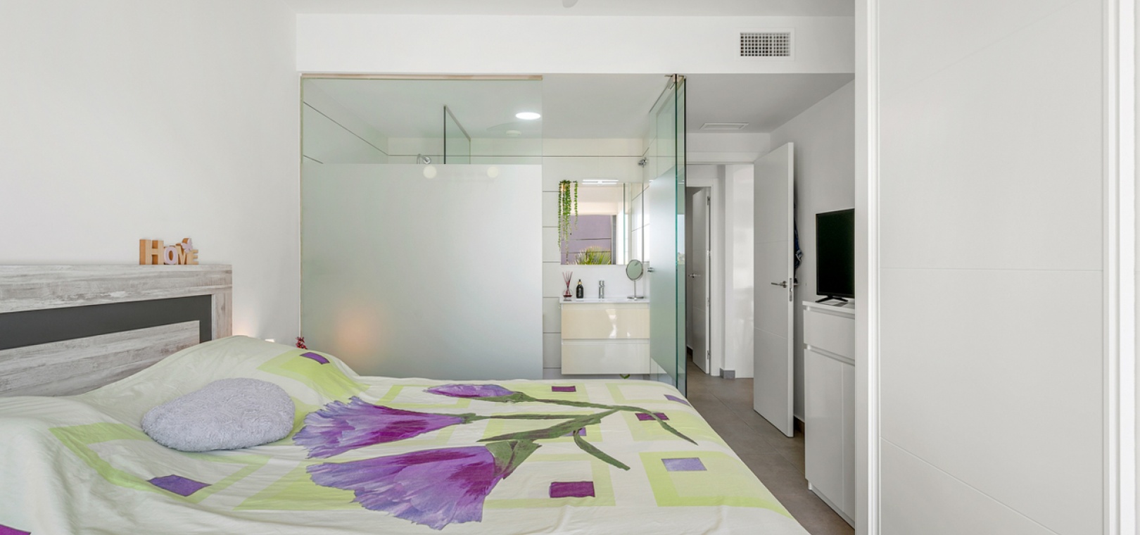 En rymlig och ljus loungedel Öppen planlösning kök och matplats Två sovrum , båda med inbyggda garderober Huvudsovrum med eget badrum Gästsovrum med tillgång till ett andra badrum med duschkabin Luftkonditionering (varm/kall) och elektriska jalusier i hela huset. Privat terrass i söderläge , perfekt för sol hela dagen