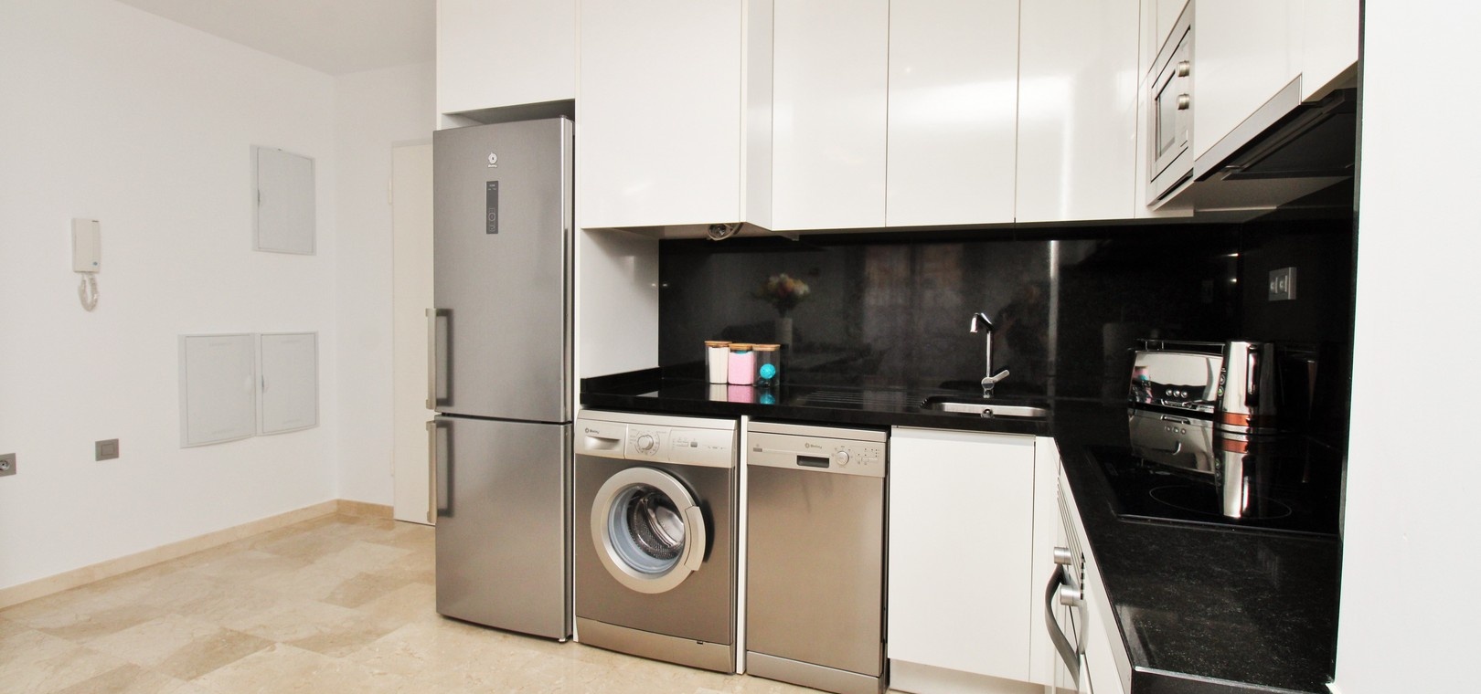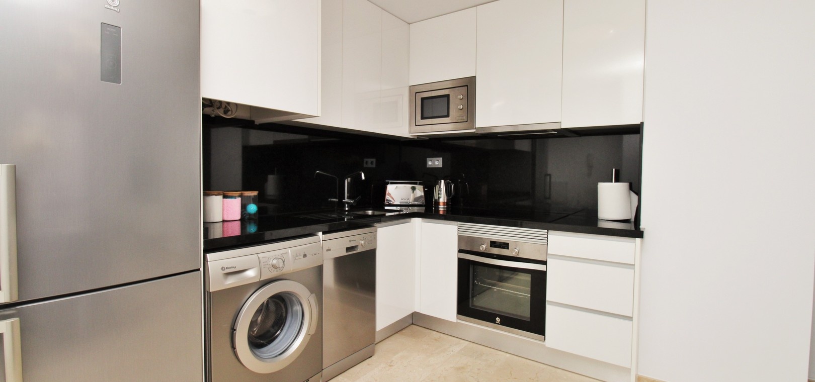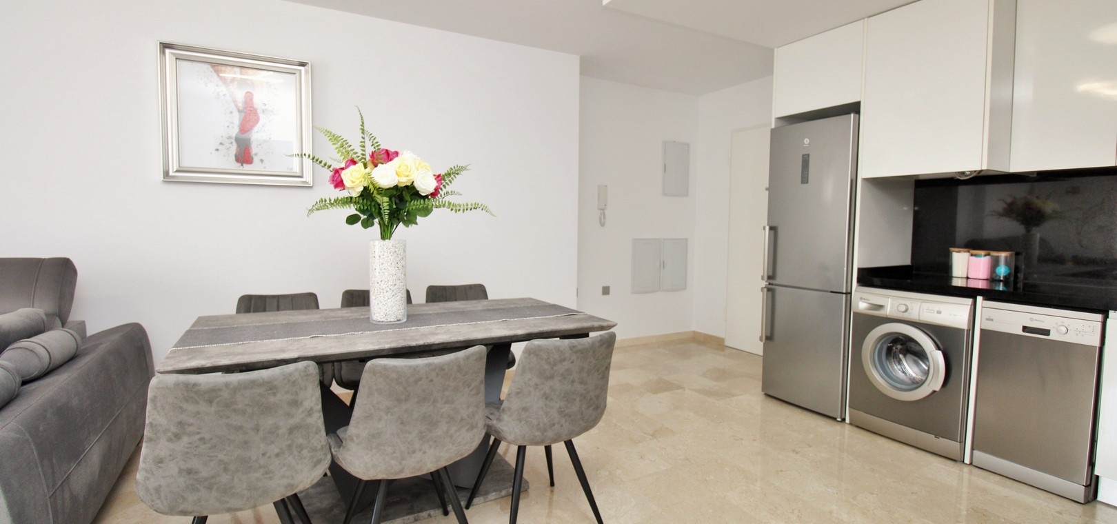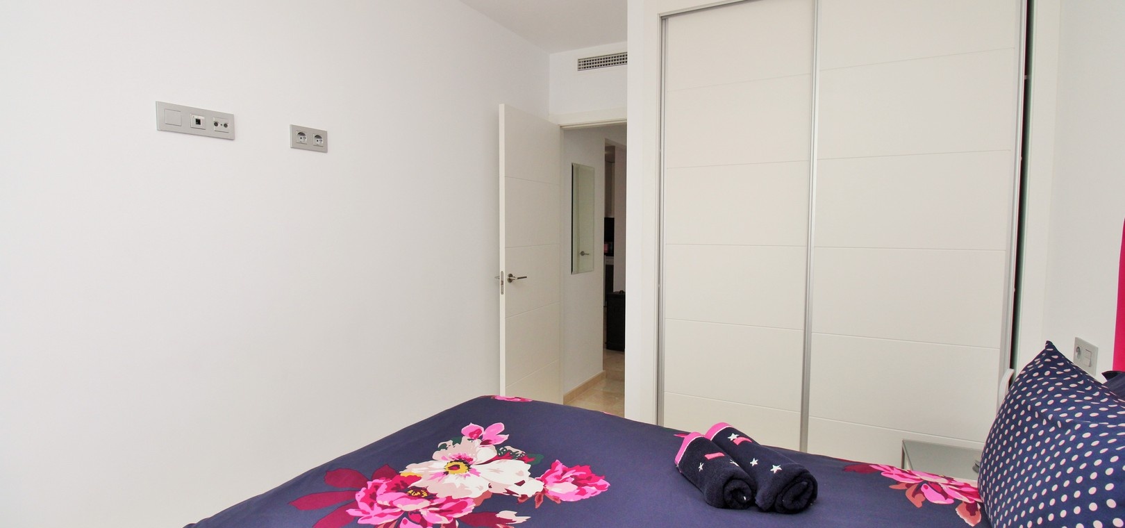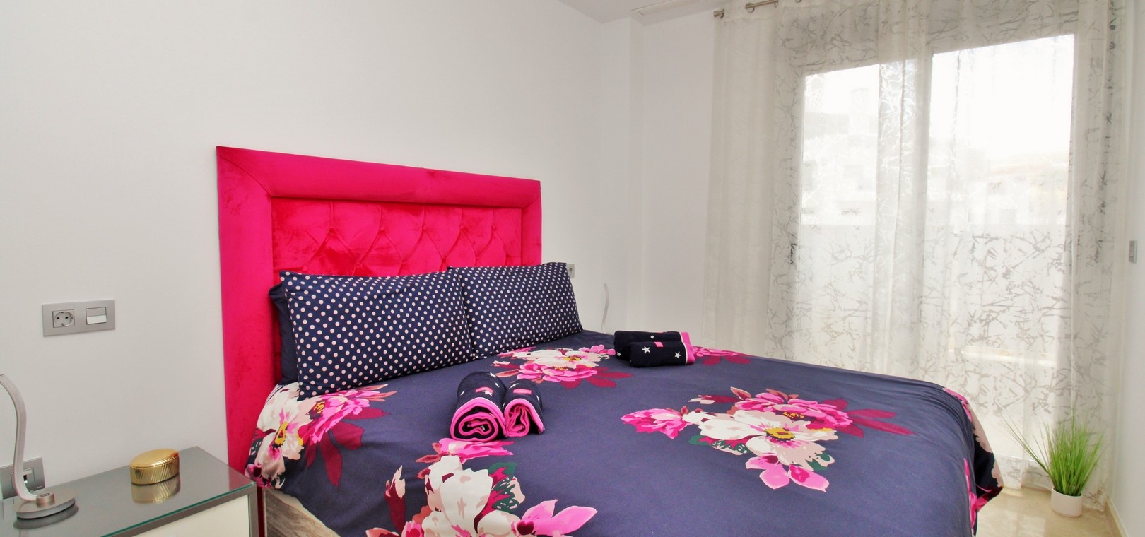 Två rymliga sovrum med inbyggda garderober Snyggt familjebadrum med duschkabin Ljust vardagsrum och matplats med öppen planlösning Fullt utrustat modernt kök Privat balkong med utsikt över poolen, nås från sovrummet Andra sovrummet med fransk balkong Kanaliserad luftkonditionering i hela huset Erbjuds fullt möblerad till hög standard Inkluderar underjordisk parkeringsplats