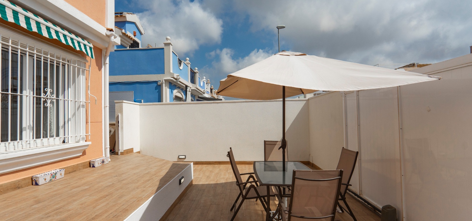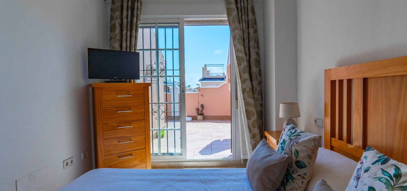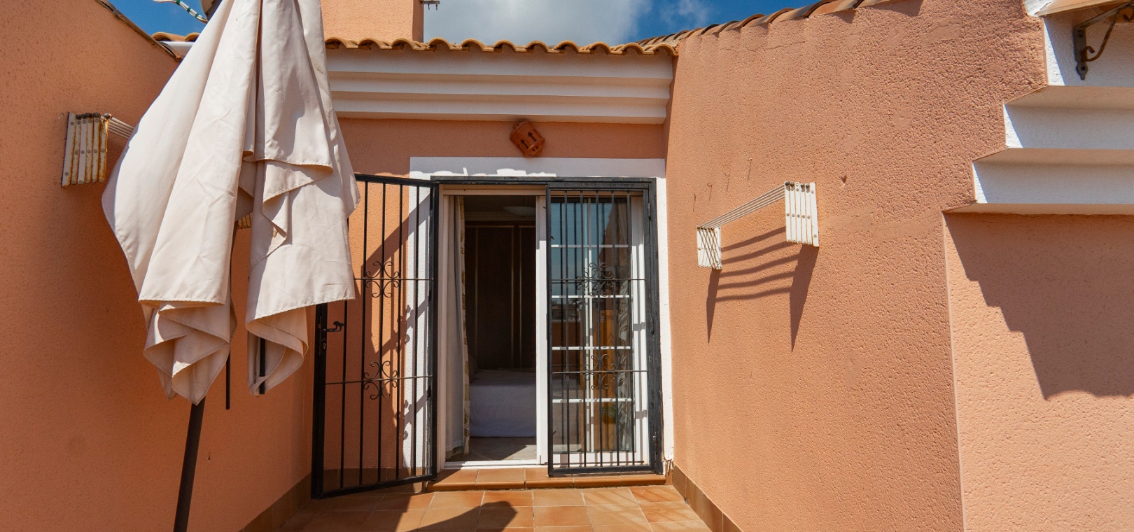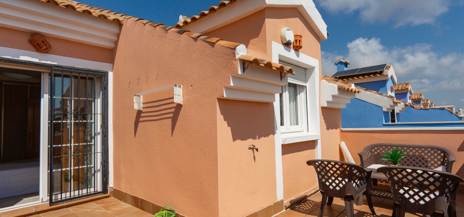 På övervåningen har sovrummet utgång till en stor privat terrass – perfekt för att sola eller njuta av varma medelhavskvällar. Ett andra rymligt dubbelrum med inbyggda garderober och luftkonditionering, plus ett familjebadrum med badkar och dusch, kompletterar denna våning.
